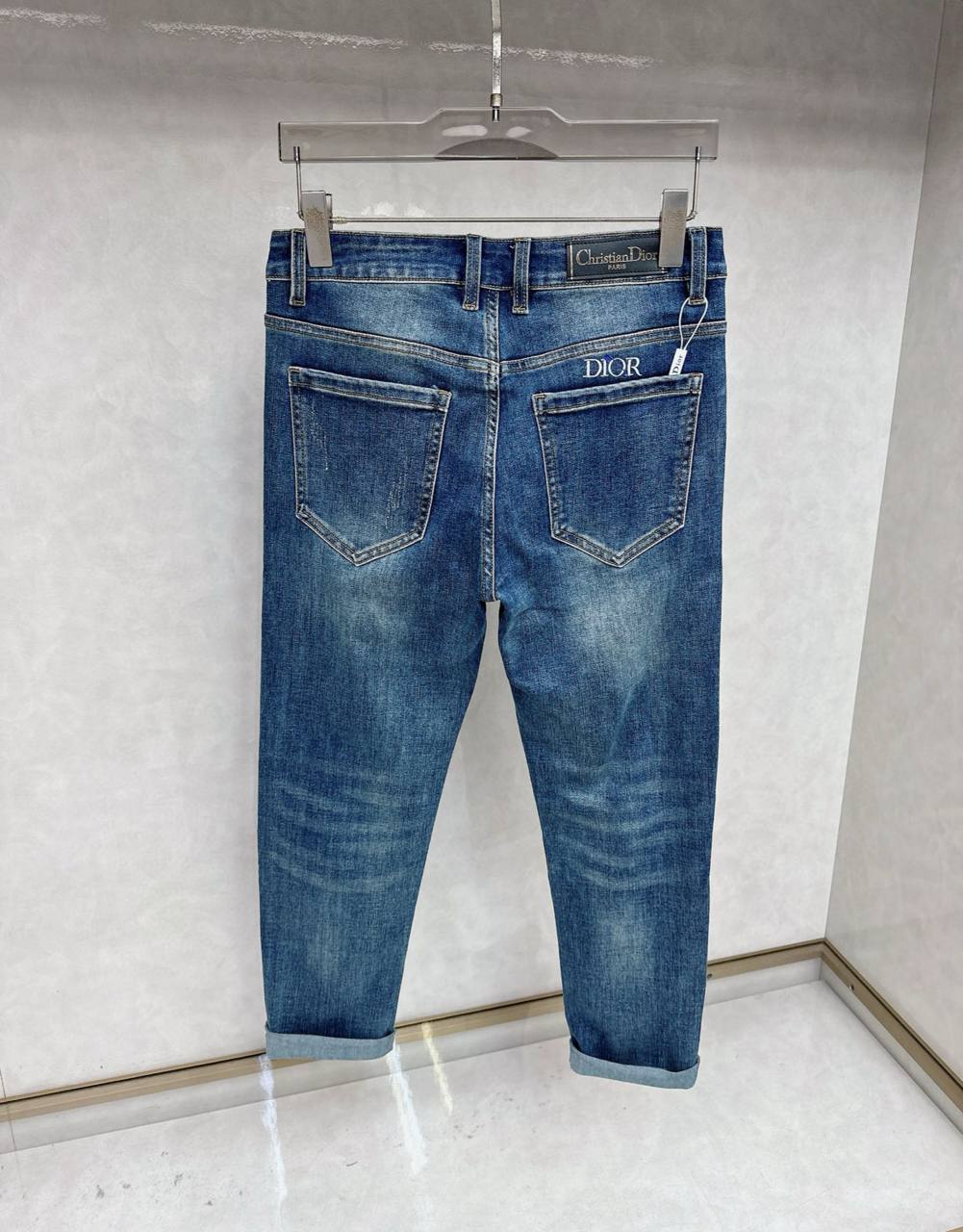 Джинсы выполнены в классическом крое «пять карманов» и отличаются сдержанной элегантностью с яркими акцентами бренда. Модель демонстрирует строгий дизайн, характерный для наследия Dior, с акцентом на качественные материалы и узнаваемую брендинговую фурнитуру.