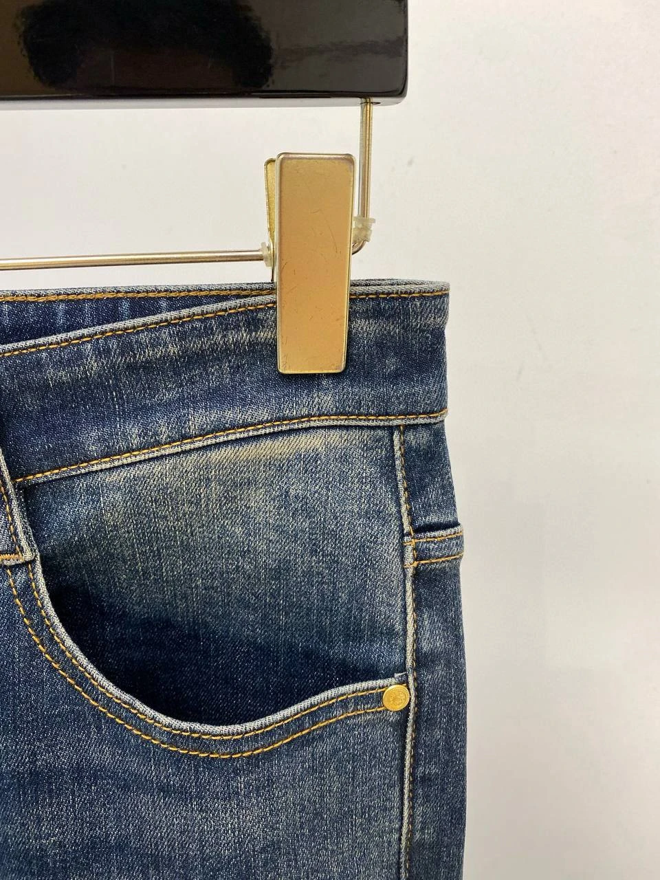 • Фурнитура: золотистые металлические заклепки и пуговица, аккуратная прострочка контрастной нитью.