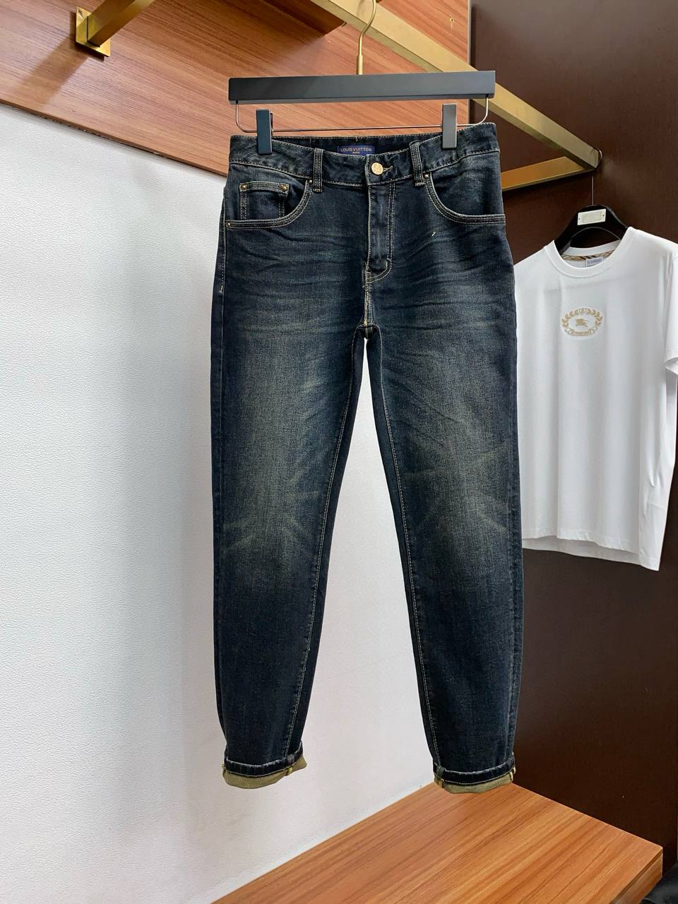 • Ткань: плотный тёмно-синий деним с естественным эффектом выцветания и «усами» в области бёдер и коленей.