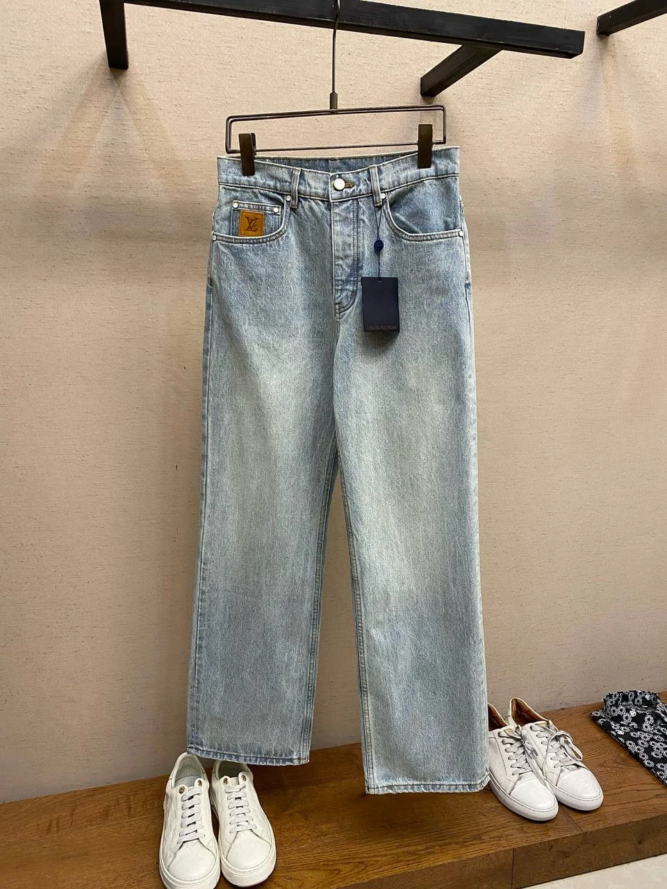 Мужские джинсы от LOUIS VUITTON в светло-голубом оттенке с легким потёртым эффектом они сочетают повседневный комфорт с фирменными акцентами бренда, идеально подходя для современного мужчины, ценящего стиль без усилий.
