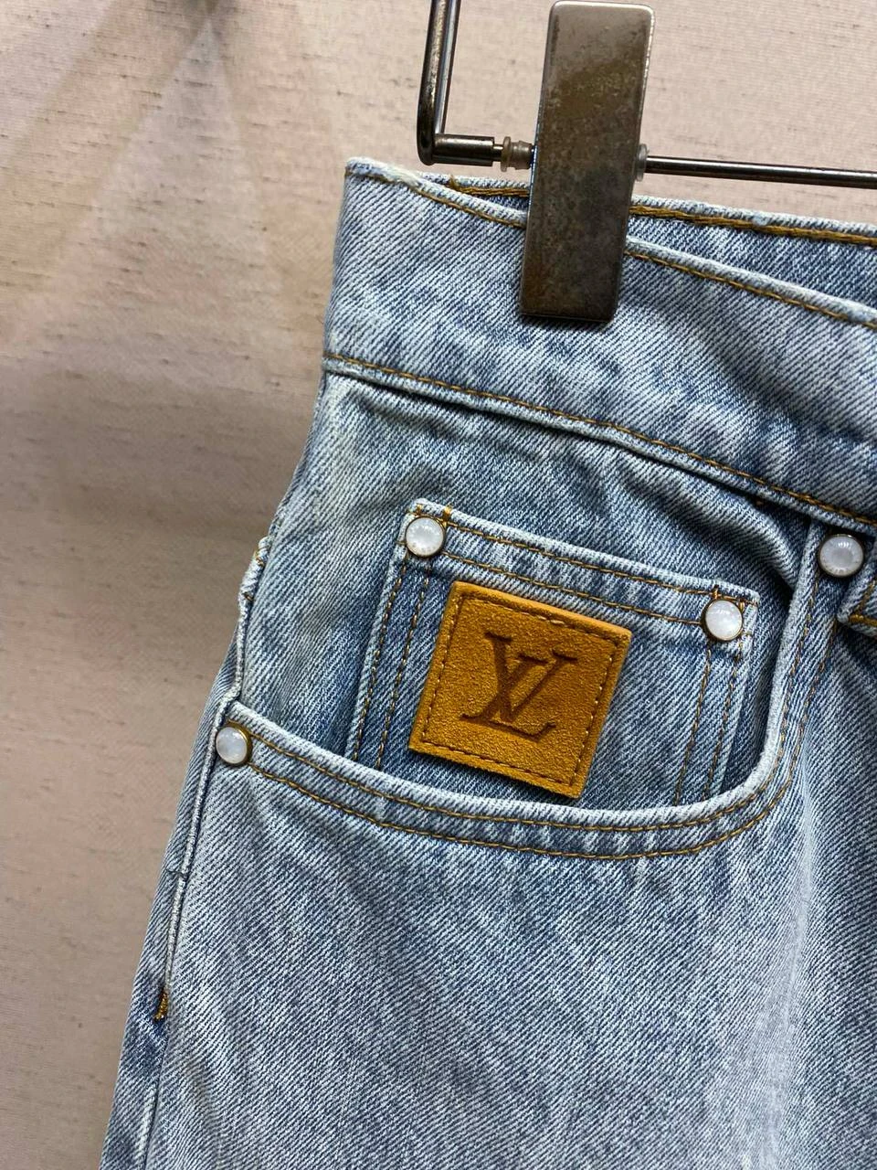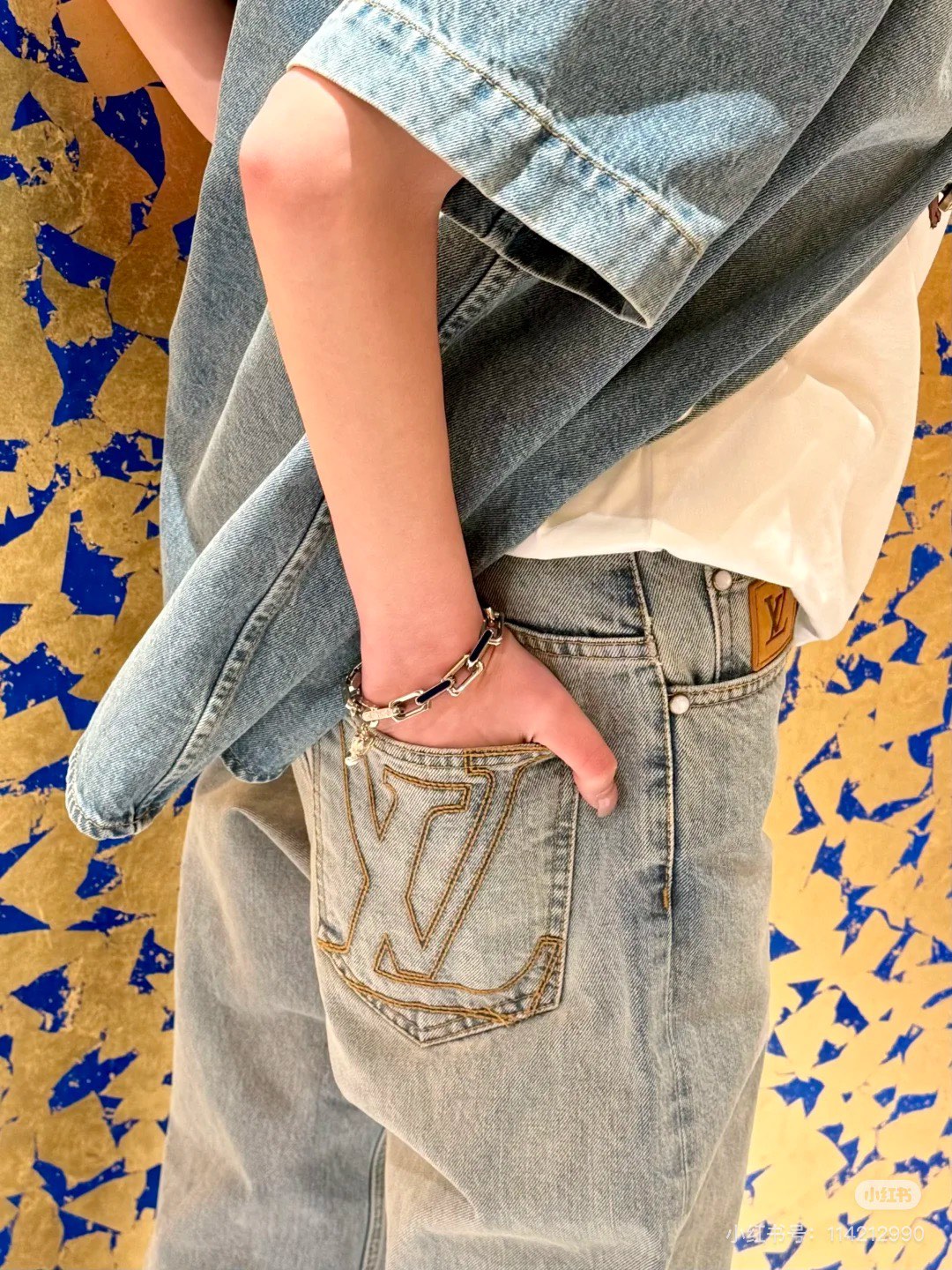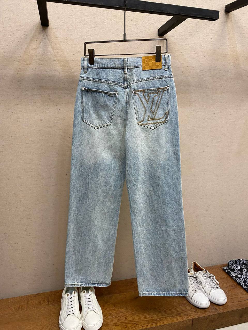 Джинсы сшиты из премиального хлопкового денима высокой плотности, обеспечивающего долговечность и естественную мягкость после носки. Крой — прямой и слегка расслабленый, с высокой посадкой на талии для комфортной свободы движений, без излишней облегаемости. Ноги слегка расширяются к низу, создавая сбалансированный силуэт, подходящий для разных типов фигур. Фирменные детали подчеркивают аутентичность LV: золотистая монограмма LV на заднем кармане, металлическая кнопка и заклепки с гравировкой, а также висящая этикетка с логотипом для утонченного акцента.