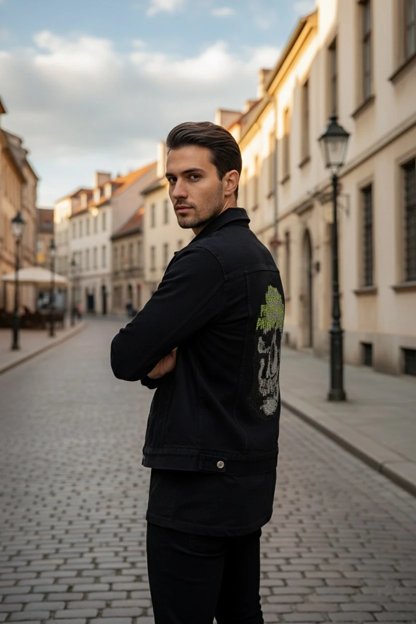 Мужская джинсовка с черепом из страз — это стильный элемент одежды, который подойдет для создания кэжуал-образов с ноткой панка или рок-культуры.