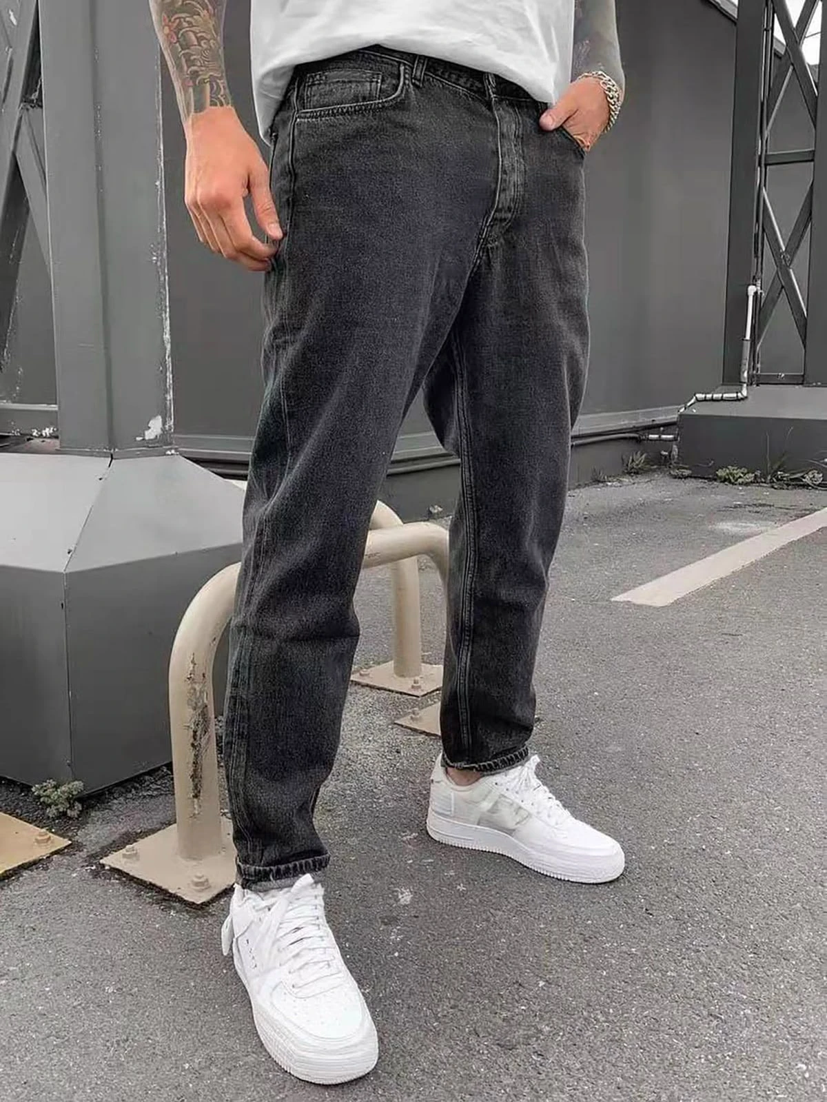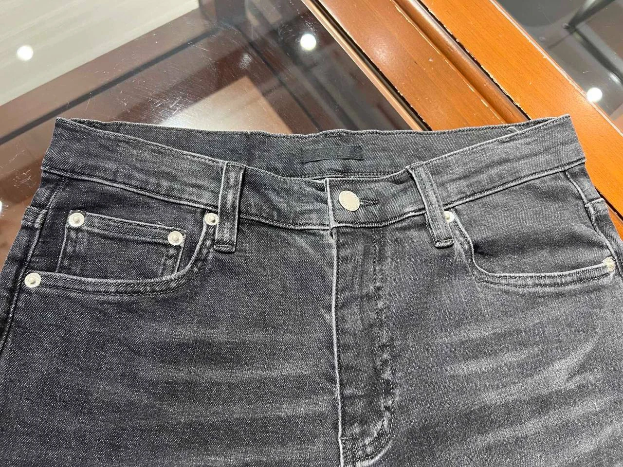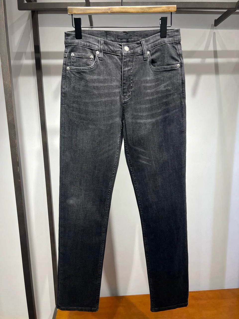 Джинсы изготовлены из высококачественного хлопкового денима, который сочетает плотность и мягкость, сохраняя форму даже после многократных стирок. Цвет — глубокий чёрный с естественными потертостями и выцветаниями, создающими текстурированный эффект, напоминающий винтаж, но без излишней грубости. Крой прямой, с средней посадкой для естественного комфорта; ширина по бедру стандартная, слегка сужающаяся к низу, длина — до щиколотки для современного силуэта.