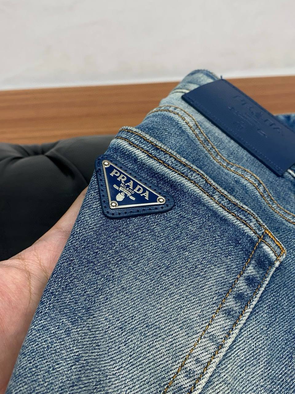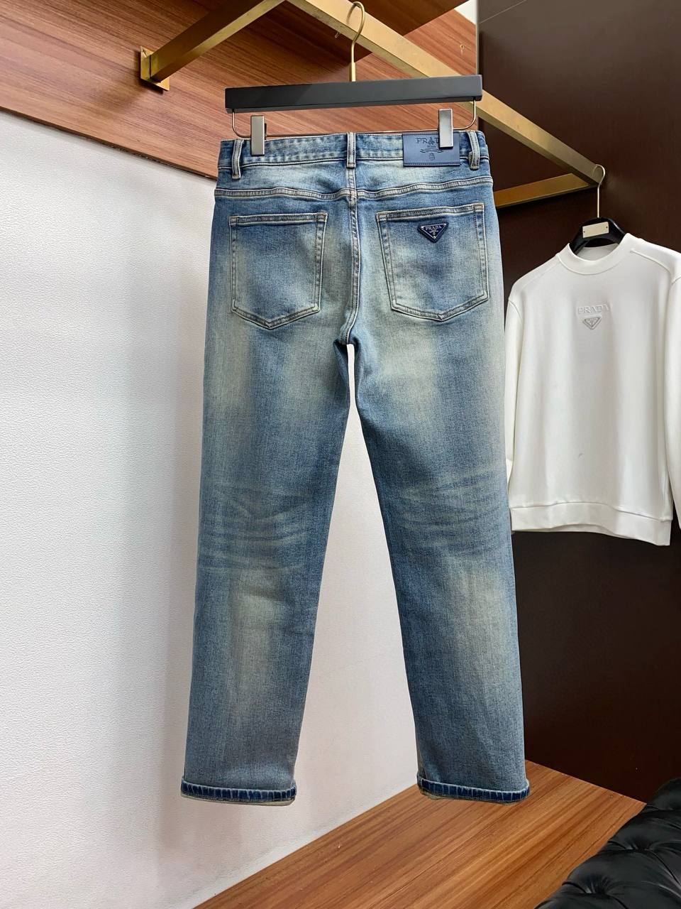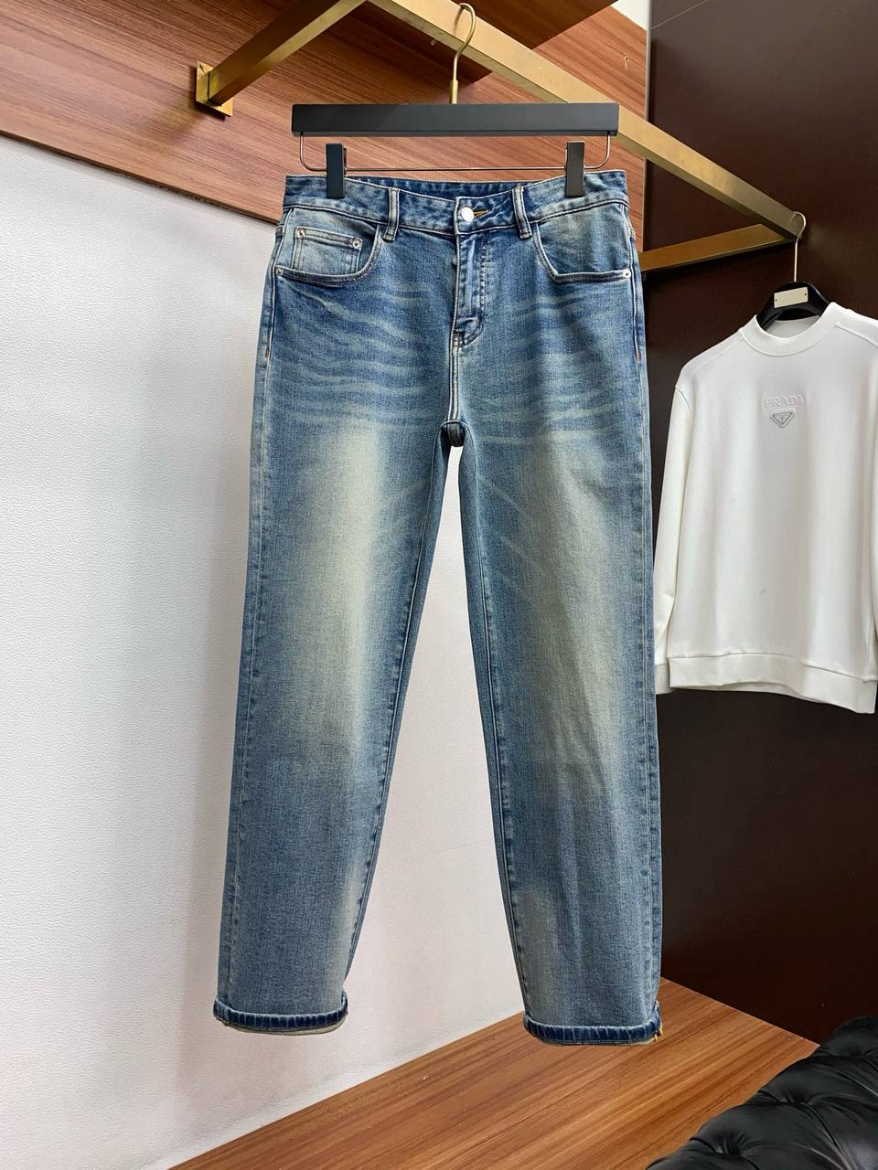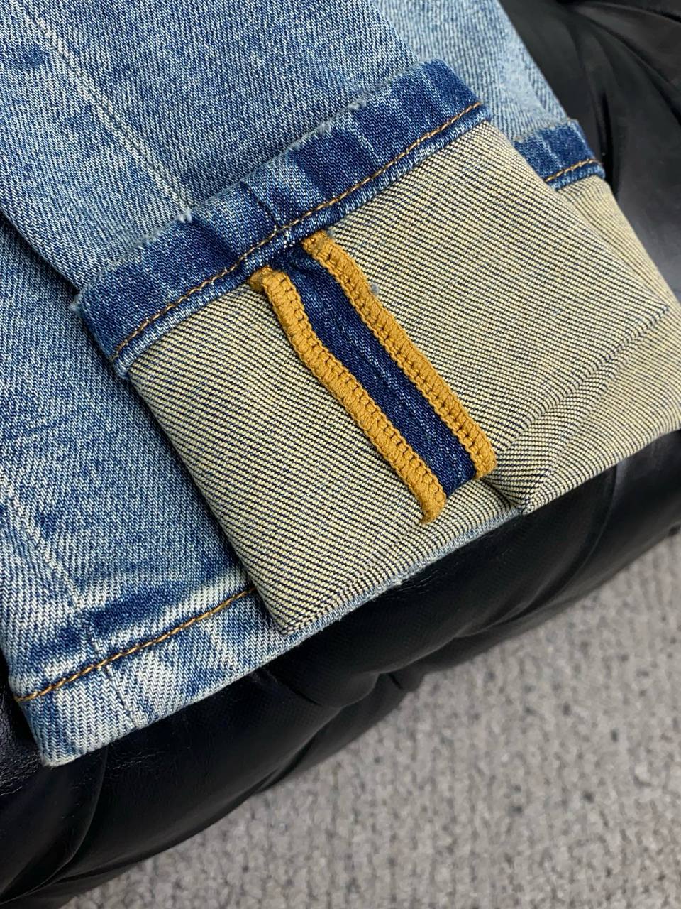 Классические мужские джинсы PRADA в средне‑голубом дениме с деликатным эффектом выцветания и «усиками» на линии бедер. Сдержанный, но выразительный образ — универсальная модель на каждый день, легко сочетается с футболками, рубашками и свитшотами.