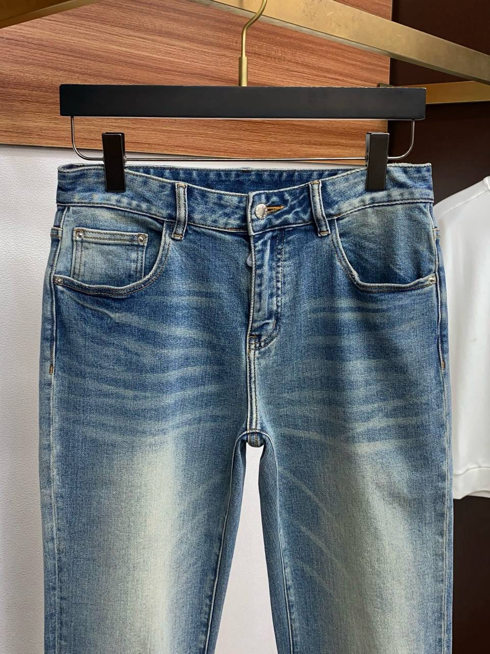 • Отделка и окраска: градуированное выцветание на передней части бедер и коленей, характерные «усики» в области паха и слегка светлеющая зона по центру бедра. Естественные переходы оттенков для эффектного, но аккуратного «ношеного» вида.