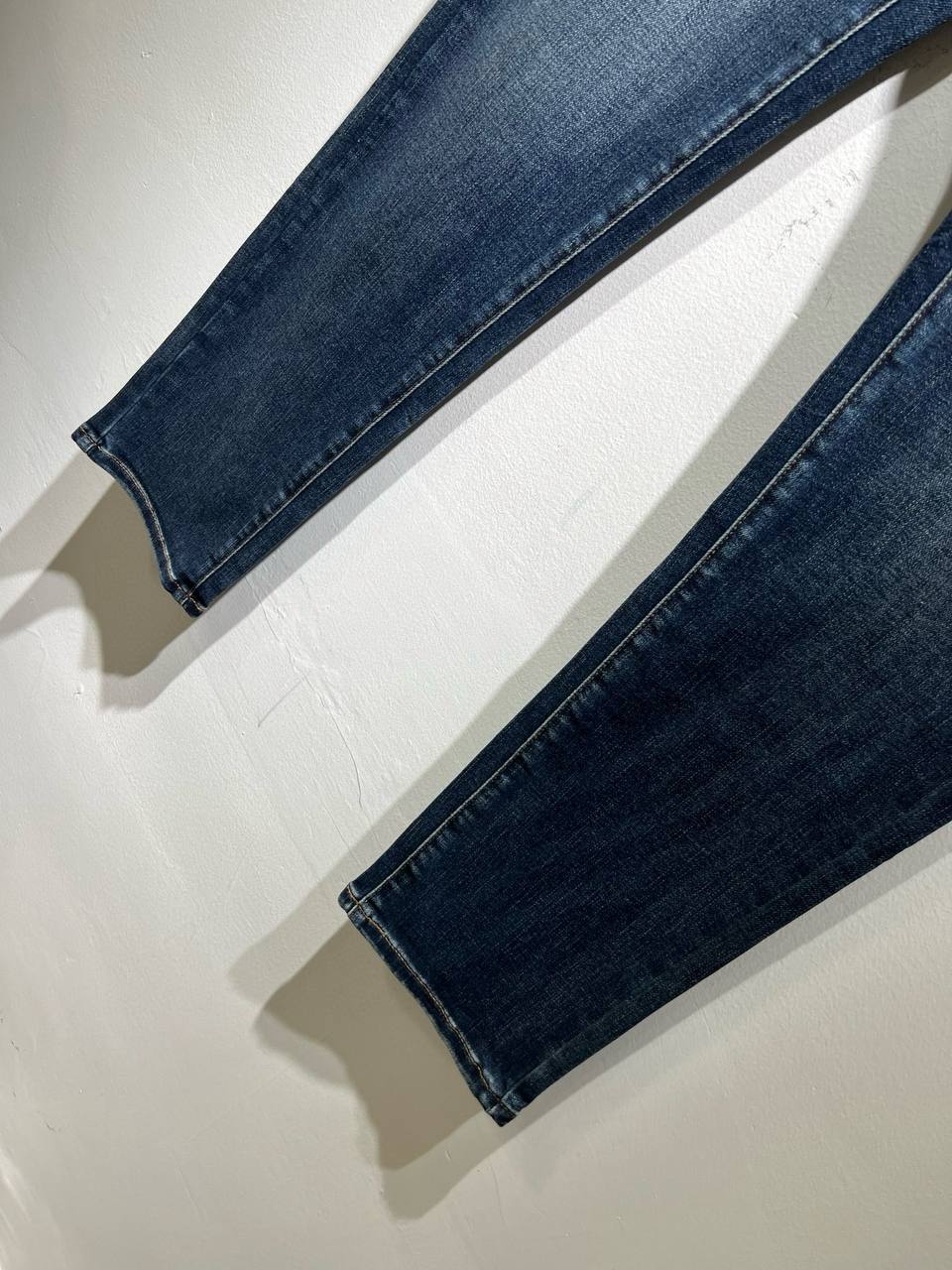 Джинсы выполнены из плотного, слегка тянущегося денима премиум‑качества, который сохраняет форму и комфорт при носке. Узкий покрой по бедру плавно сужается к щиколотке — современный «tapered» силуэт, придающий образу аккуратность и динамичность. Нежная градация цвета и локальные светлые участки создают эффект природной изношенности без грубых потертостей, что делает модель универсальной для ежедневного гардероба.