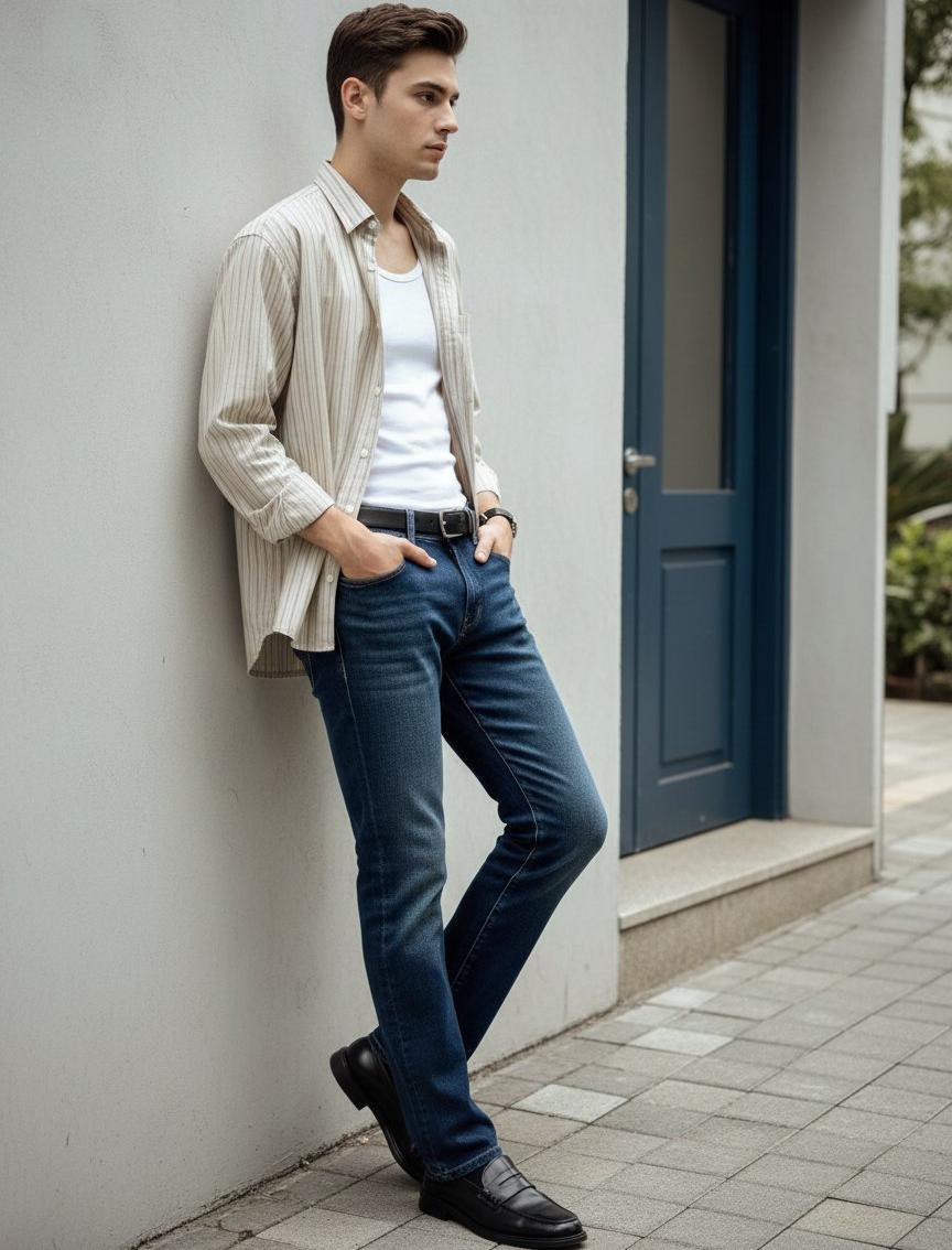 • Смарт‑кэжуал: рубашка на пуговицах, тонкий джемпер и дерби.