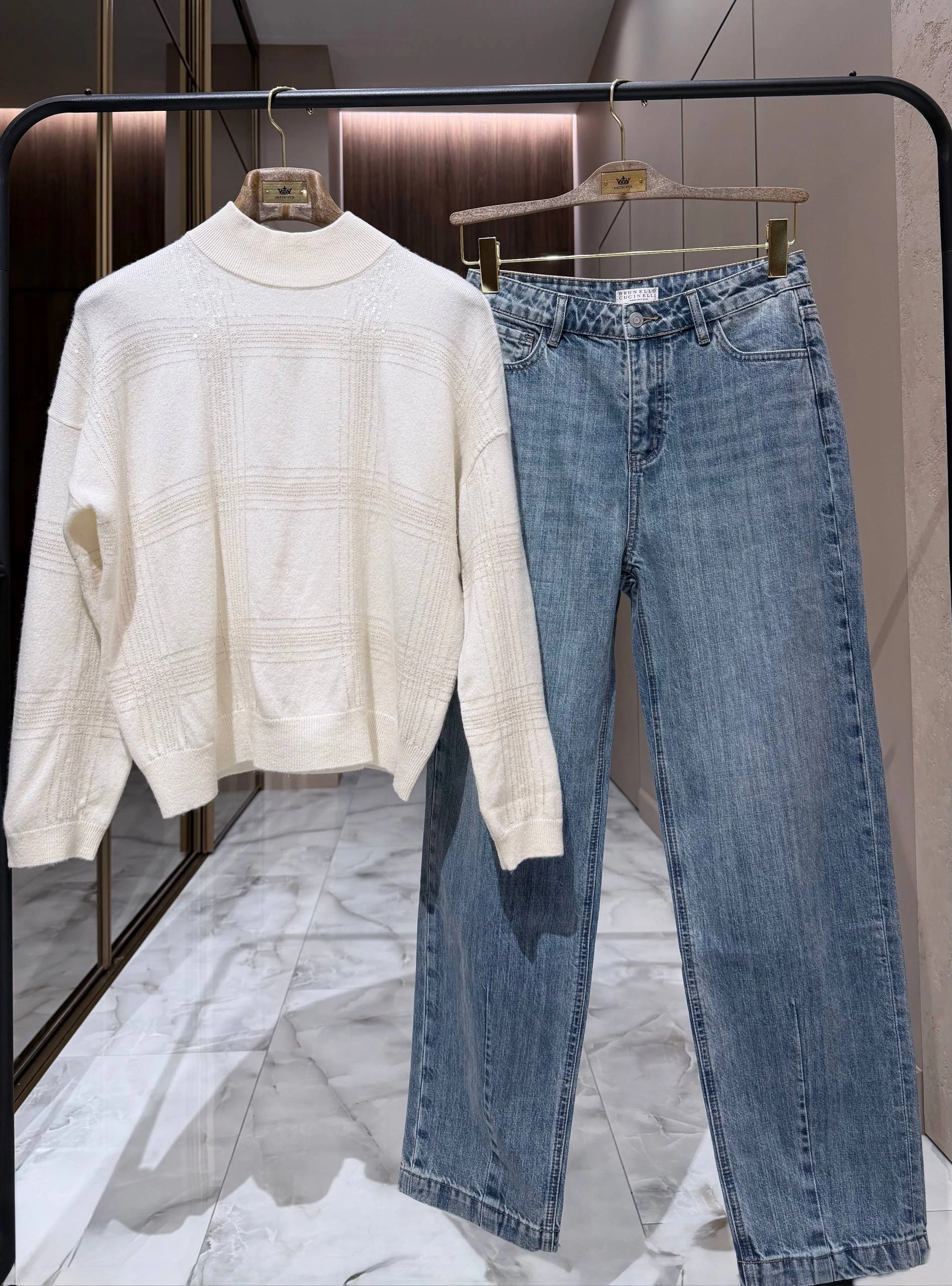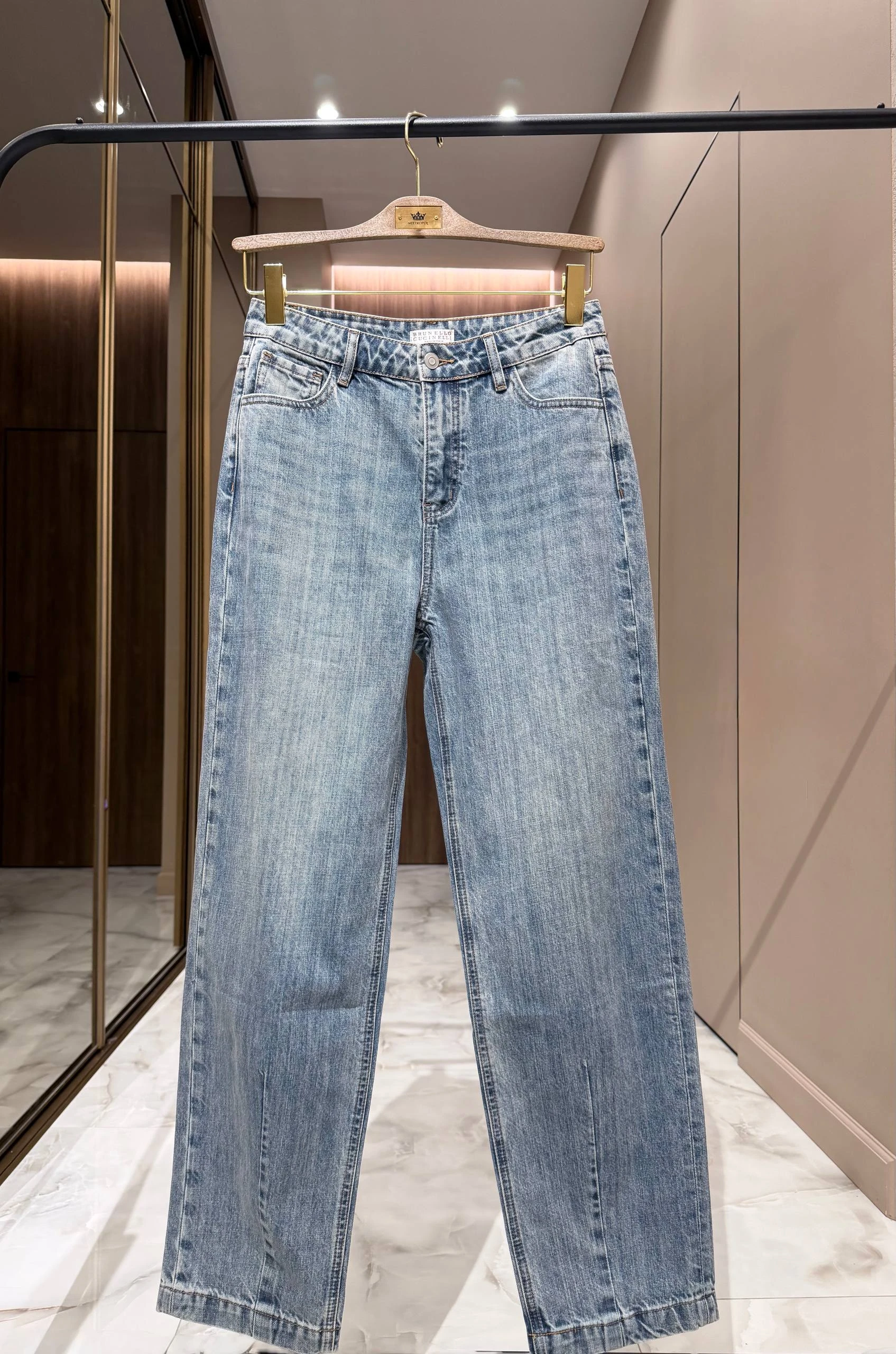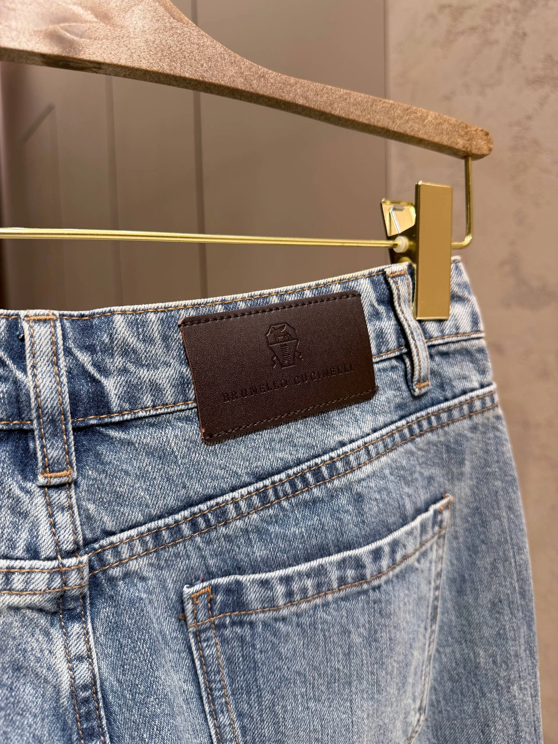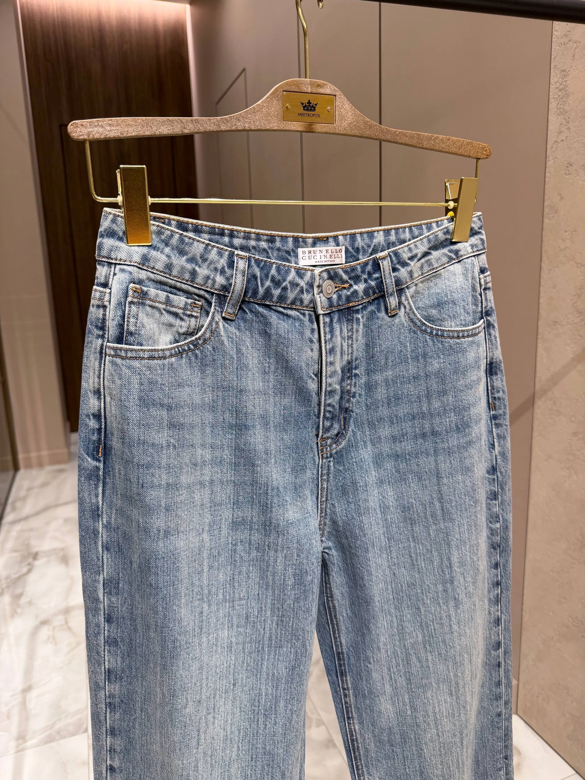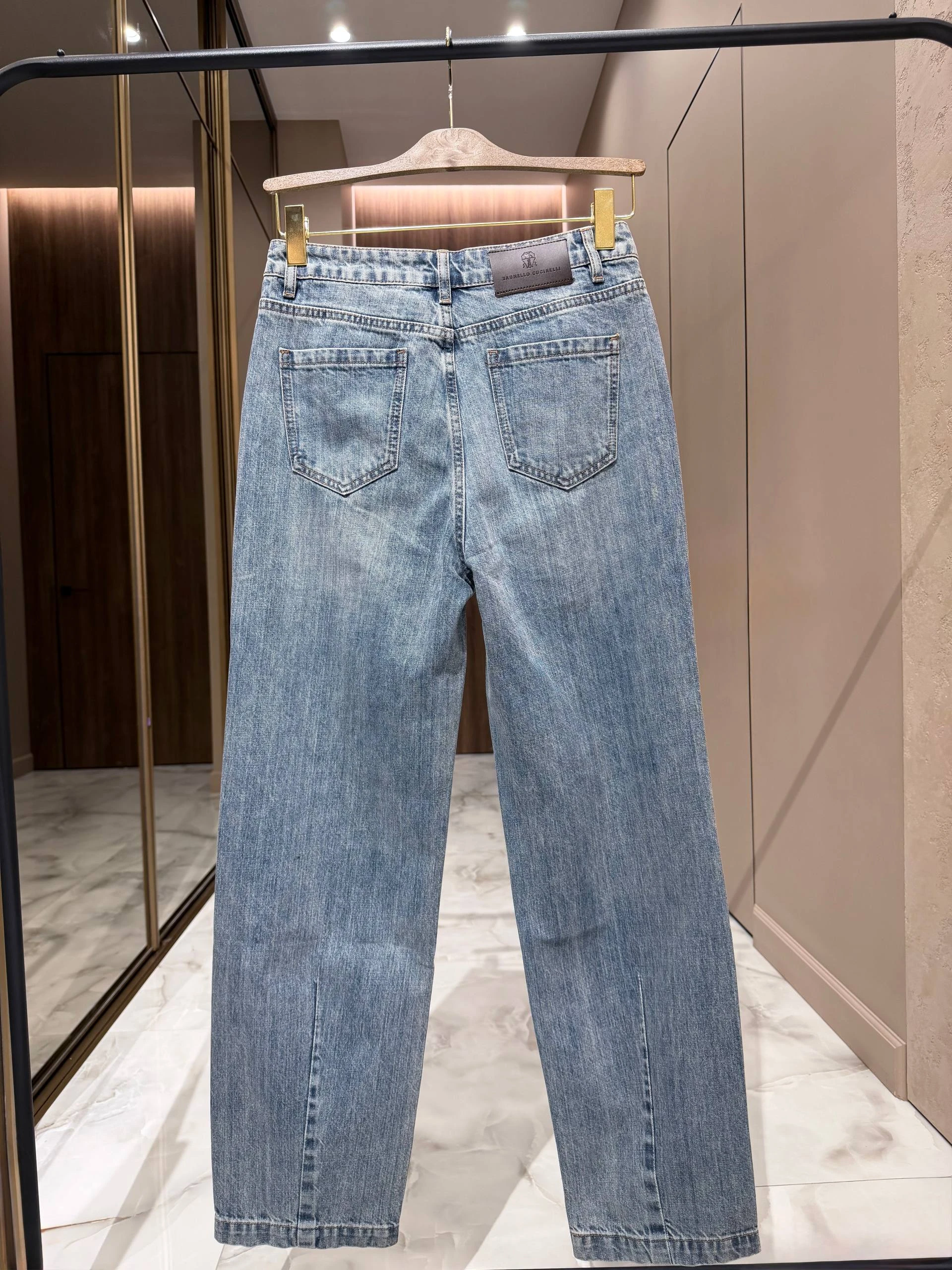Элегантные женские джинсы Brunello Cucinelli в лёгком светло-голубом винтажном оттенке. Выполнены из премиального денима с мягкой естественной потертостью. Современный прямой крой и аккуратная центральная строчка создают утончённый, одновременно расслабленный силуэт — идеальный выбор для повседневного и офисного гардероба в стиле casual luxury.