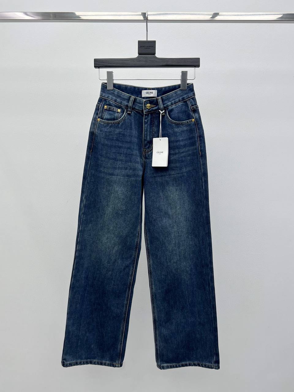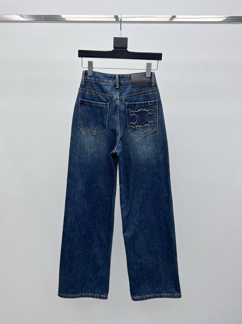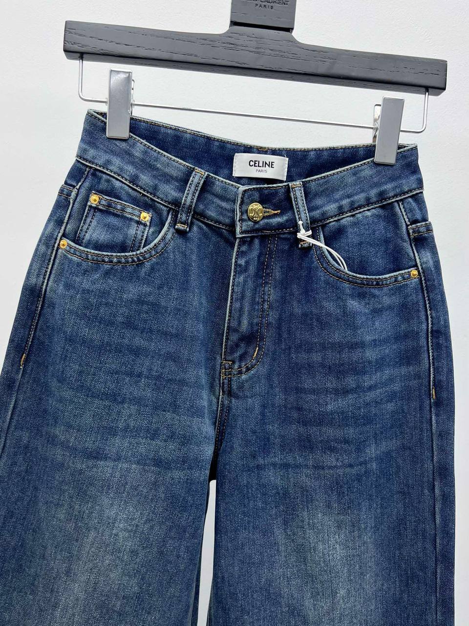 • Декор и фурнитура: классическая пятикарманная модель, металлические заклёпки и пуговица золотистого оттенка, контрастная строчка по швам. На поясе заметна бирка CELINE и подвесная белая товарная бирка.
