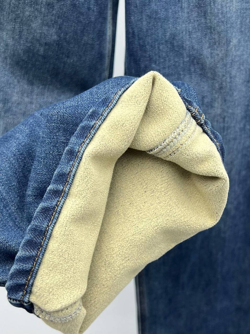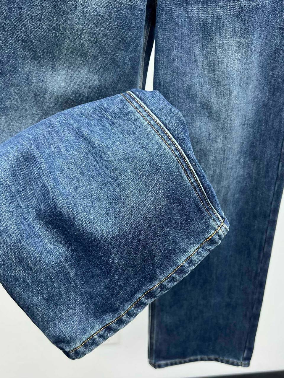 • Материал: качественный плотный деним тёмно‑индиго с равномерной протёртостью на передней части бедер. Плотность и структура видны на фото — ткань держит форму и подходит для многосезонной носки.