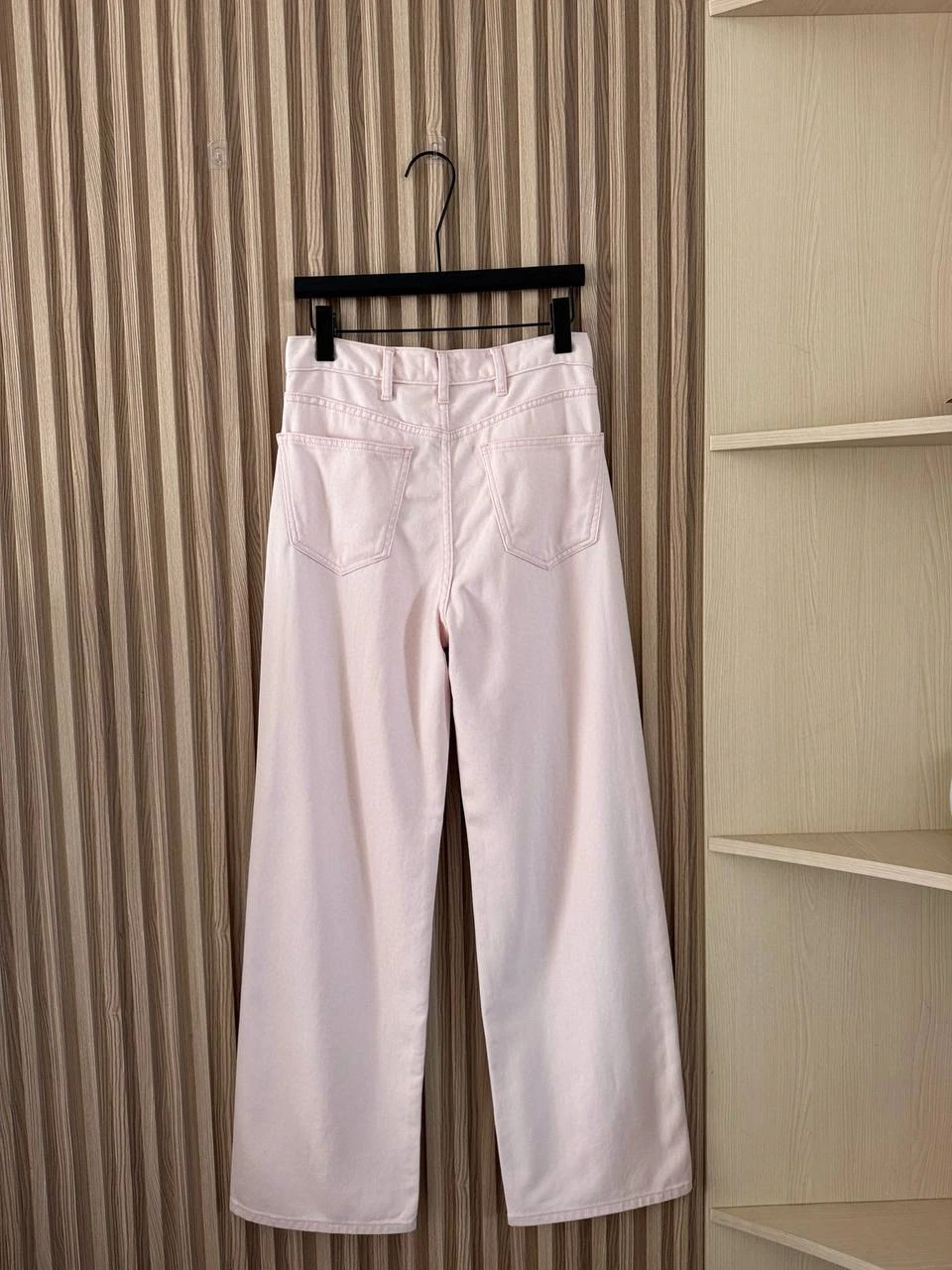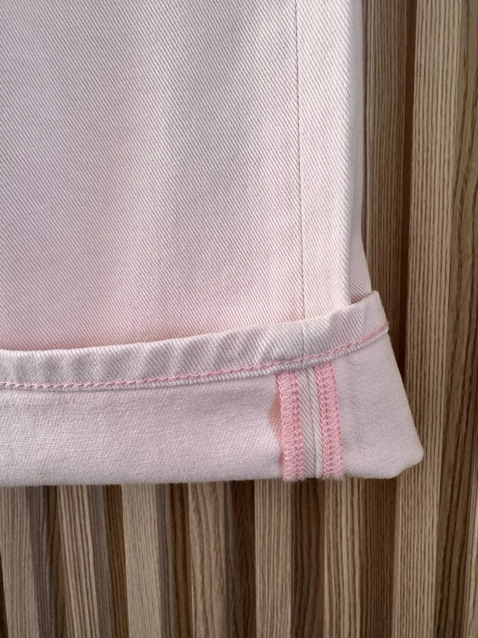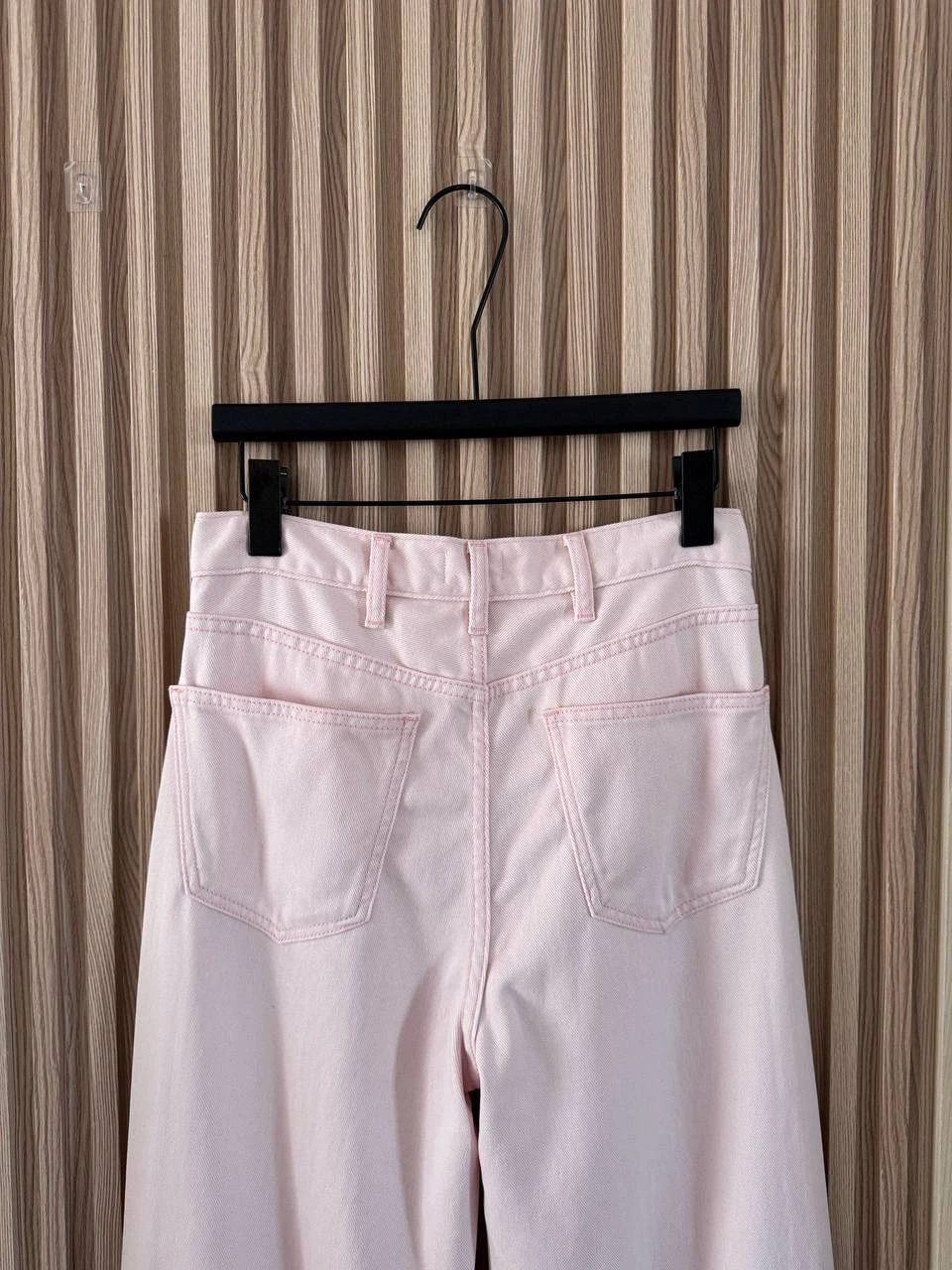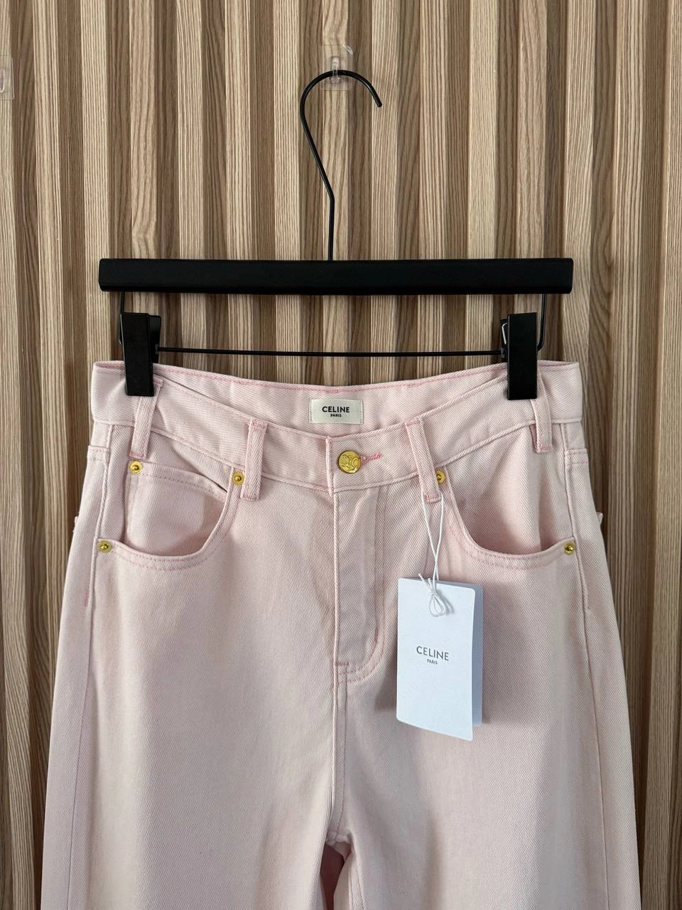 Пастельно-розовые джинсы CELINE в новом современном силуэте — высокая посадка и свободная прямая/слегка расклешённая нога. Минималистичная, женственная модель в стиле casual-luxury, идеально сочетается с рубашками, трикотажем и лёгкими жакетами.