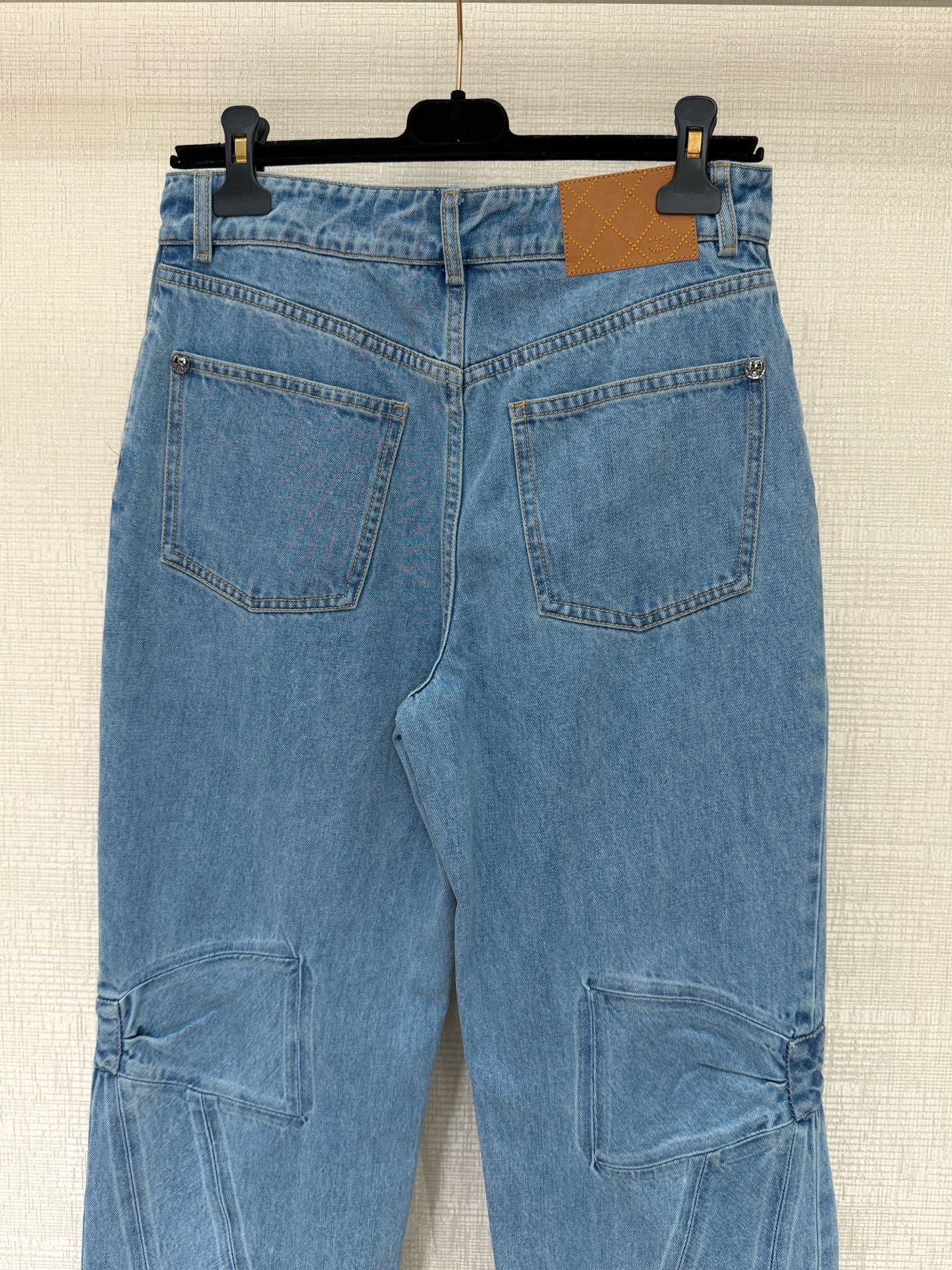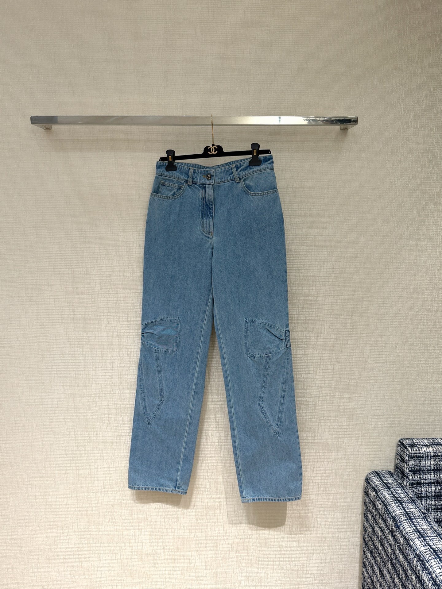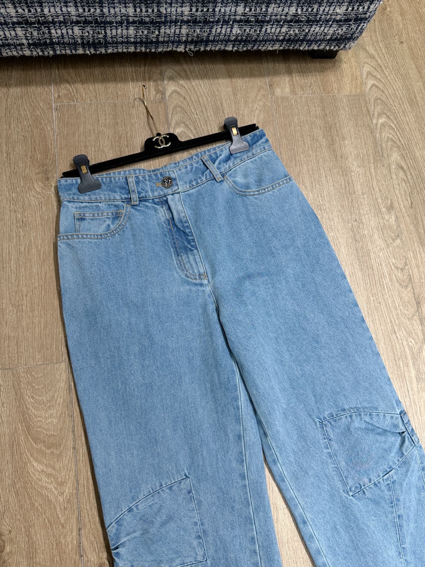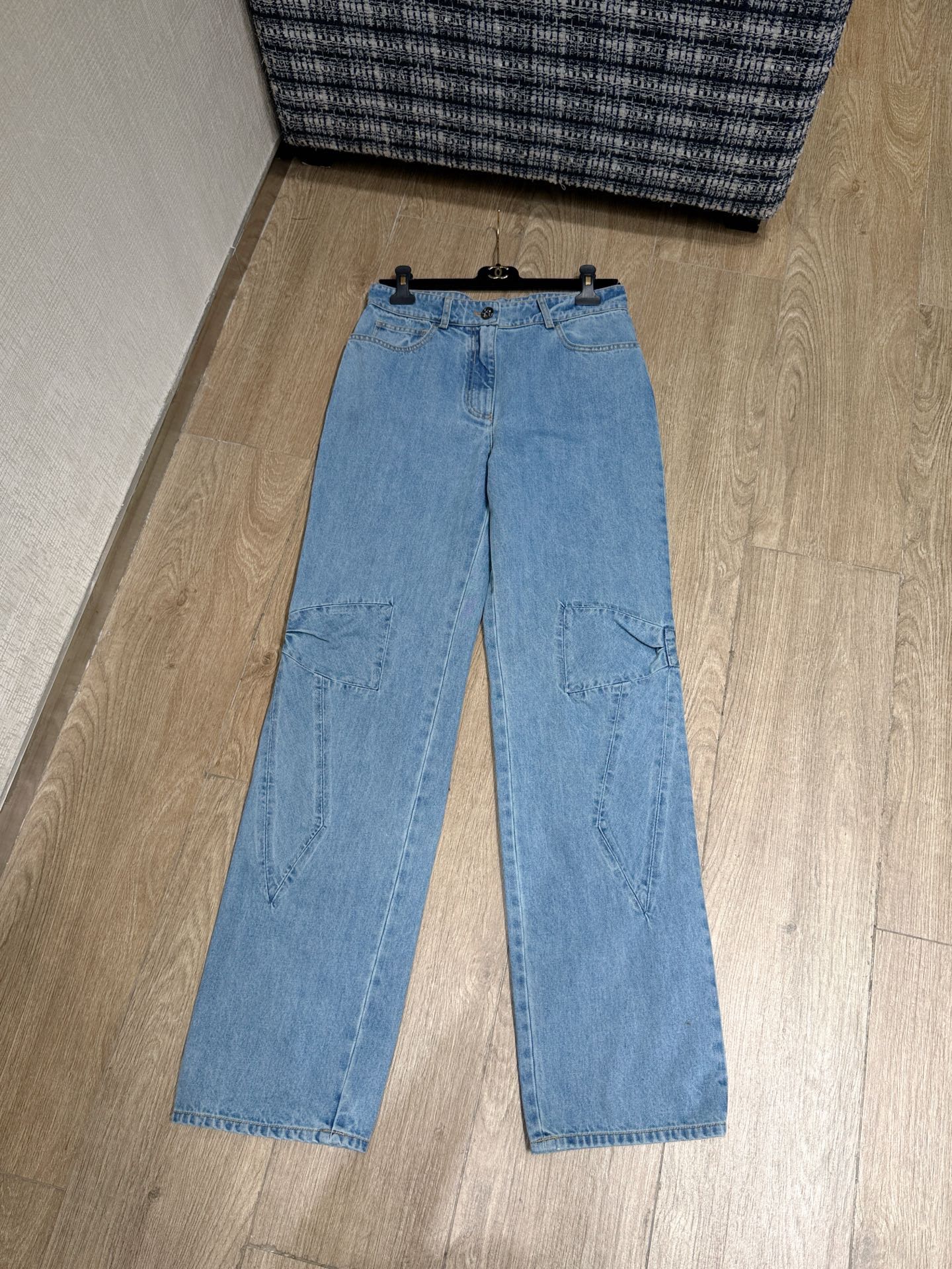 Модель выполнена из высококачественного светло-голубого денима средней плотности. Джинсы имеют классическую посадку на талии с застёжкой на пуговицу и потайную молнию, стандартные шлевки для ремня и привычную конструкцию карманов. Низ прямой, плавно спадающий к щиколотке.
