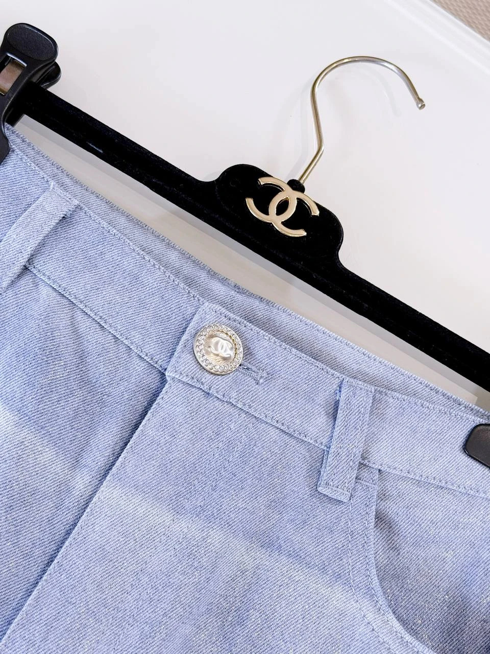 Эффектные женские джинсы CHANEL в нежно-ледяном оттенке голубого с горизонтальной стежкой. Модель с высокой посадкой и выраженным расклешением от бедра создаёт современный, архитектурный силуэт, сочетая комфорт и выразительный стиль.