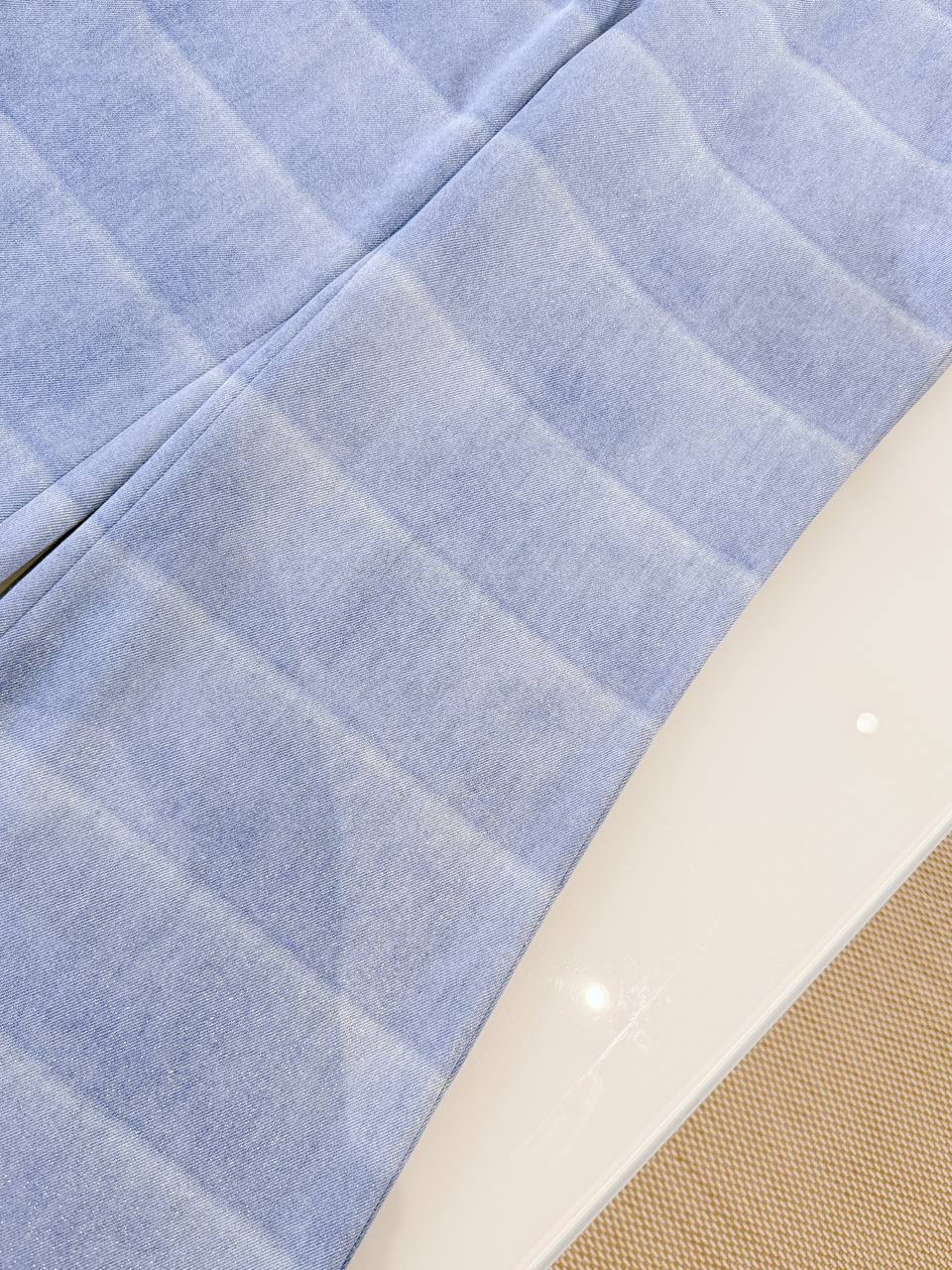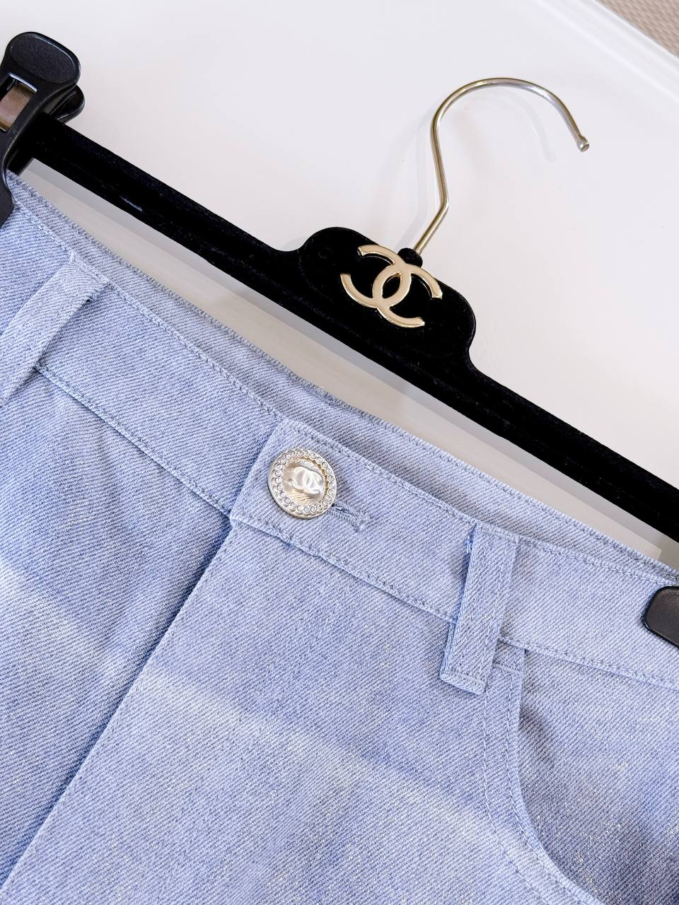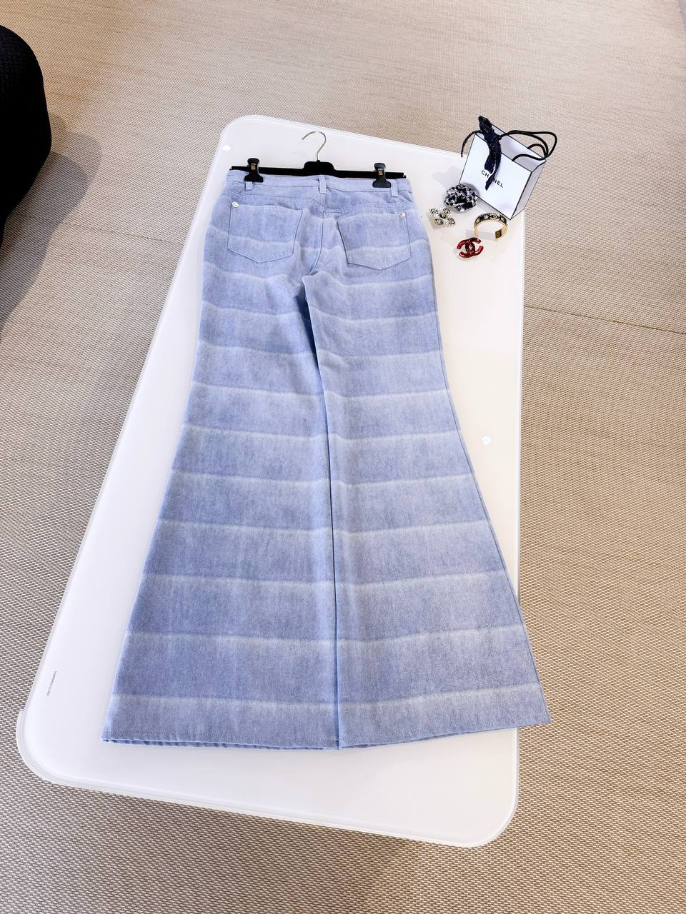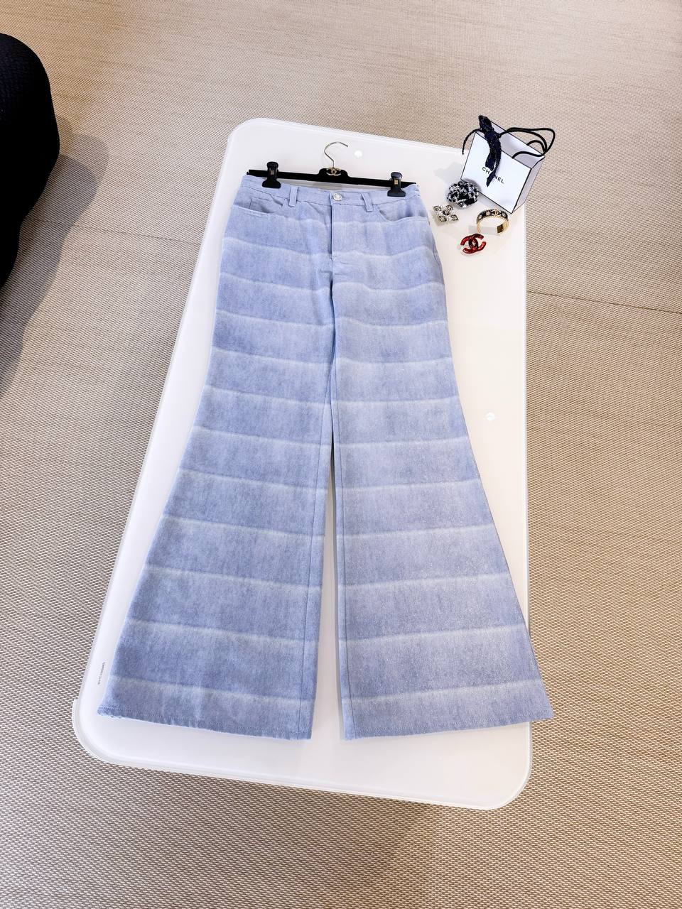 Изысканные джинсы CHANEL в нежно‑светло‑голубом оттенке с декоративной горизонтальной стёжкой и модным широким кроем — идеальный баланс между повседневным комфортом и высокой модой. Строгие линии талии и мягкий клёш от колена создают элегантный, удлиняющий силуэт.