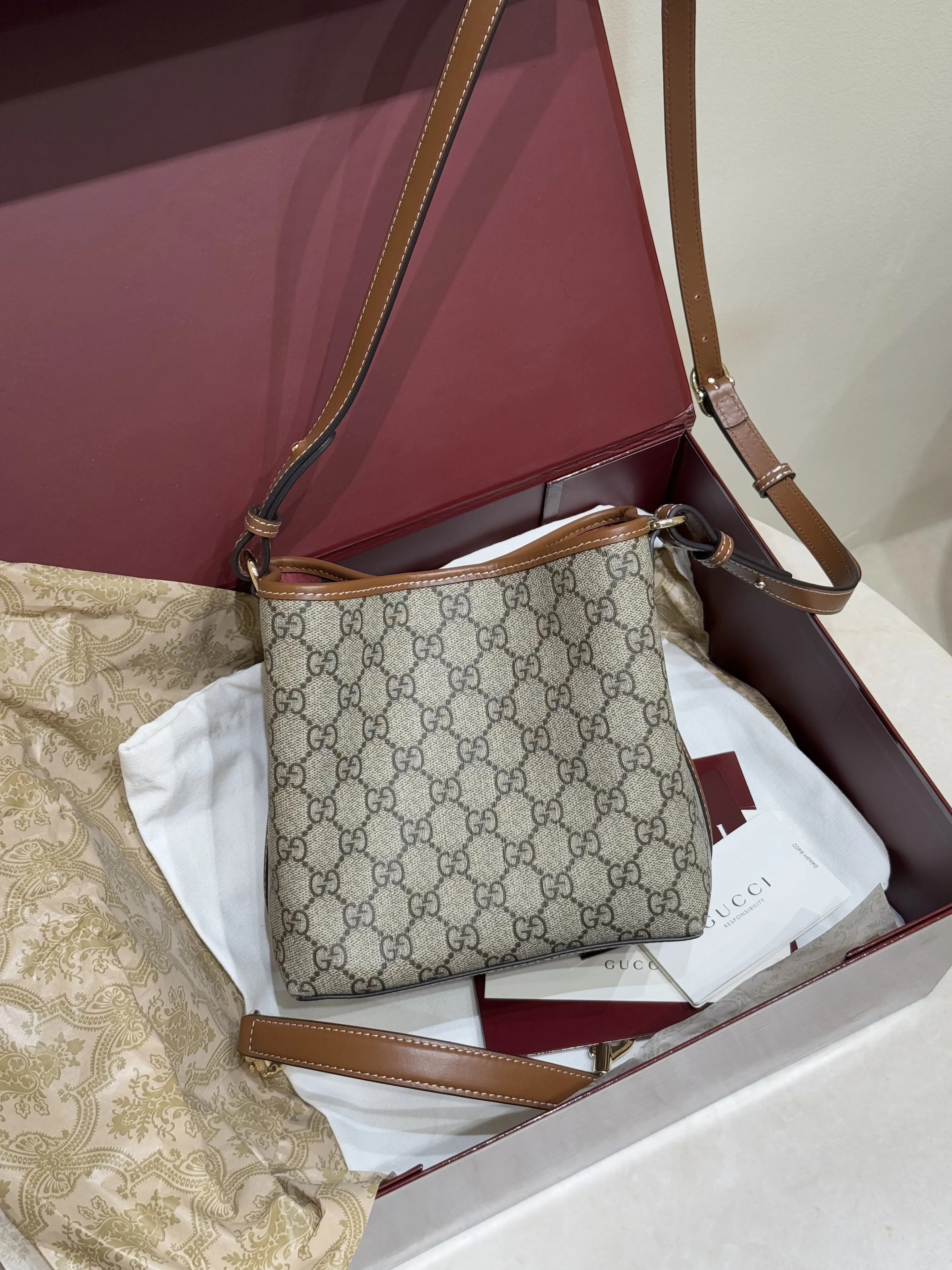 Бежевый и темно-коричневый GG Monogram с покрытием не только придает сумке стильный вид, но и обеспечивает долговечность. Отделка из коричневой кожи с контрастной строчкой добавляет изысканности.