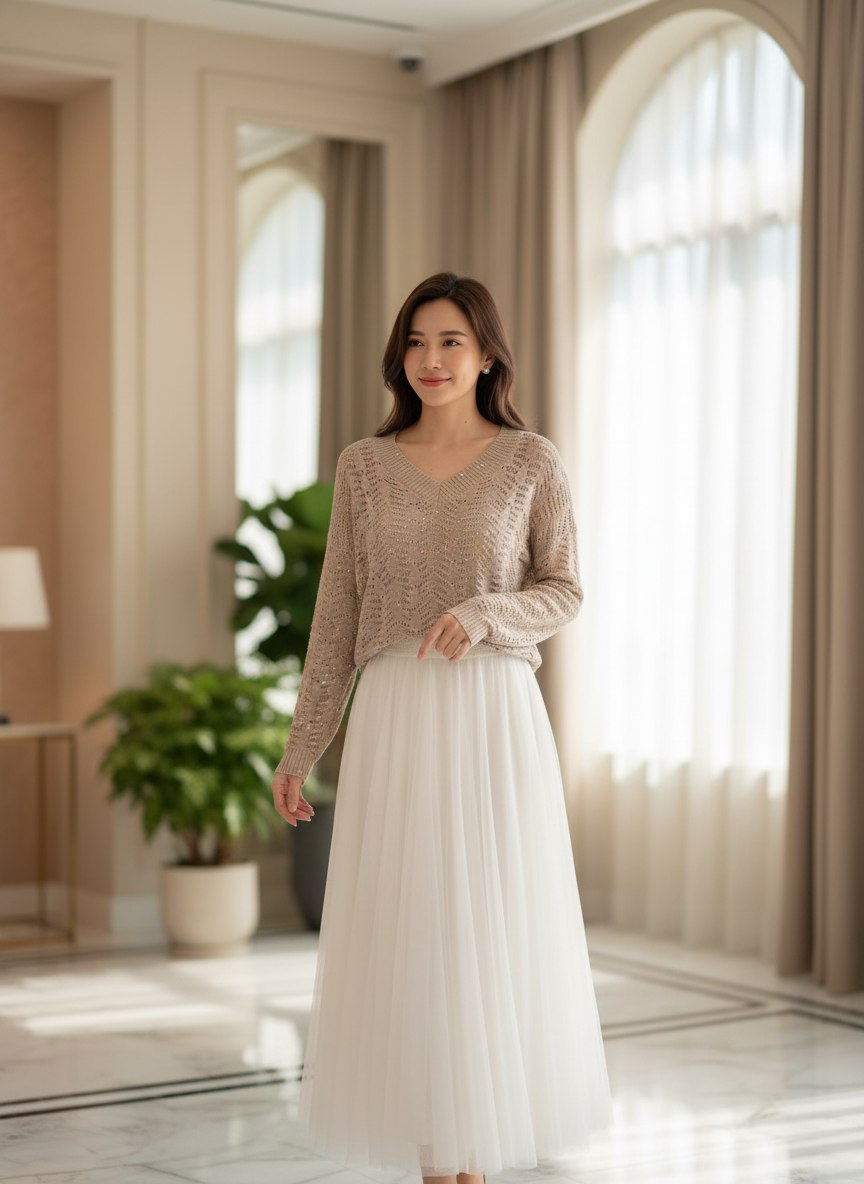 Джемпер, выполненный в элегантном бежевом цвете, излучает утонченность и минимализм. Мягкая и приятная на ощупь вязка обеспечивает невероятный комфорт и тепло в прохладную погоду.