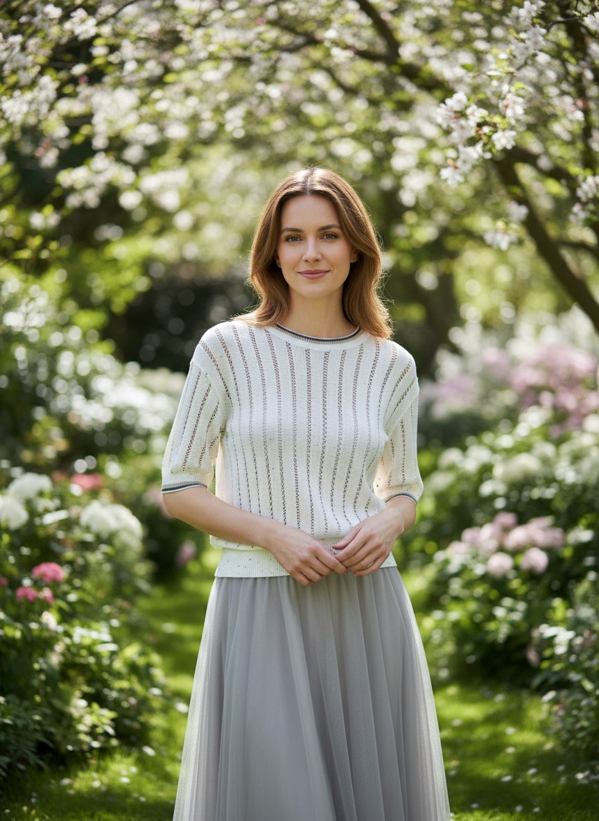 Деликатные пайетки, вплетённые в ткань, добавляют мягкое сияние и подчёркивают эксклюзивность изделия. Классический круглый вырез, короткий рукав и эластичная резинка по низу обеспечивают комфортную посадку и универсальность — футболка гармонично дополнит как повседневные, так и вечерние образы.