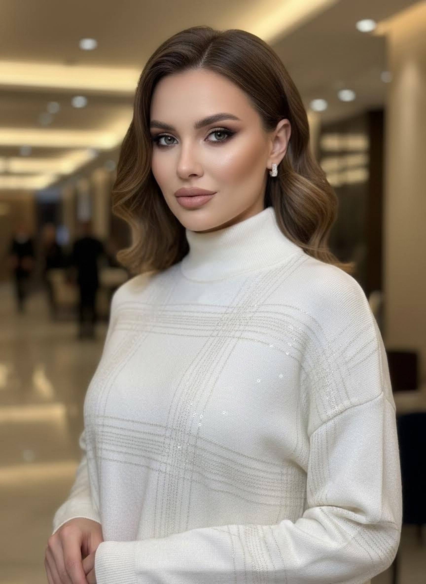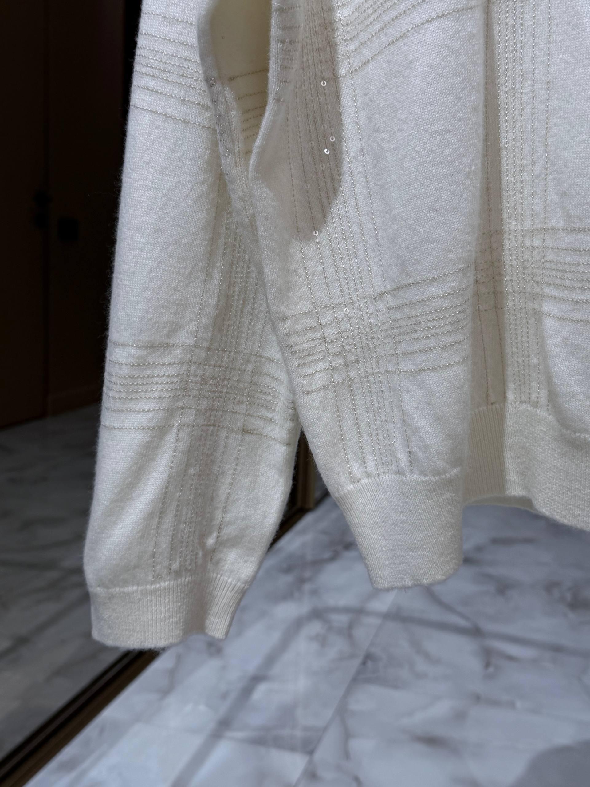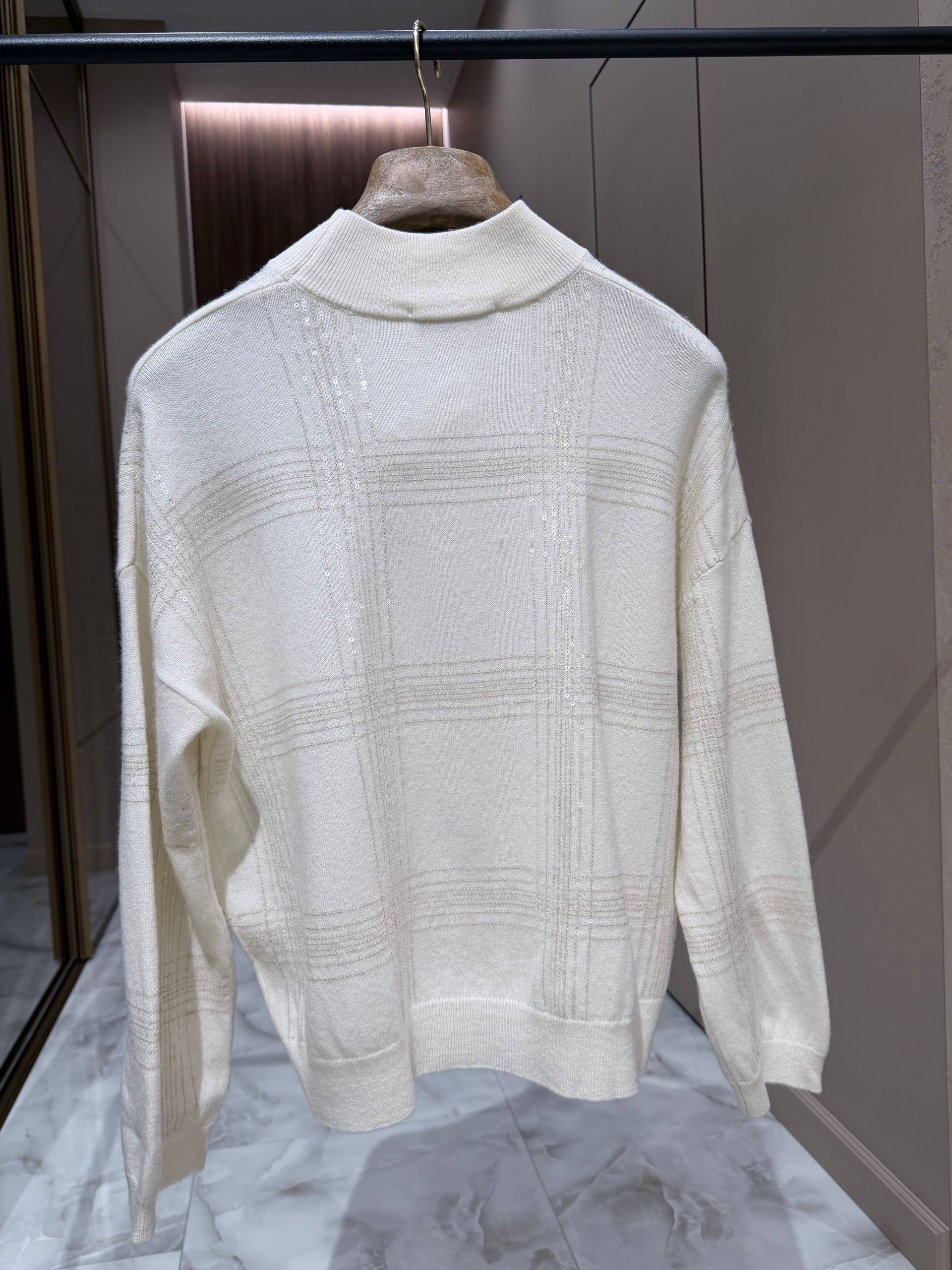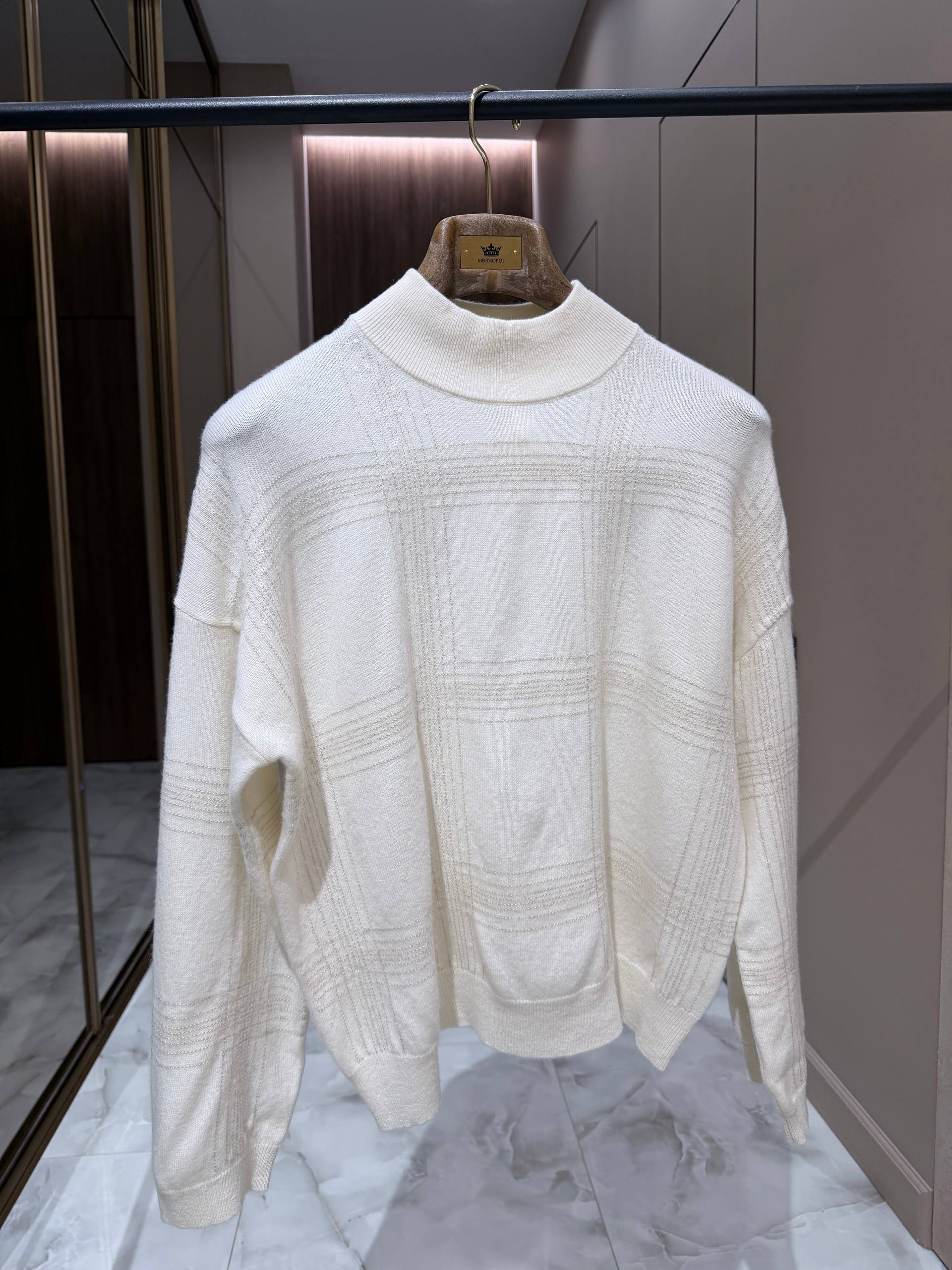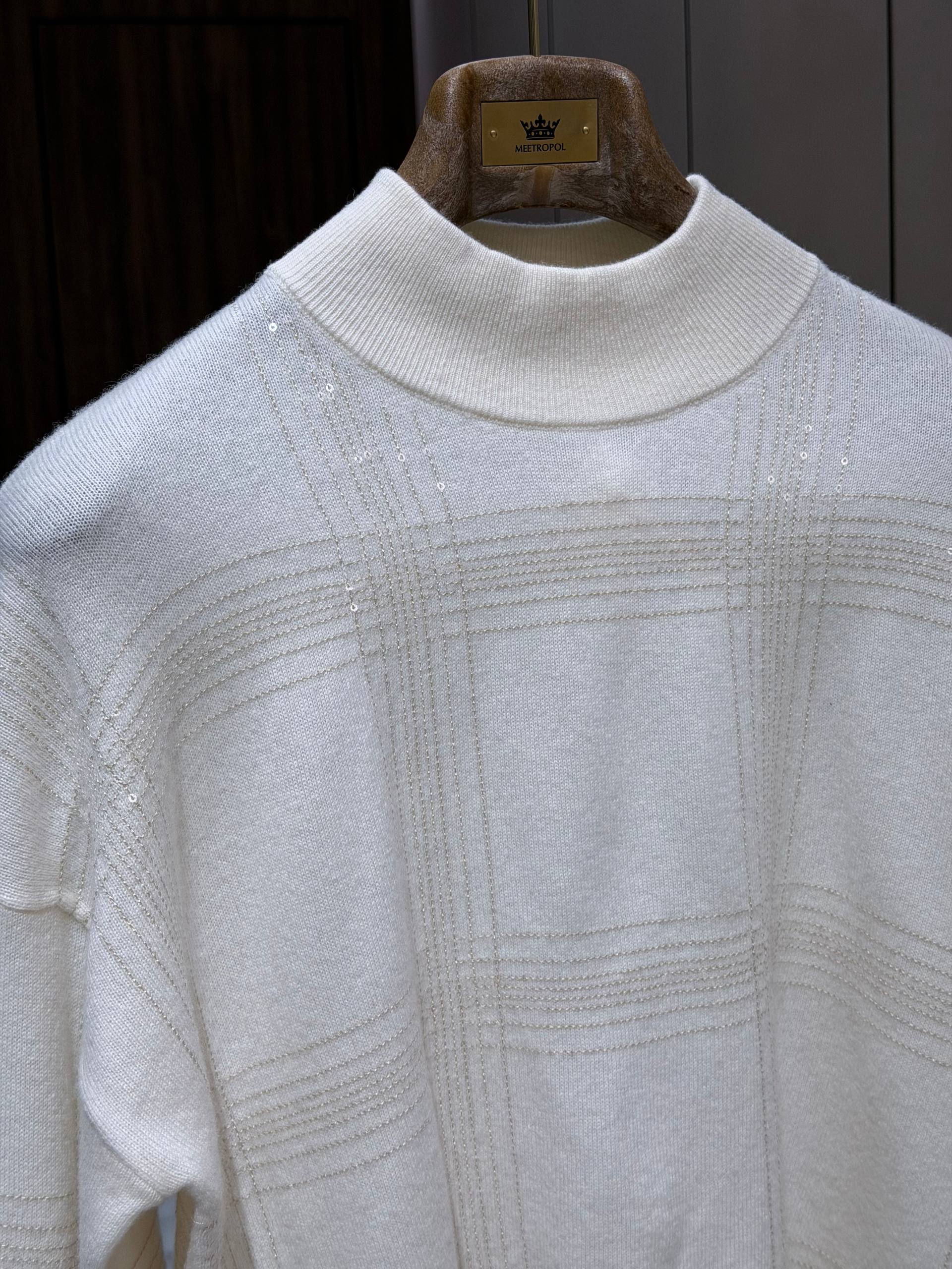 Мягкий однотонный свитер из кашемира (30%) и шерсти (70%) молочного оттенка с элегантной высокой стойкой и ненавязчивым рельефным рисунком «состыкованных» полос, создающих эффект тонкой клетки. Универсальная, сдержанная модель в лаконичном стиле — идеальна для повседневной и деловой городской одежды. Основной визуальный акцент — тонкий рельефный узор в виде широкой клеточной структуры, выполненный тем же тоном, что придаёт изделию глубину и аристократичную лаконичность, но не перегружает образ. Высокая стойка аккуратно обрамляет шею, добавляя чуть формальной нотки, при этом не сковывает движений. Спущенная линия плеч и свободный, слегка прямой силуэт обеспечивают комфорт и удобство в носке. Манжеты и нижняя кромка выполнены резинкой, сохраняющей форму изделия.