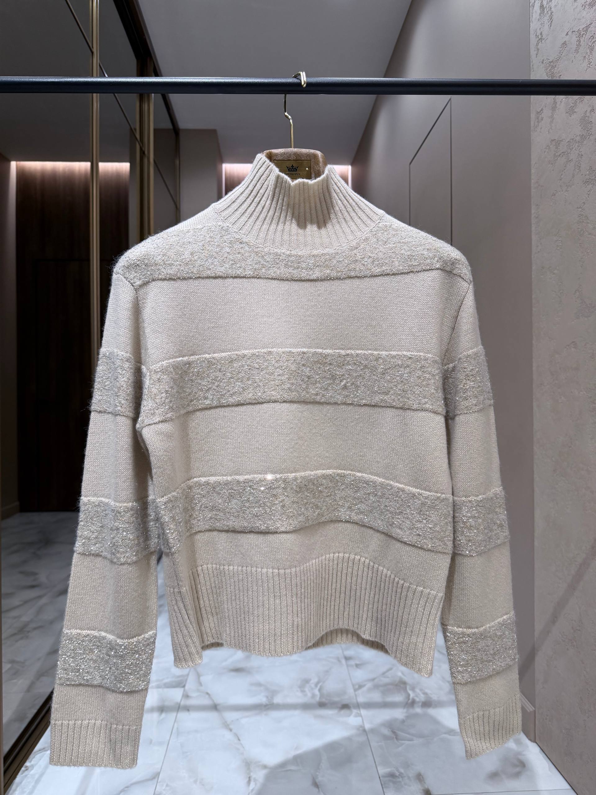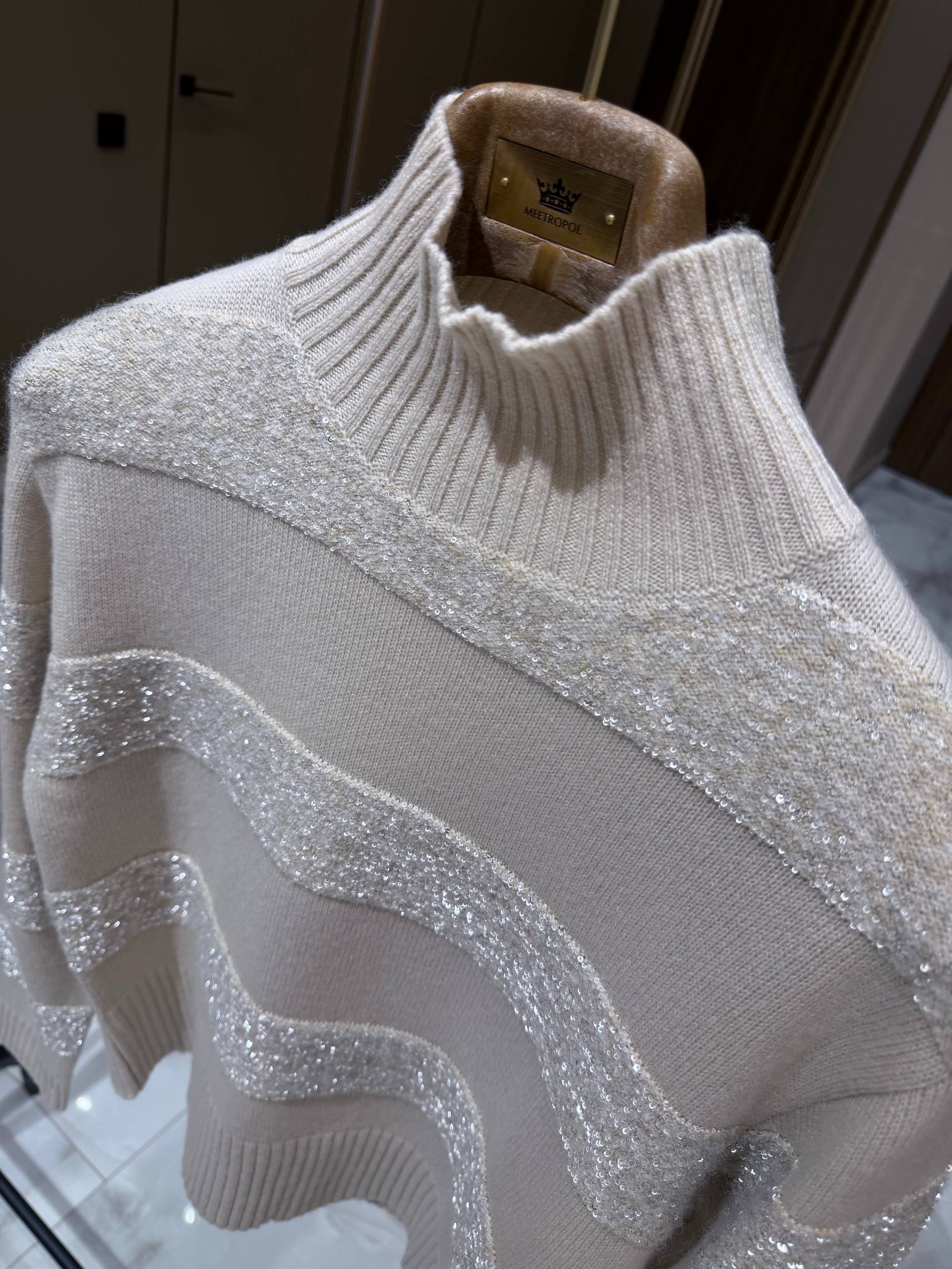 • Отделка: широкие горизонтальные полосы с текстурным ворсом, украшенные мерцающими пайетками и тонкой сверкающей нитью — эффектное, но сдержанное сияние при любом освещении.