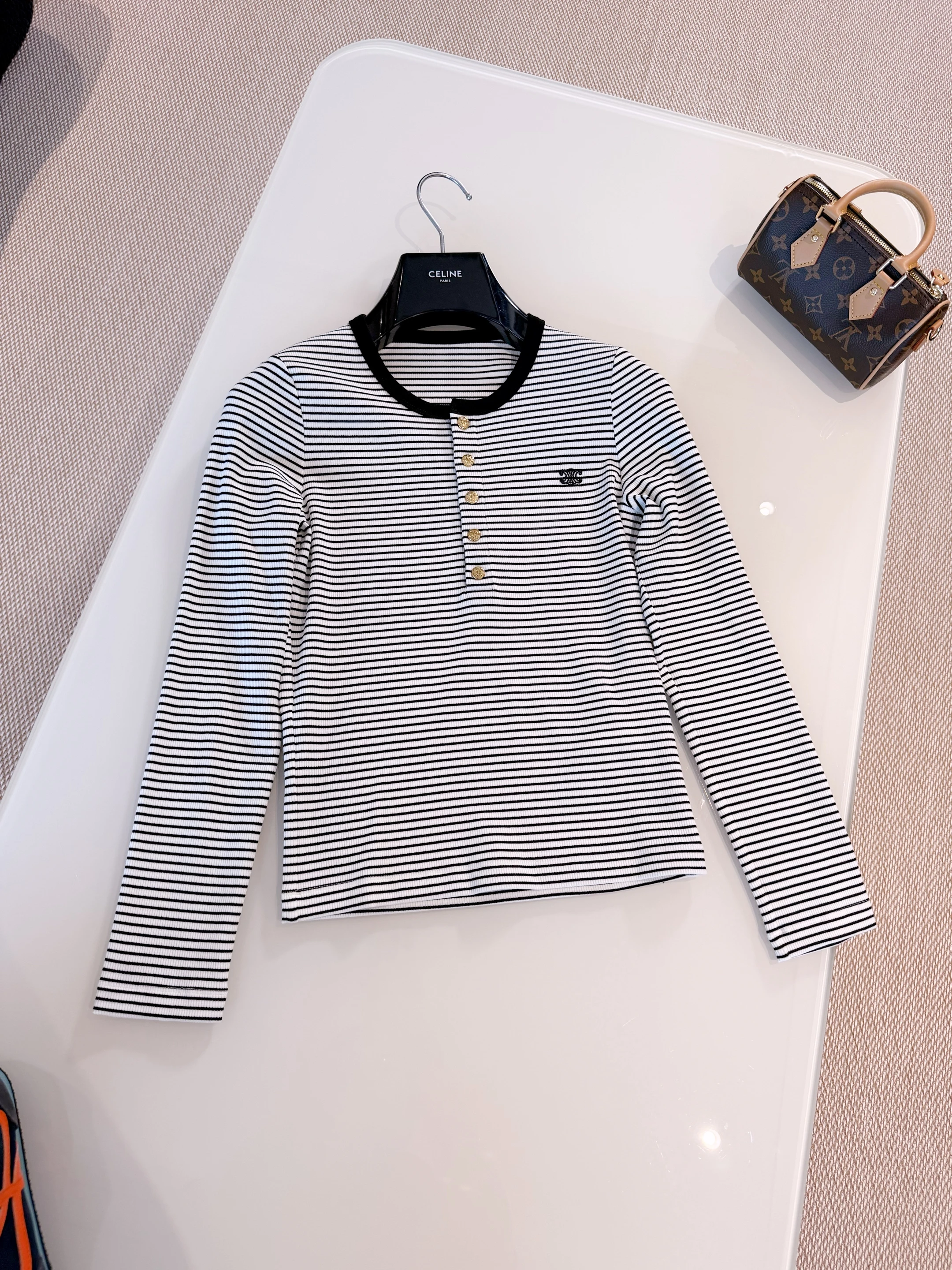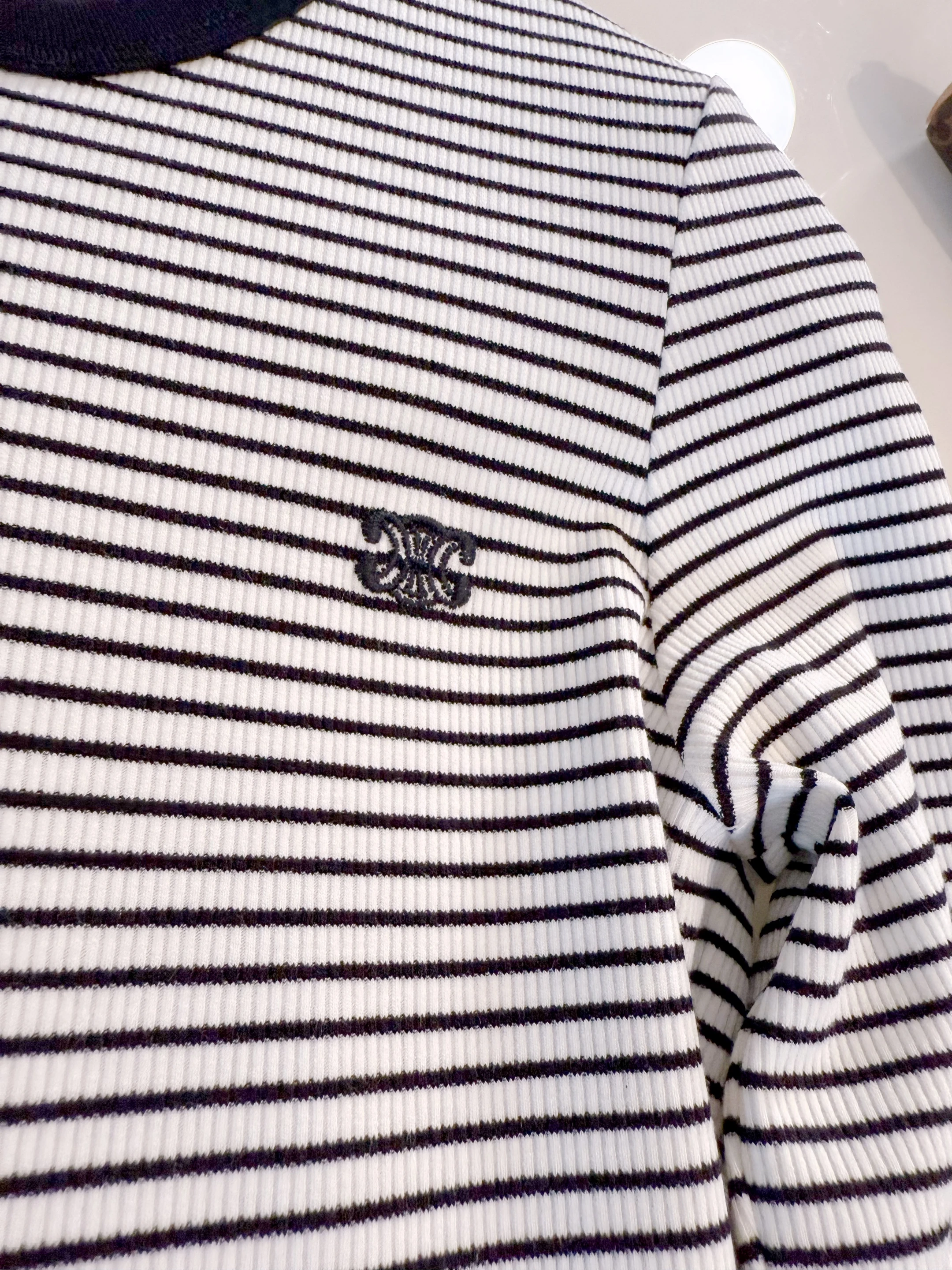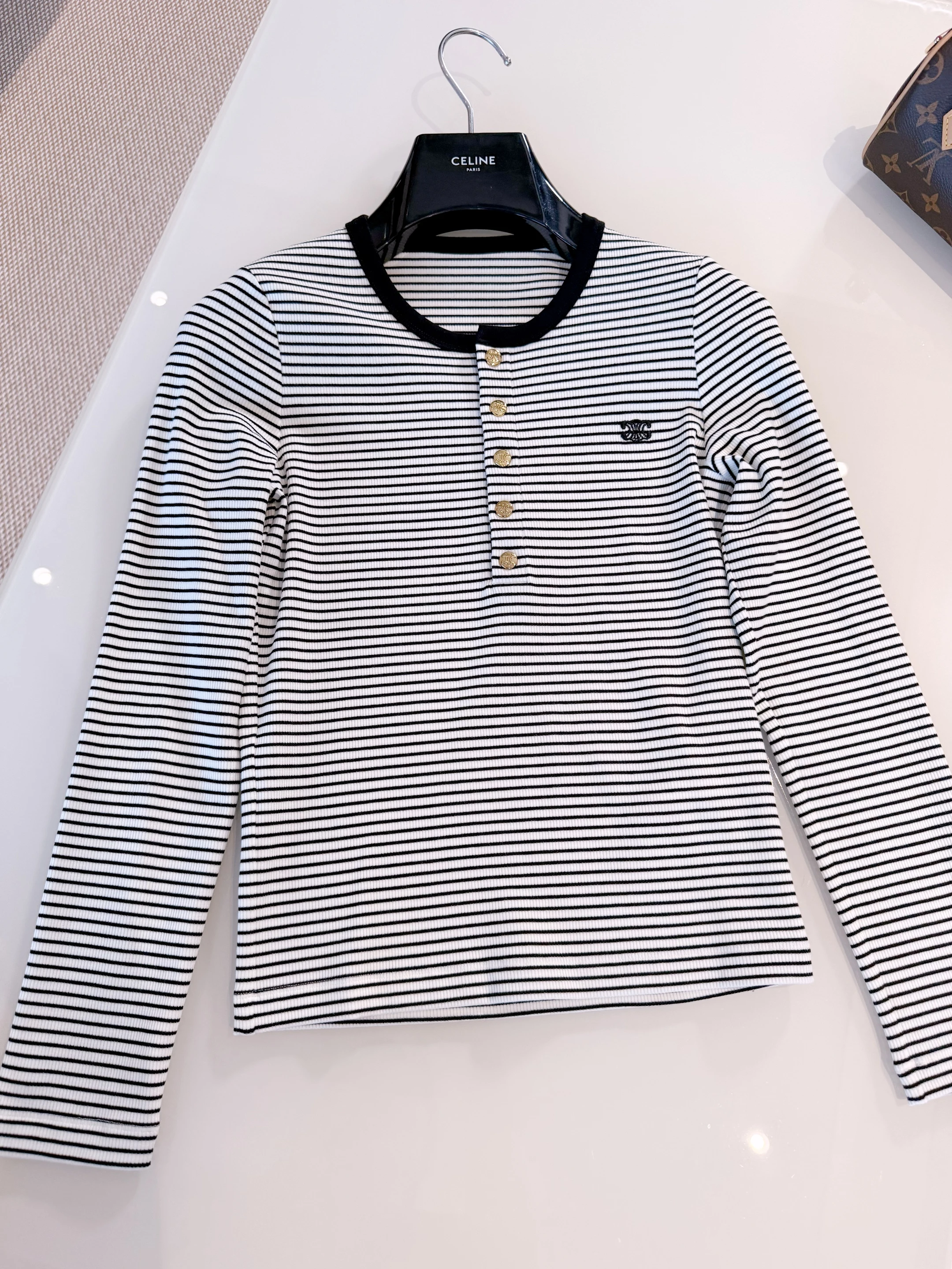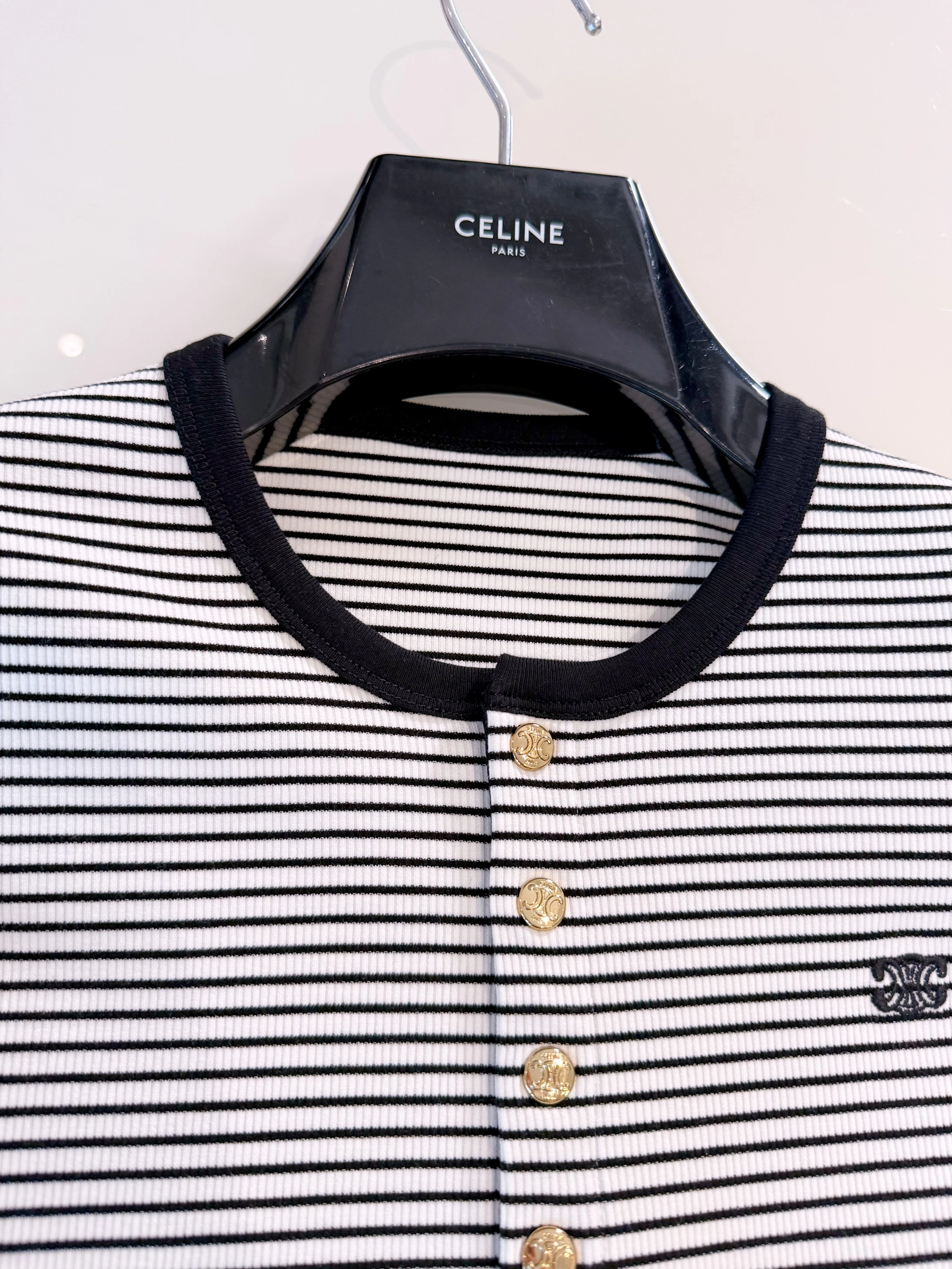 Изящный джемпер от CELINE выполнен из мягкого трикотажа с классическим принтом в тонкую черно-белую полоску. Модель с длинными рукавами, контрастной черной окантовкой горловины и рядом декоративных золотистых пуговиц на груди. На груди — миниатюрный логотип бренда, придающий образу лаконичный французский шарм. Приталенный силуэт и универсальный стиль делают этот джемпер идеальным выбором для повседневных и деловых образов.