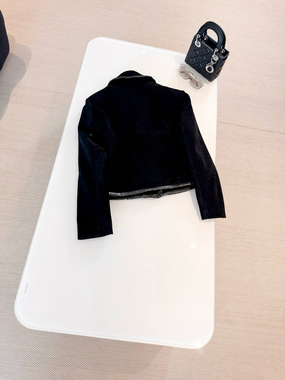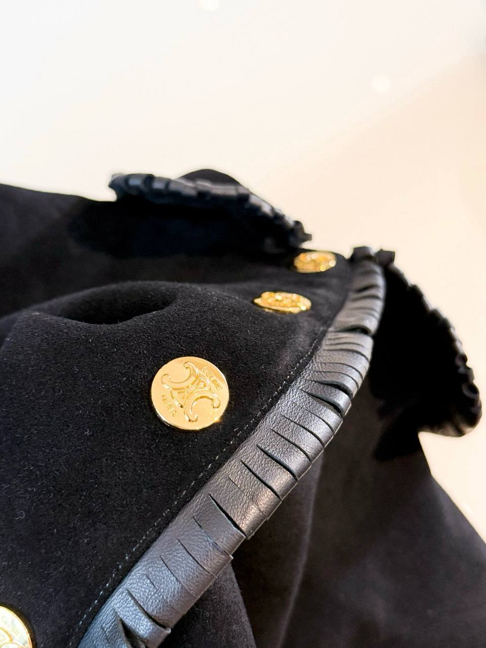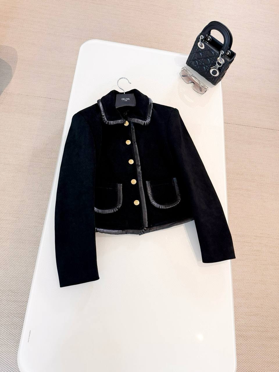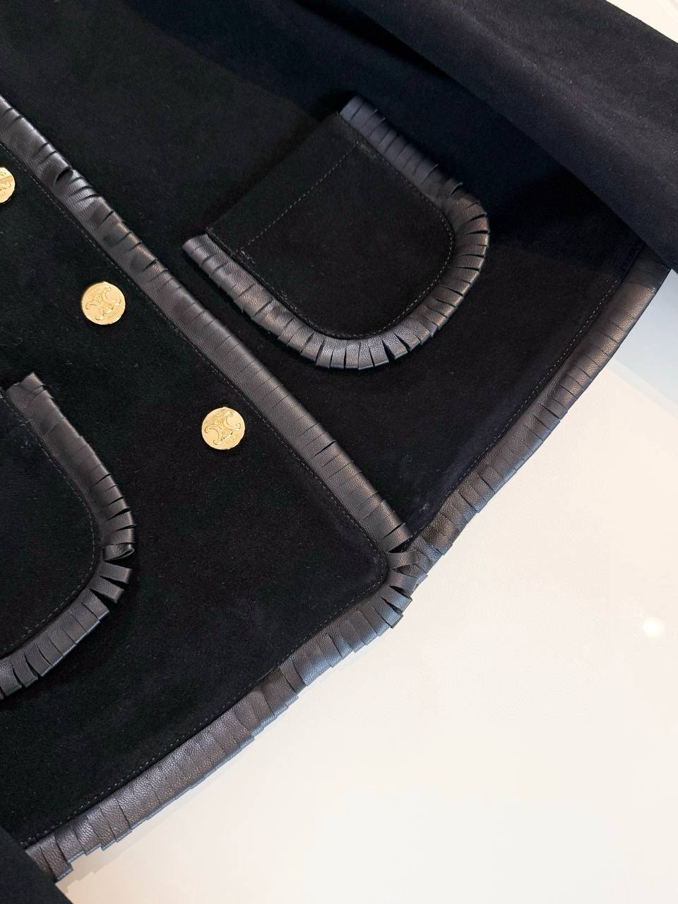 Элегантный пиджак от французского Дома моды CELINE — воплощение утонченного стиля и безупречного качества. Модель выполнена из премиальной мягкой овчины глубокого черного цвета, отлично держащей форму и приятной на ощупь. Особого шарма жакету придают отделка лакированной кожей по воротнику, краям и карманам, а также крупные золотистые пуговицы с фирменной символикой.