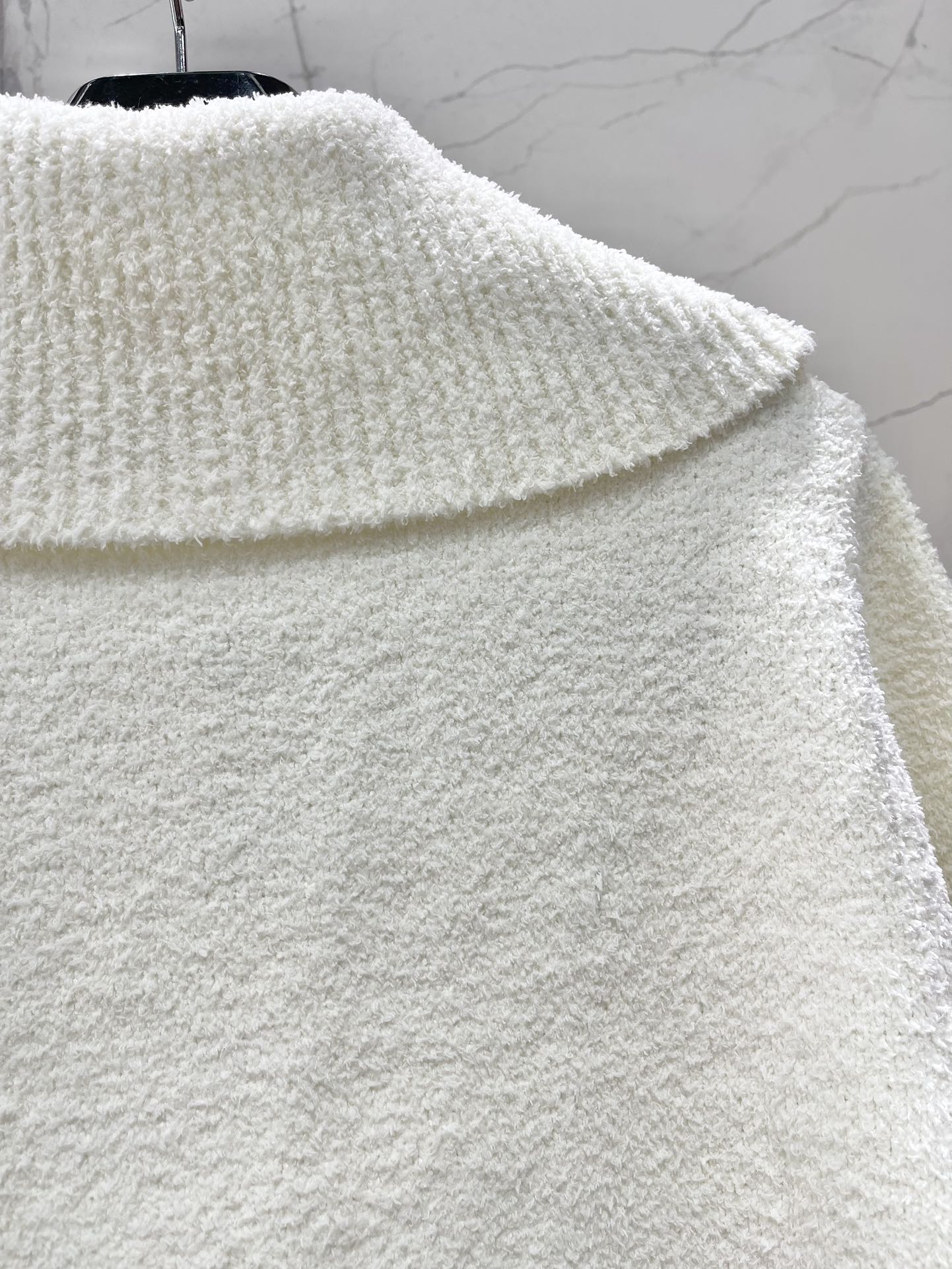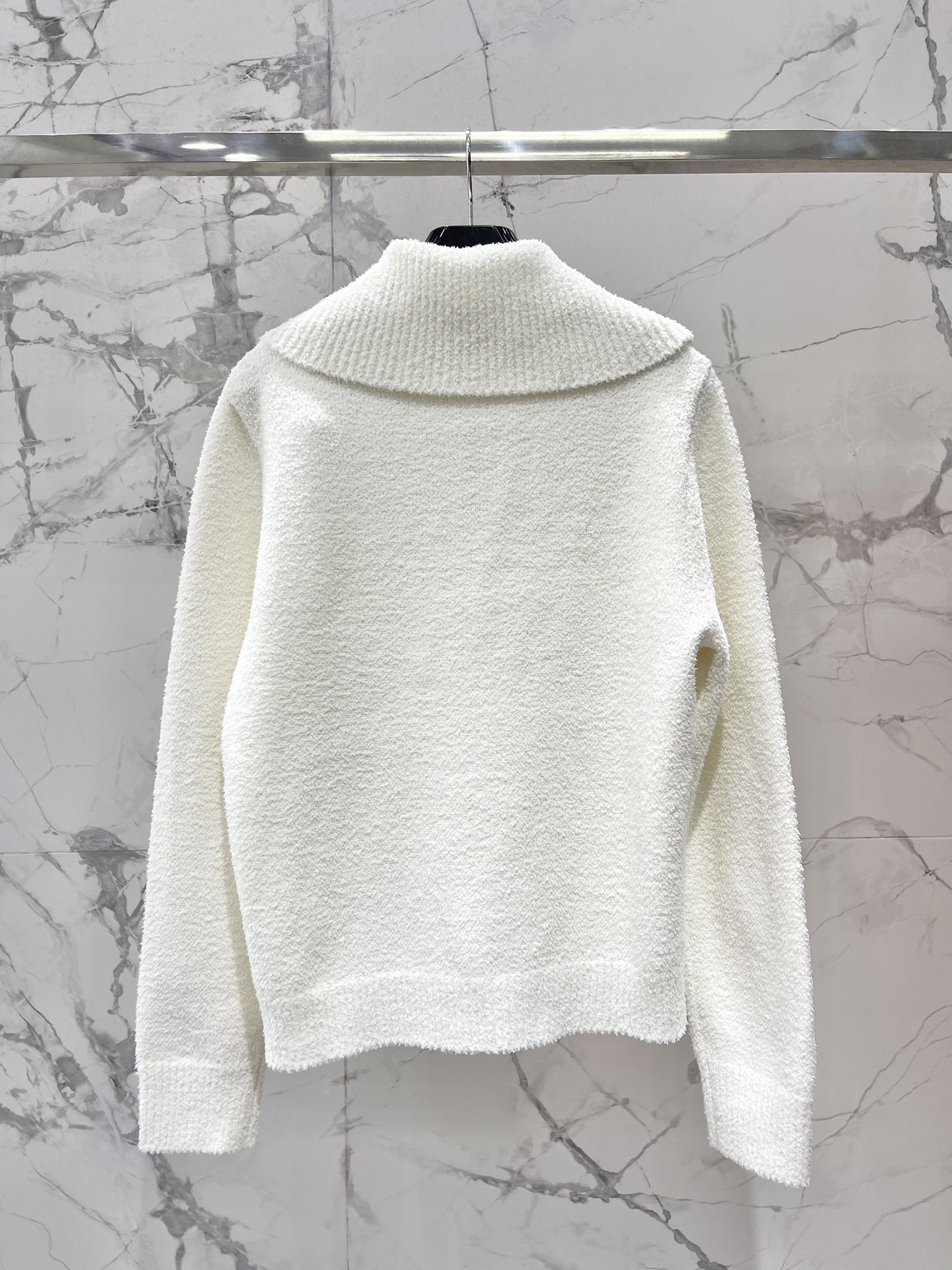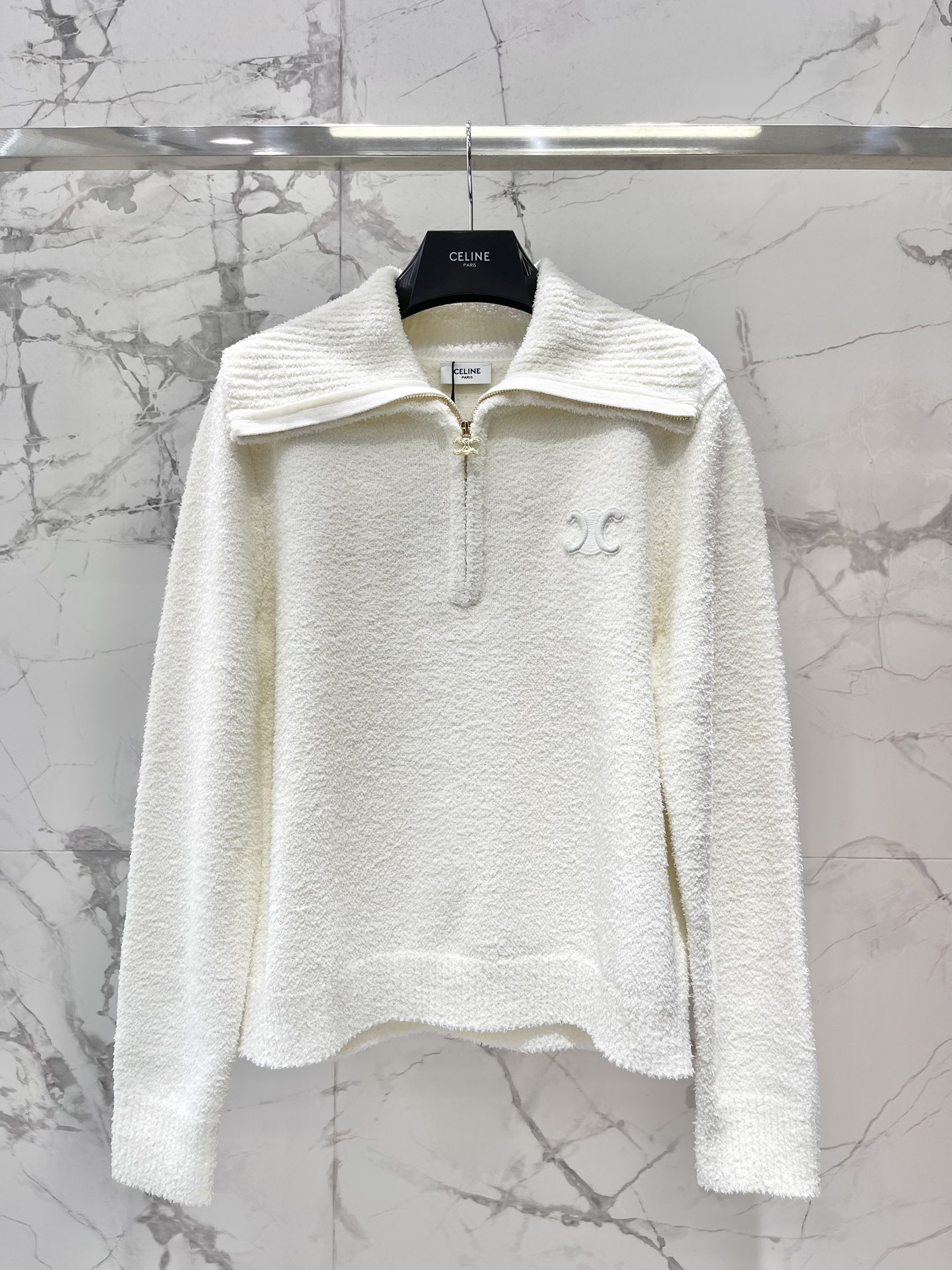 Пуловер выполнен из плотной текстурной ткани с мягкой «пушистой» поверхностью, обеспечивающей тепло и комфорт. Модель имеет отложной воротник средней ширины, который можно носить расправленным или слегка подпущенным, и полузастёжку на молнию по линии горловины — практичная деталь для регулировки тепла и создания разных образов. На груди — тонкая вышивка фирменного логотипа CELINE, лаконичная и сдержанная, подчёркивающая статус и стиль изделия. Приталенный, но свободный силуэт обеспечивает комфорт при носке, манжеты и нижний край выполнены в том же фактурном исполнении, аккуратно оформляя форму.