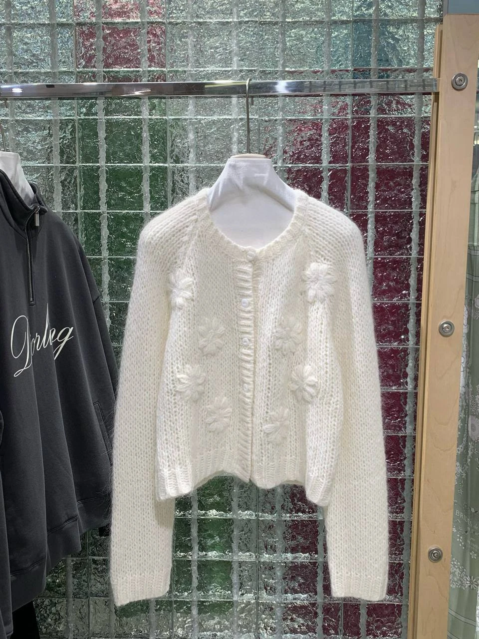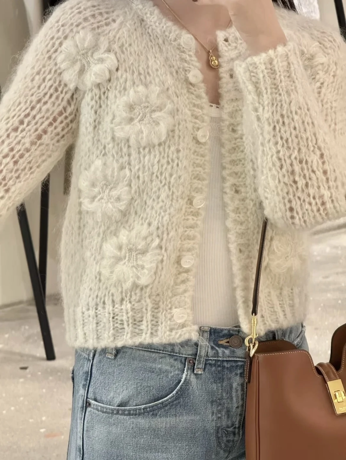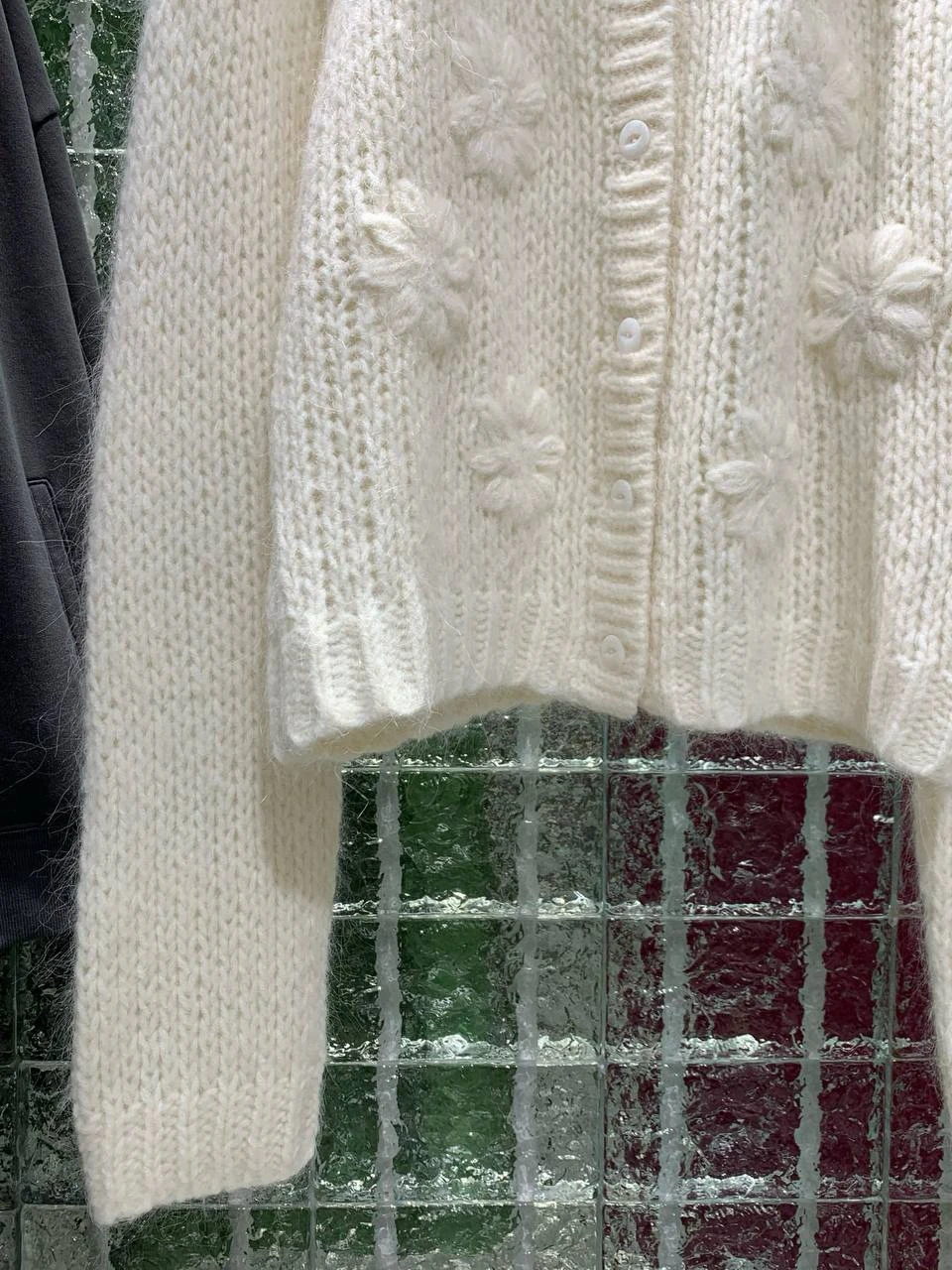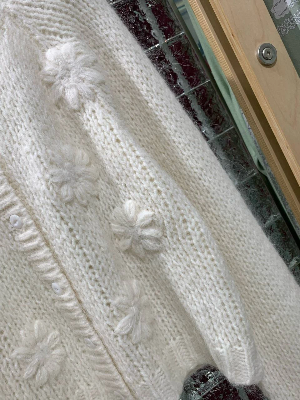 Особое внимание дизайнеры уделили отделке: на поверхности кардигана расположены объёмные вязаные цветы с деликатной фактурой, придающие изделию женственность и шарм. Модель украшена крупными фактурными пуговицами в тон основного материала, что подчёркивает её сдержанную элегантность.