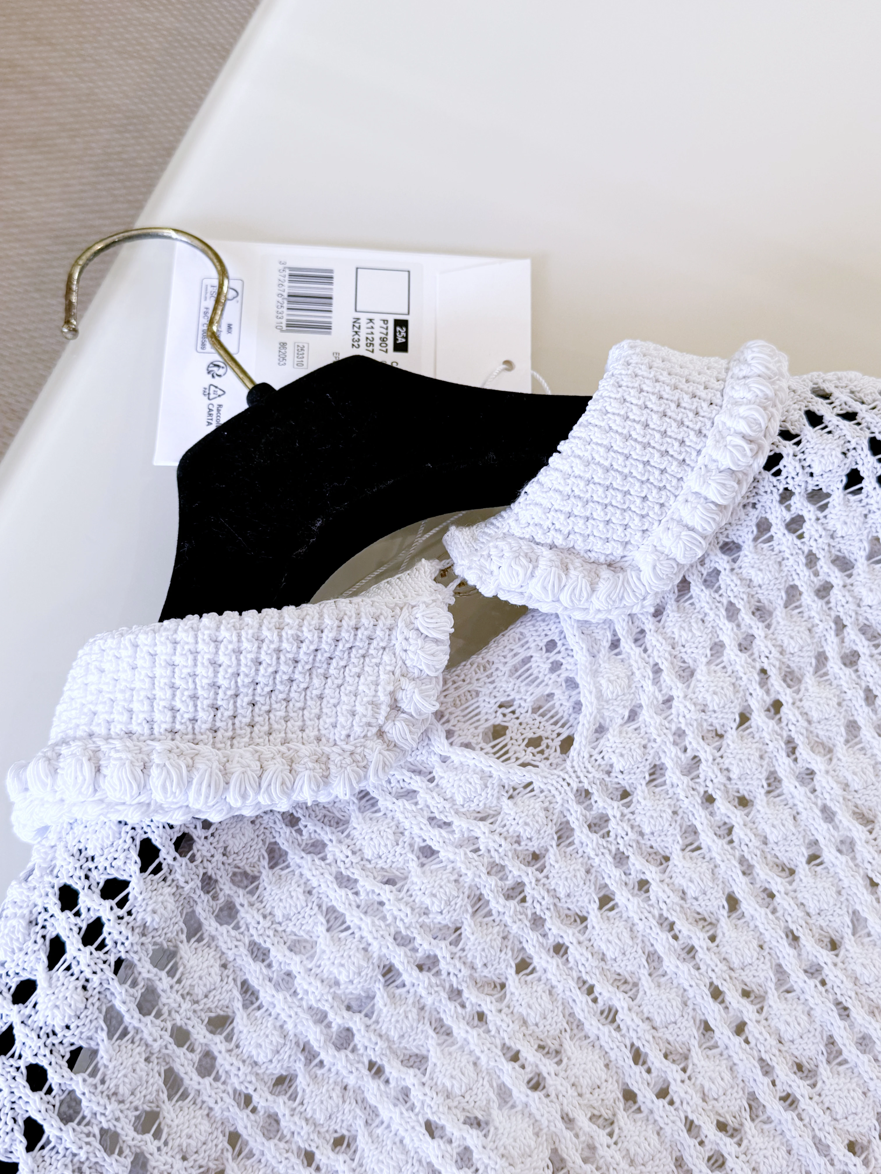 • Вязка: художественная ажурная структура с плотной окантовкой по низу изделия, манжетам и воротнику для аккуратной формы.