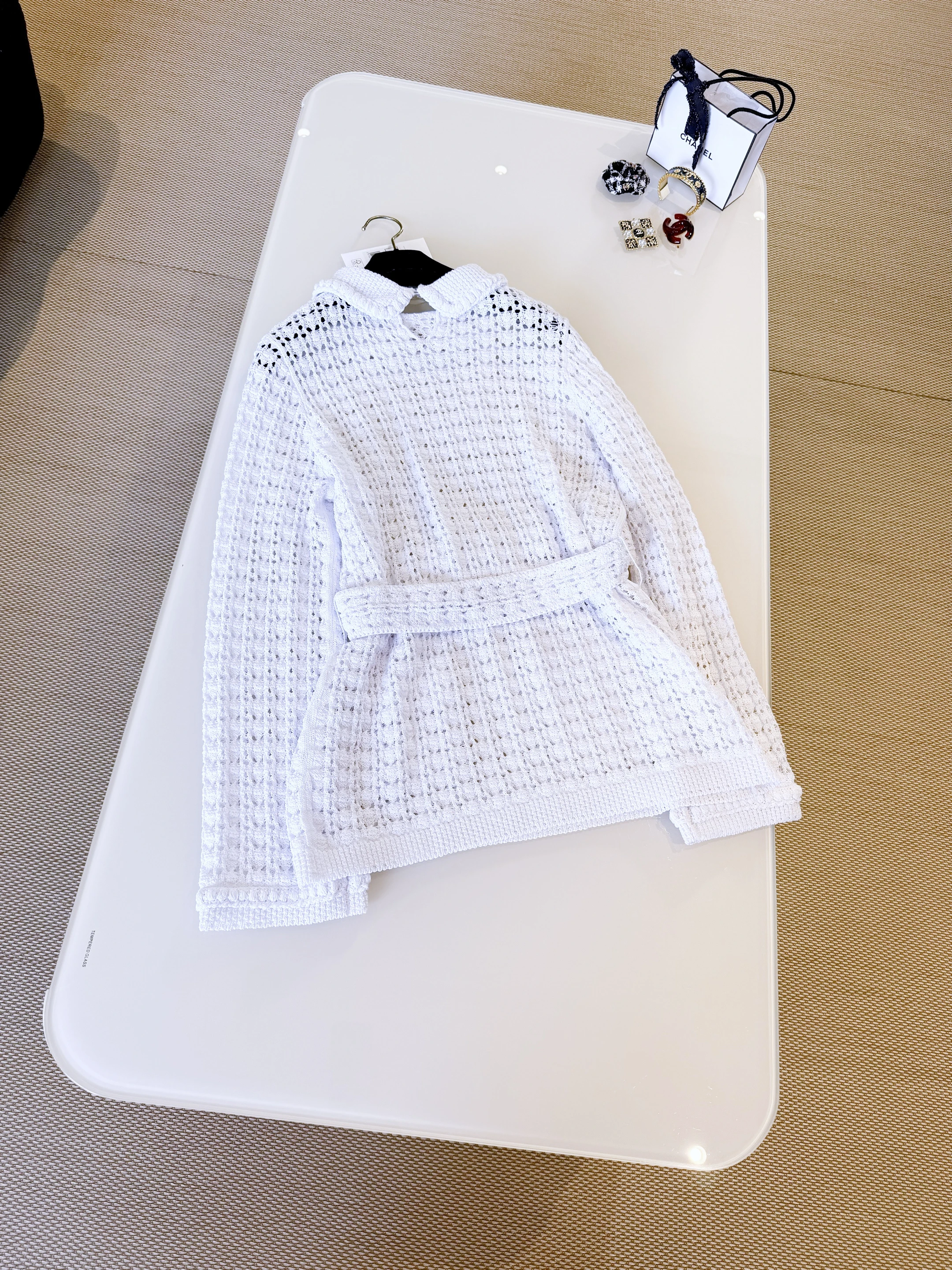 • Застёжка и пояс: модель дублируется съемным поясом из той же вязки с обтянутой пряжкой, позволяющим фиксировать талию и варьировать силуэт.