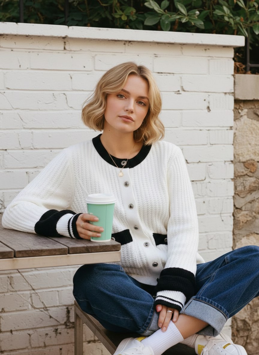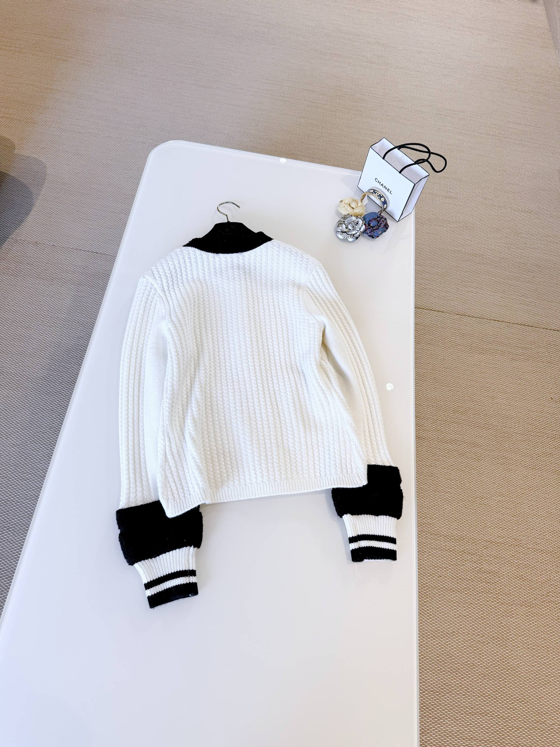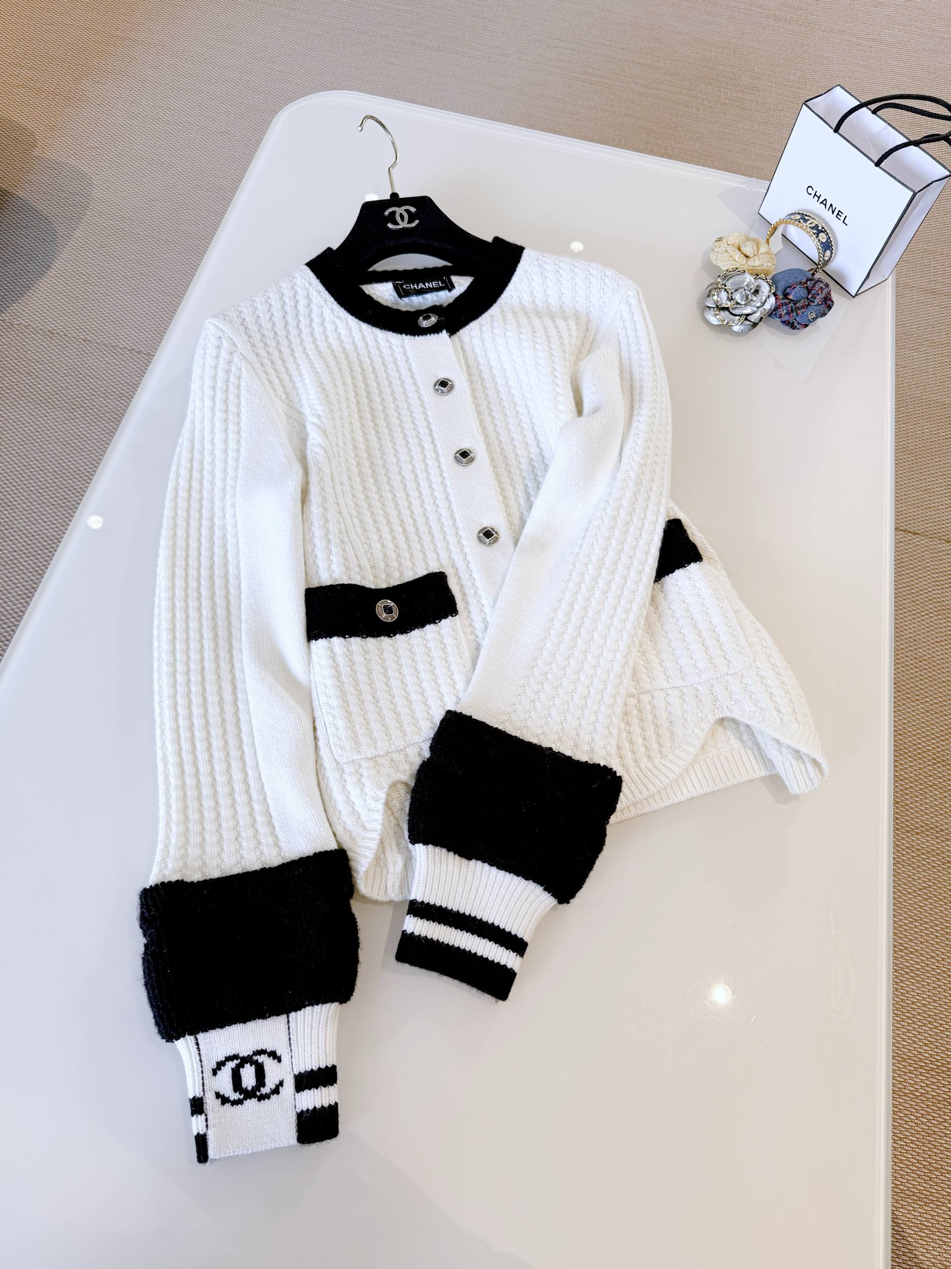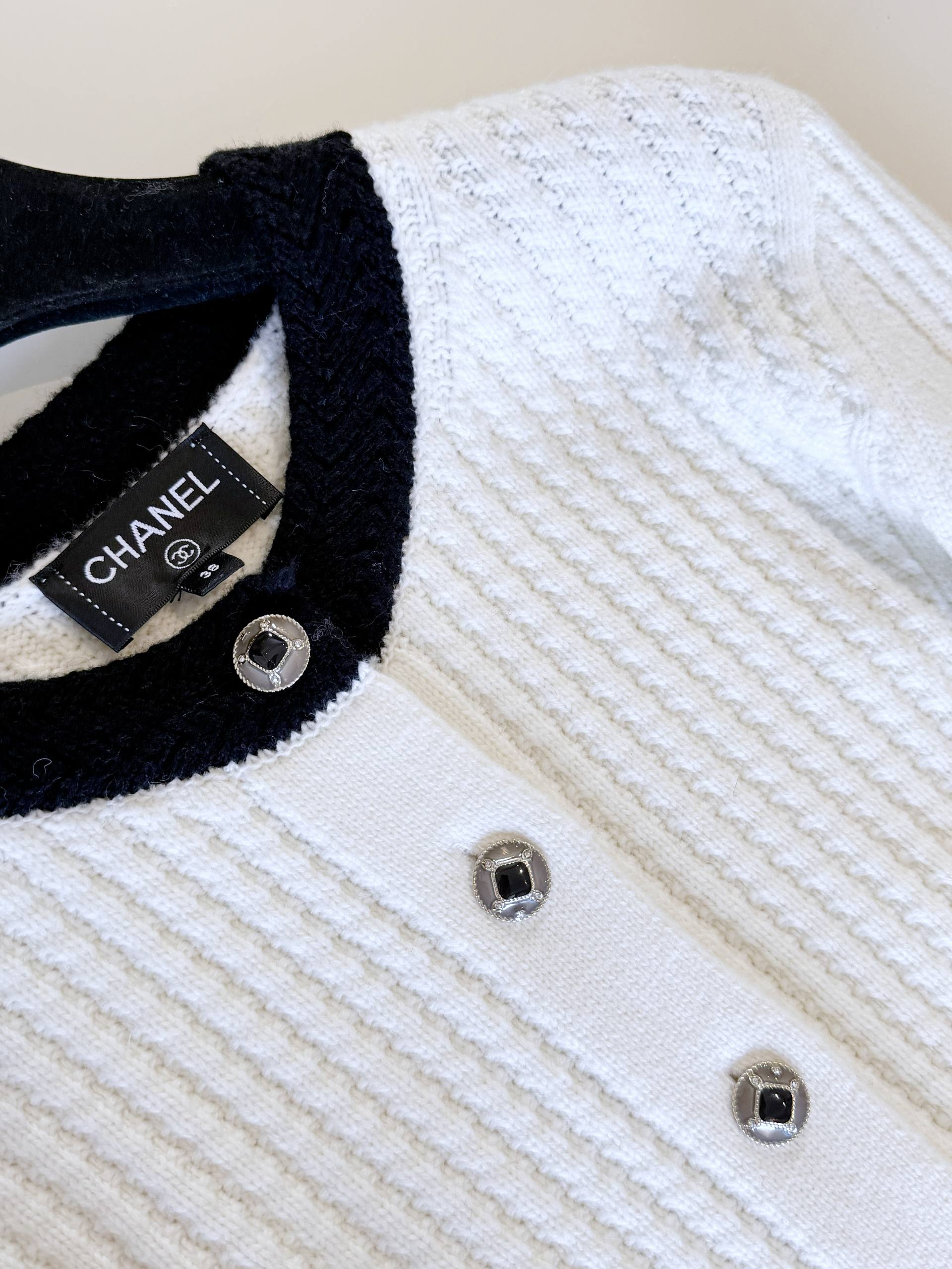 CHANEL Женский белый джемпер с контрастной чёрной отделкой