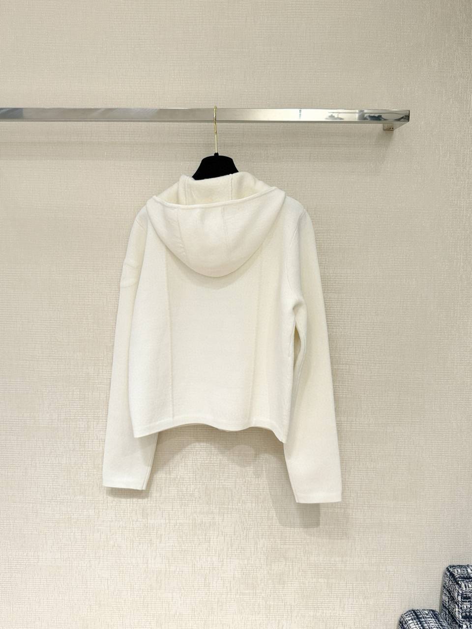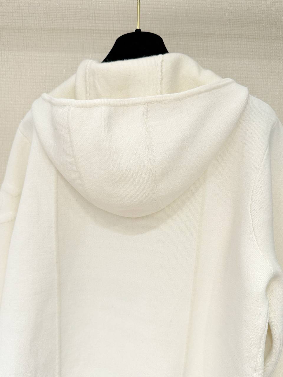 Кардиган выполнен из плотного, мягкого трикотажа с деликатной текстурой, которая держит форму и обеспечивает комфорт при носке. Модель застёгивается на потайную молнию по всей длине, имеет аккуратный капюшон с мягким воротником и прямой посадкой, немного укороченную длину до линии бедра. Две накладываемые карман‑пэтч по переду добавляют практичности и завершают сдержанный силуэт. Внимание к деталям подчёркивают фирменные декоративные пуговицы на карманах и тонкая фирменная деталь на рукаве.