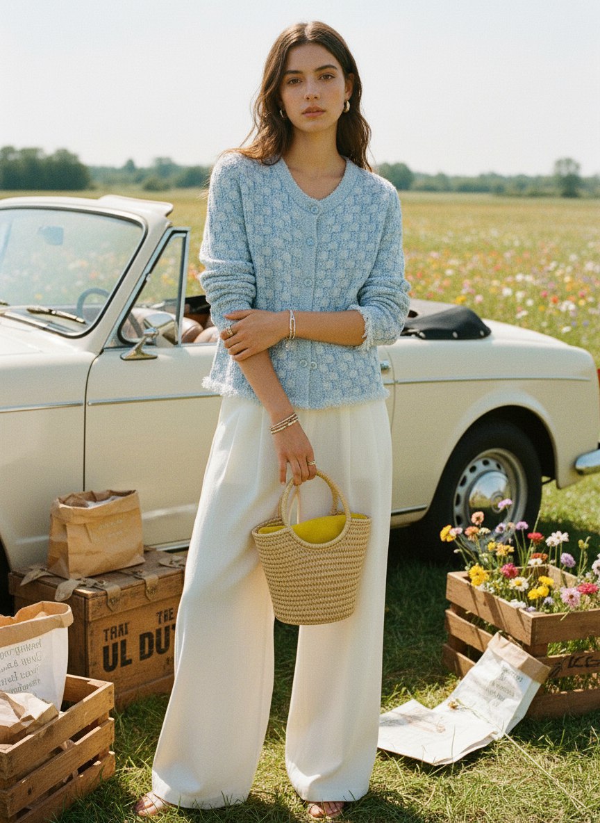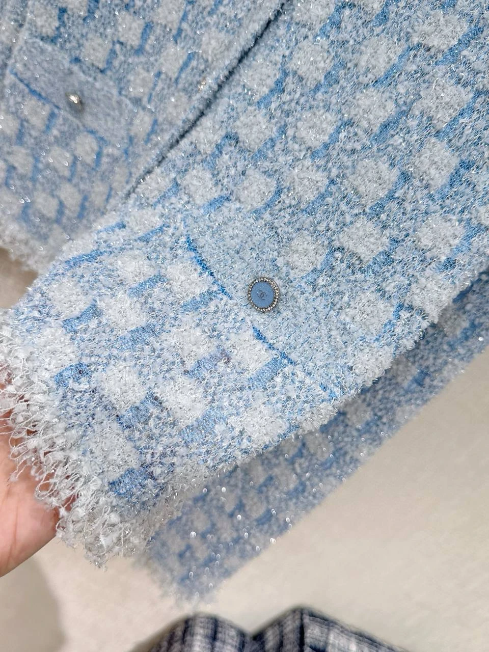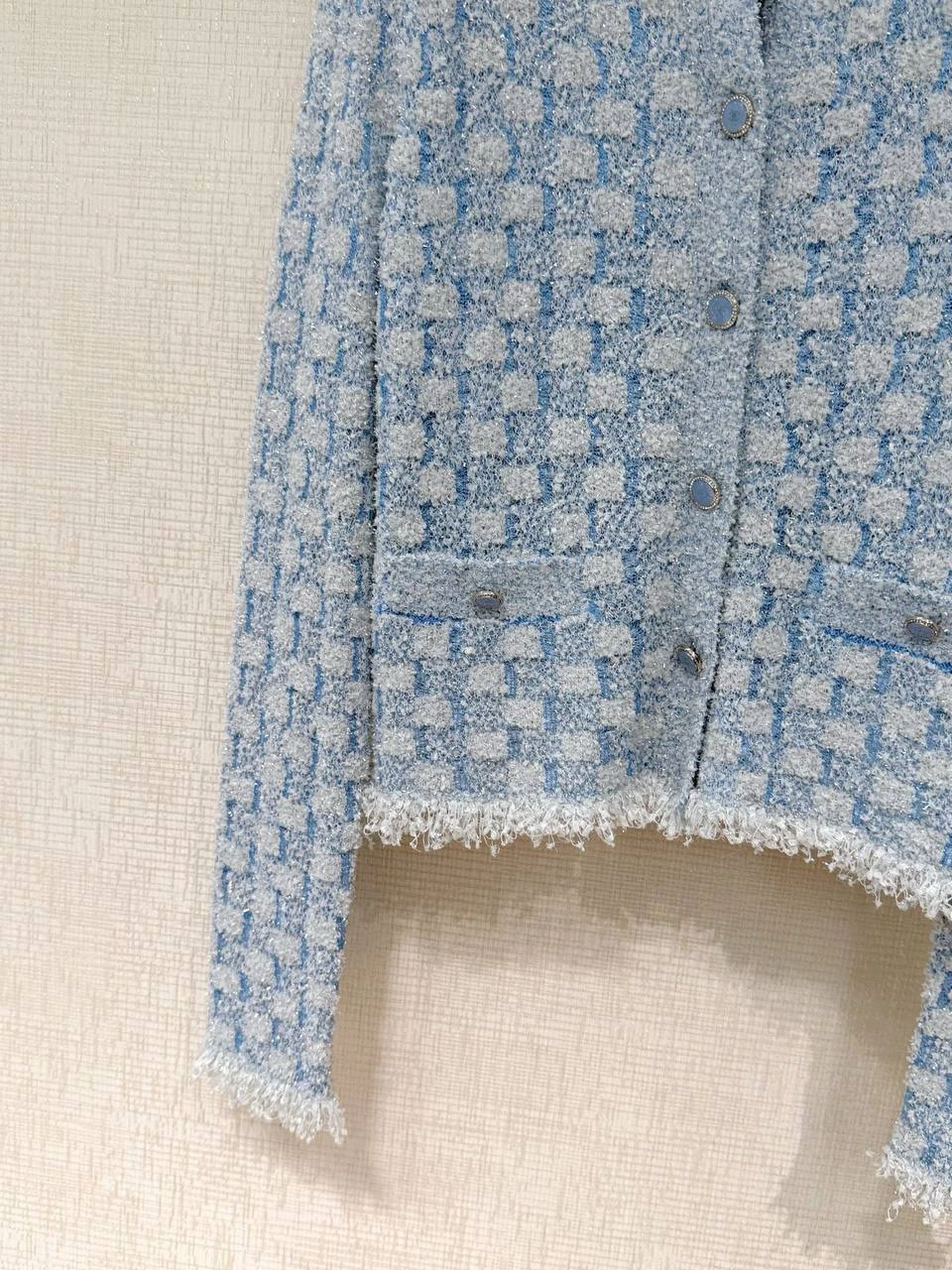 • Фактура и цвет: мягкий букле-твид со структурированным мелким узором в сочетании светло-голубого и белого — деликатная пастельная гамма, которая легко сочетается с нейтральными и контрастными оттенками.