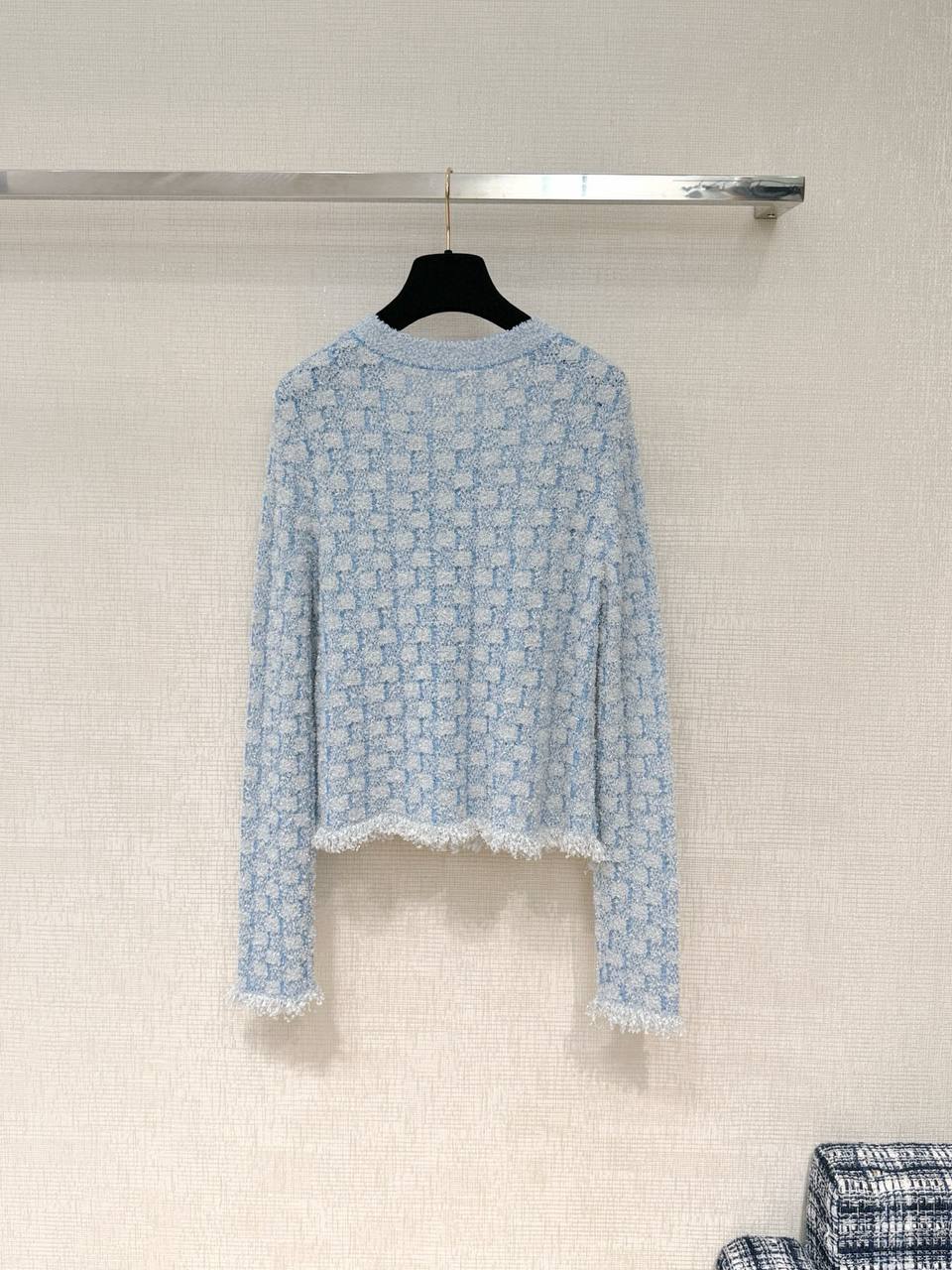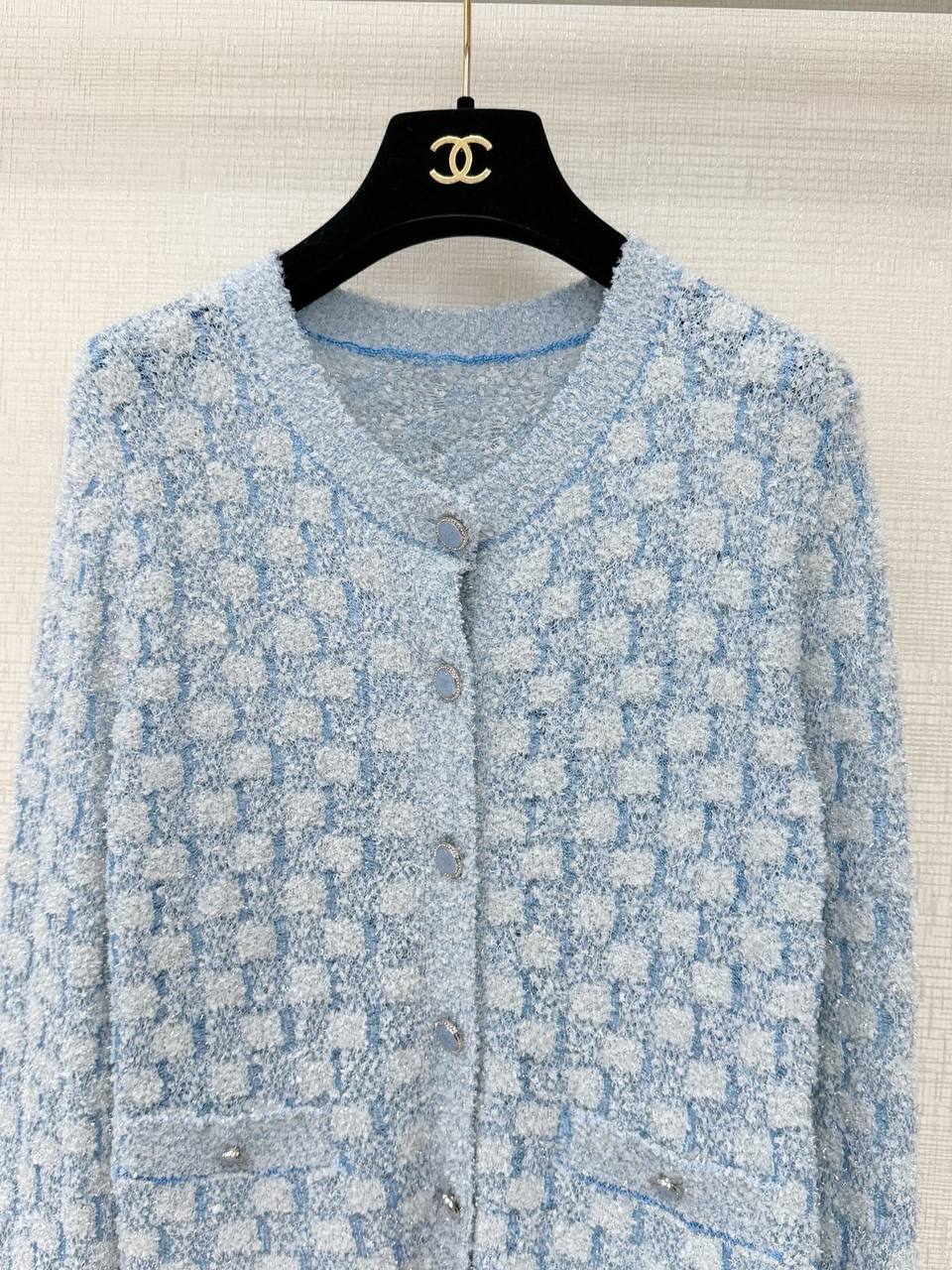 Изысканный кардиган в духе классических кутюрных жакетов CHANEL — выполнен из мягкого букле-твида светло-голубого и белого оттенков с мелким фактурным узором. Идеальная вещь для элегантного повседневного образа и делового гардероба.