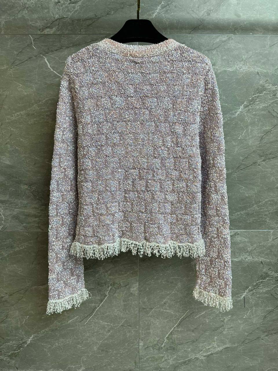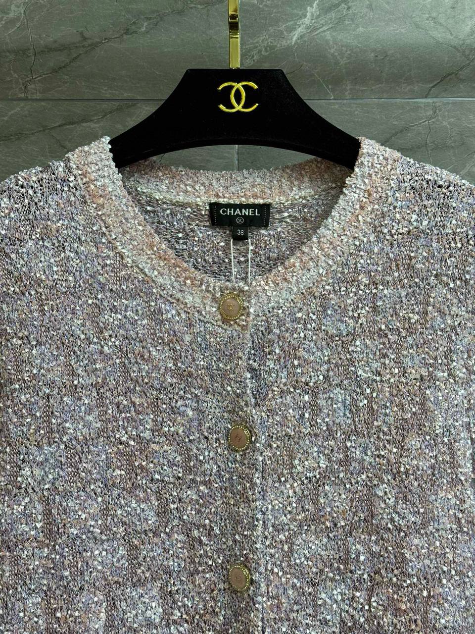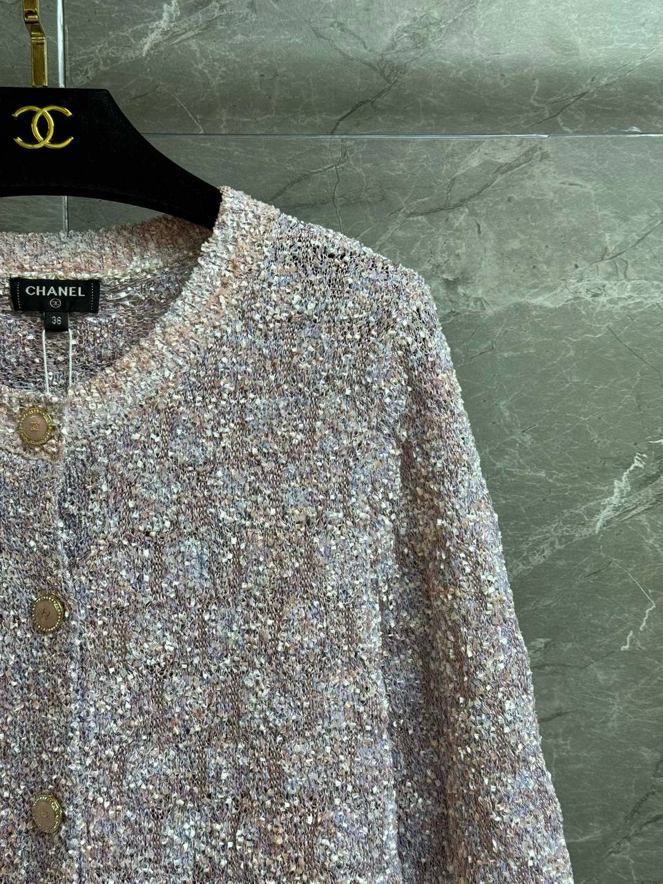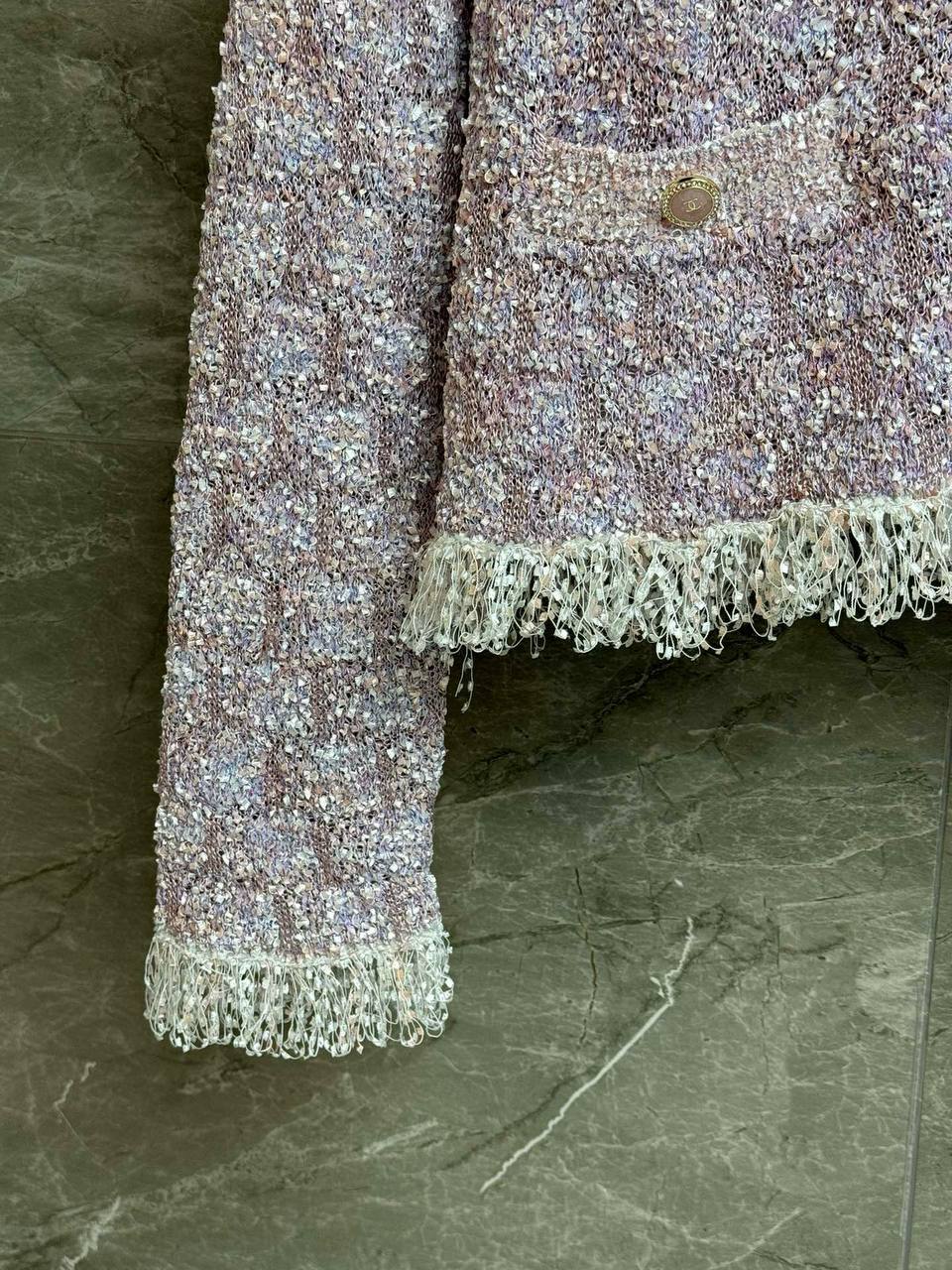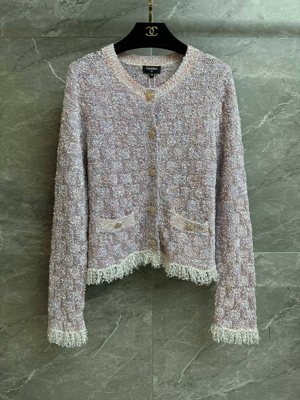 Изысканный кардиган CHANEL в классическом твидовом стиле — лёгкий укороченный силуэт с мягкой текстурой и деликатным мерцанием. Идеальный вариант для элегантного повседневного образа и вечерних сочетаний.