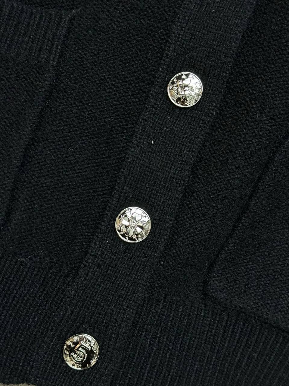 Женский кардиган CHANEL из шерсти — утончённая и нарядная модель, сочетающая классический силуэт и броскую декоративную деталь.