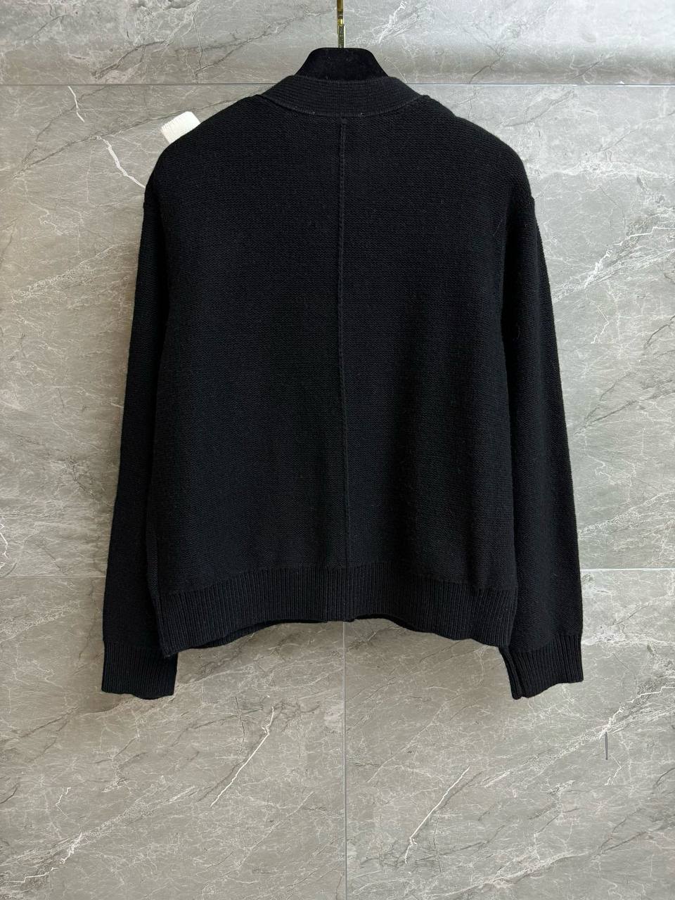 • Материал: плотная шерстяная вязка чёрного цвета — тёплая и приятная на ощупь. Модель без подкладки, с аккуратной текстурой вязки.