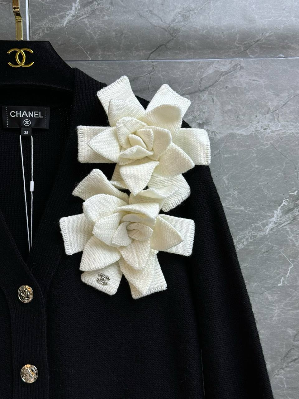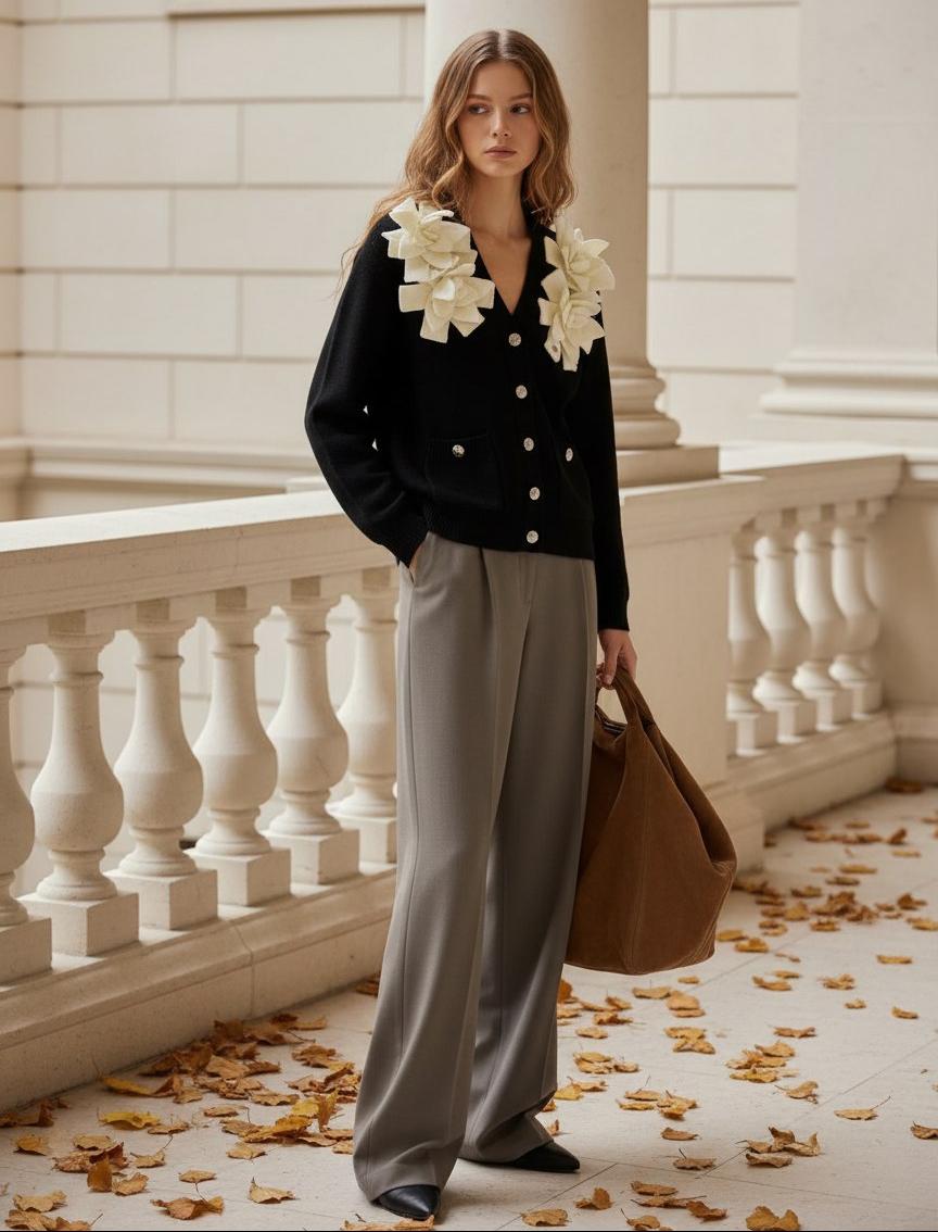 • Декор: выразительные крупные вязаные камелии кремового/айвори оттенка, расположенные по обеим сторонам плечевого шва — создают фирменный, романтичный акцент и придают образу объём.