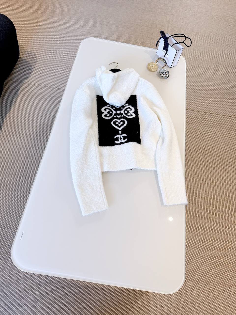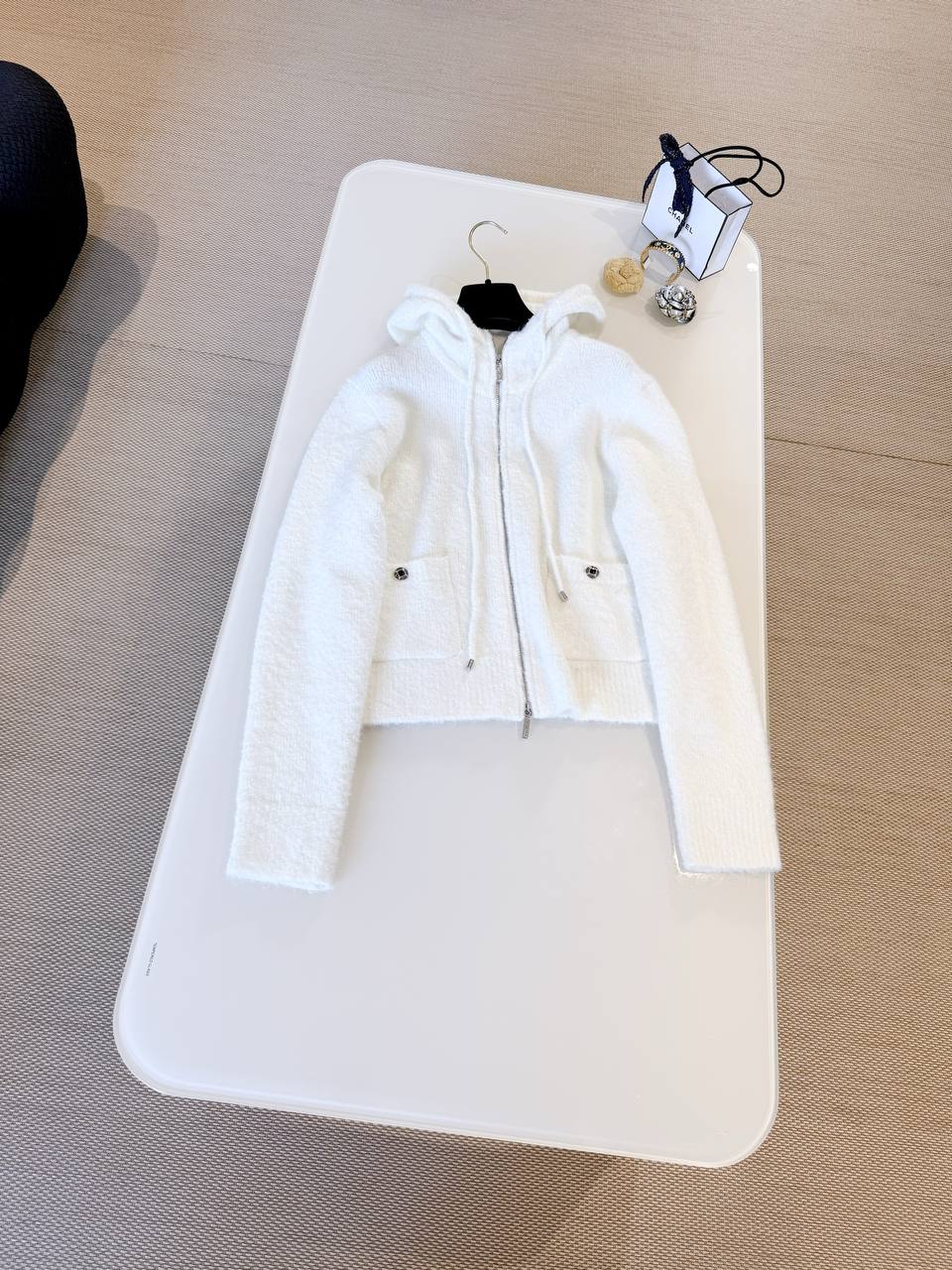 Изысканный укороченный кардиган CHANEL из мягкой текстурированной шерсти в чистом белом оттенке. Сдержанная, но современная модель сочетает в себе комфорт в повседневной носке и утончённые декоративные детали — идеальный выбор для многослойных образов и элегантных городских ансамблей.