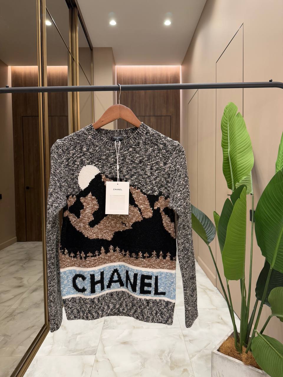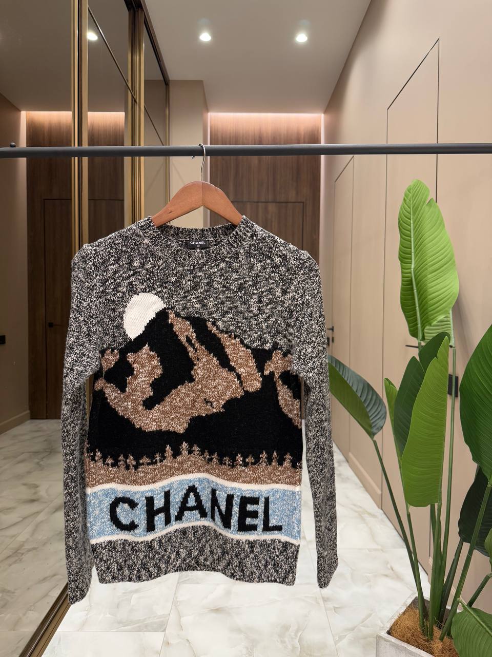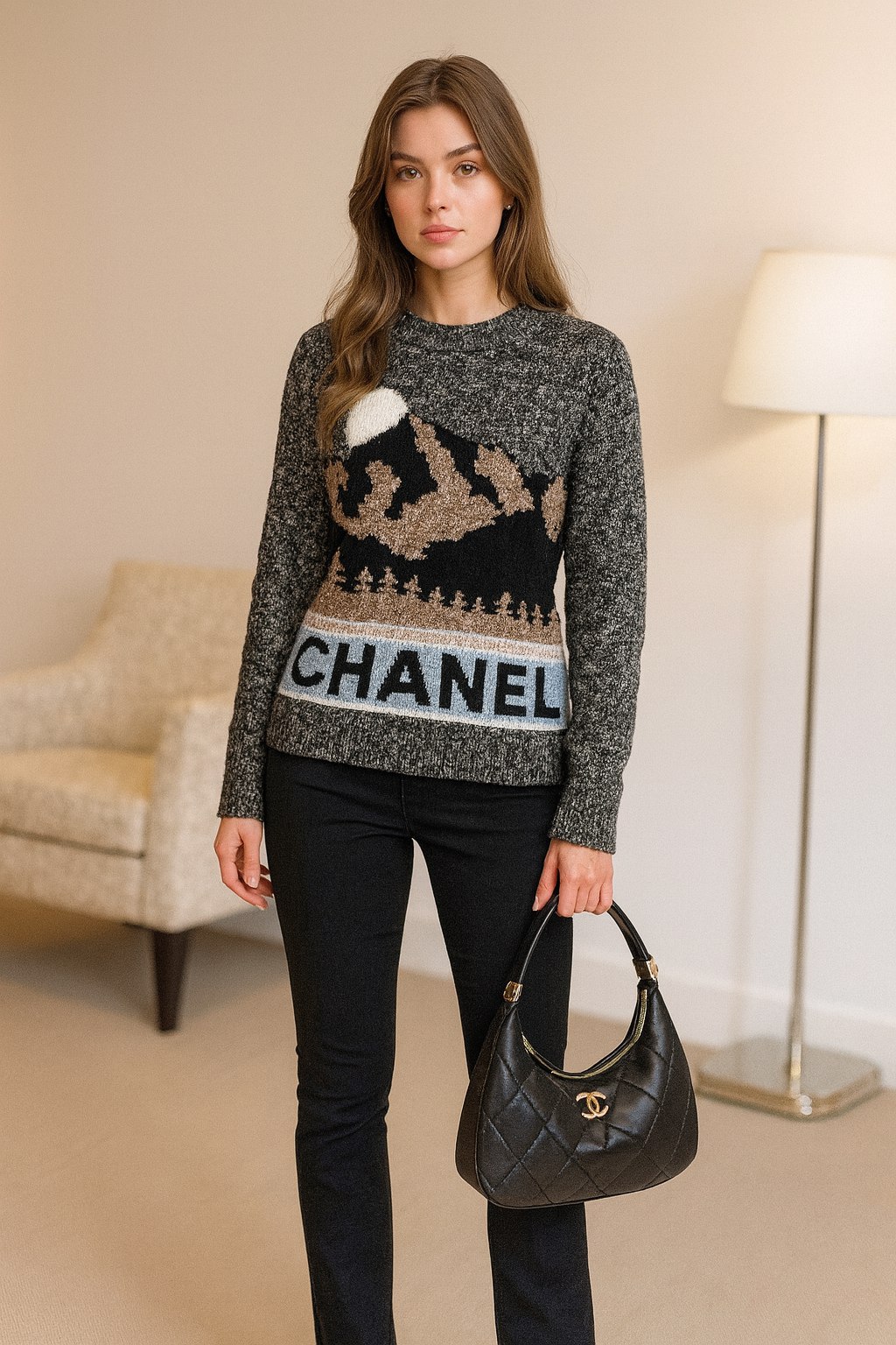 Уютный и изысканный свитер CHANEL, выполненный из мягкой смеси шерсти и кашемира. Стильный рисунок в пейзажной гамме и фирменная надпись CHANEL придают модели выразительный, но сдержанный характер — идеальный выбор для городских образов и загородных прогулок в прохладную погоду.