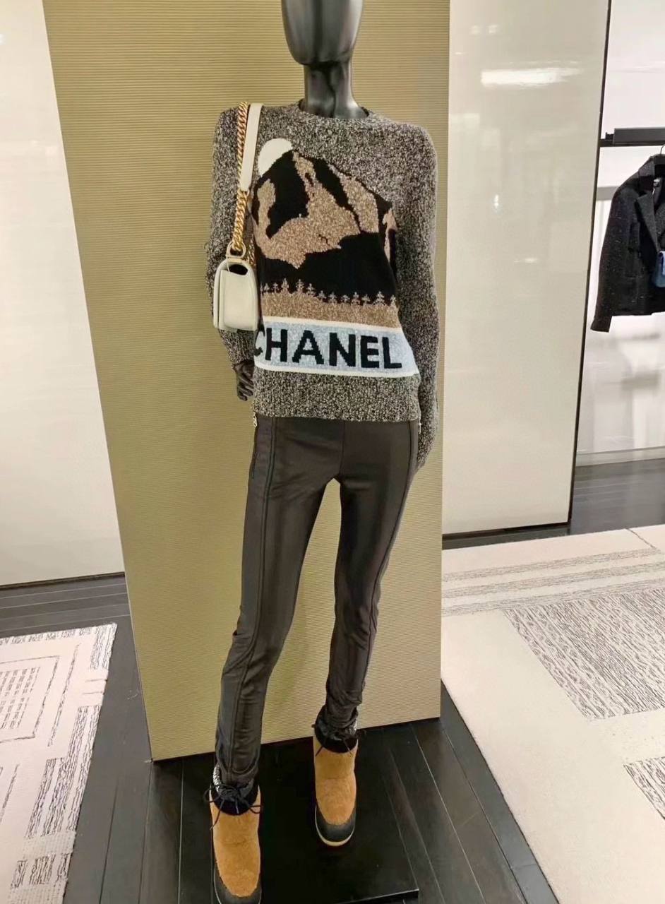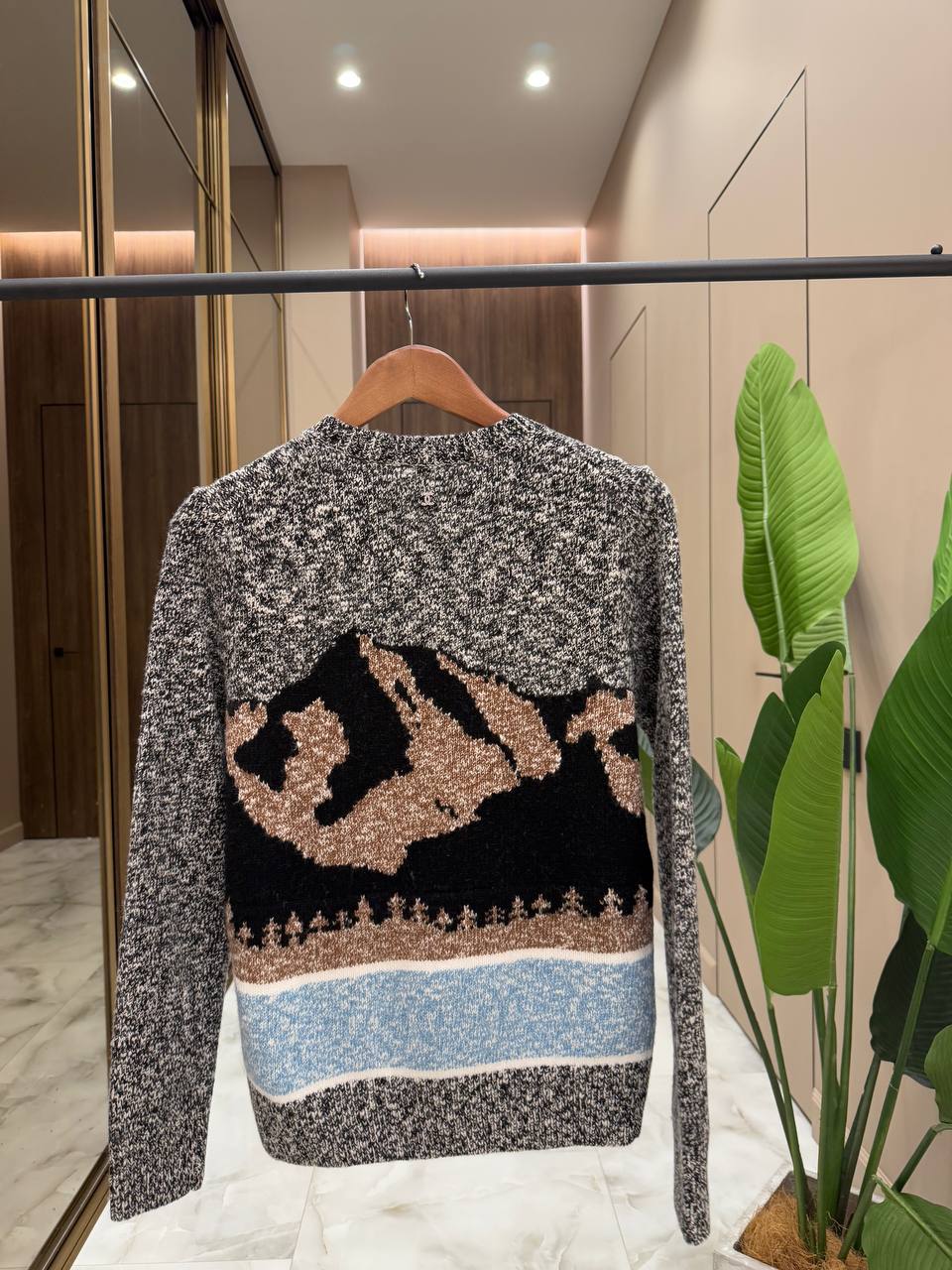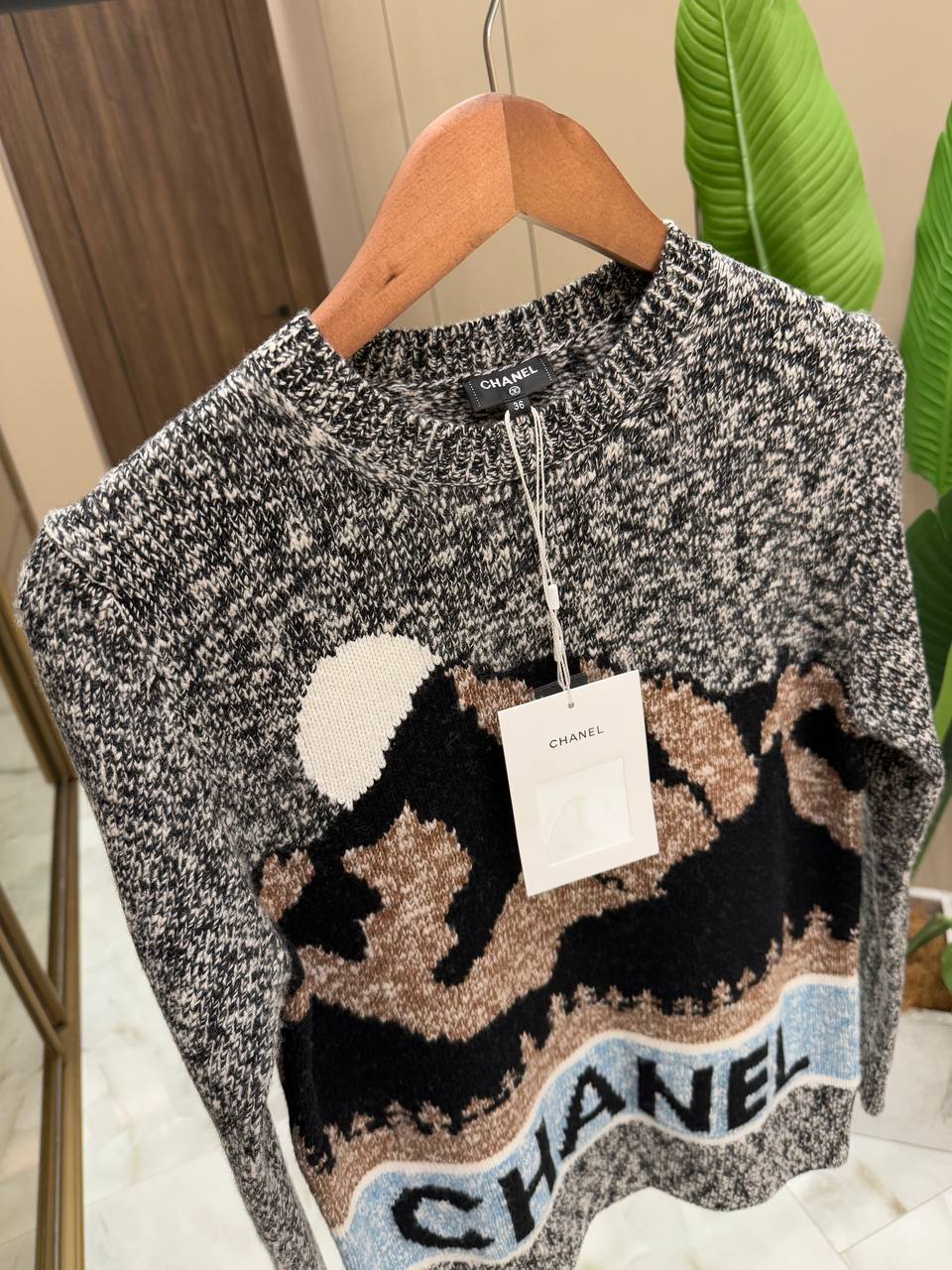 Уютный и изысканный свитер CHANEL, выполненный из мягкой смеси шерсти и кашемира. Стильный рисунок в пейзажной гамме и фирменная надпись CHANEL придают модели выразительный, но сдержанный характер — идеальный выбор для городских образов и загородных прогулок в прохладную погоду.