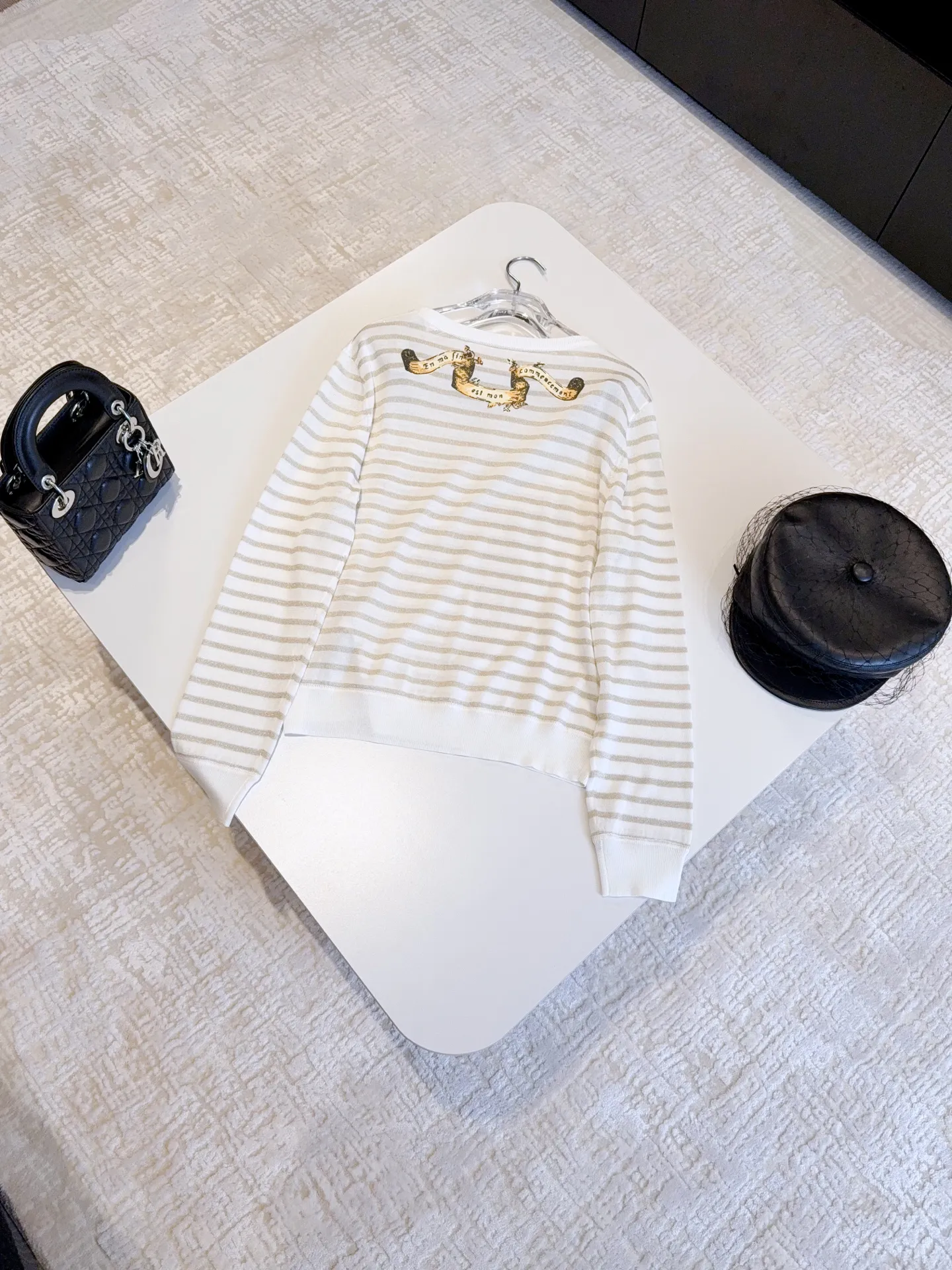 Этот трикотажный джемпер в золотистых и белых тонах прекрасно сочетает в себе классические элементы и современный стиль. Пятиконечная звезда с цветочным узором добавляет уникальности и изысканности, подчеркивая бренд дома. Льняная смесь обеспечивает легкость и комфорт, а ребристые отделки придают изделию утонченный вид.