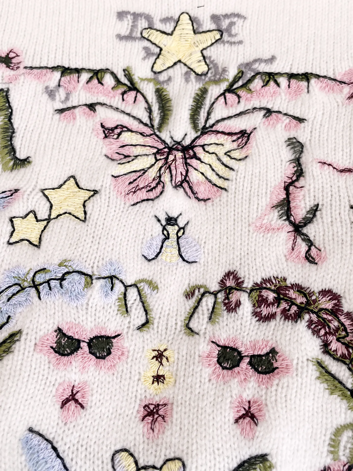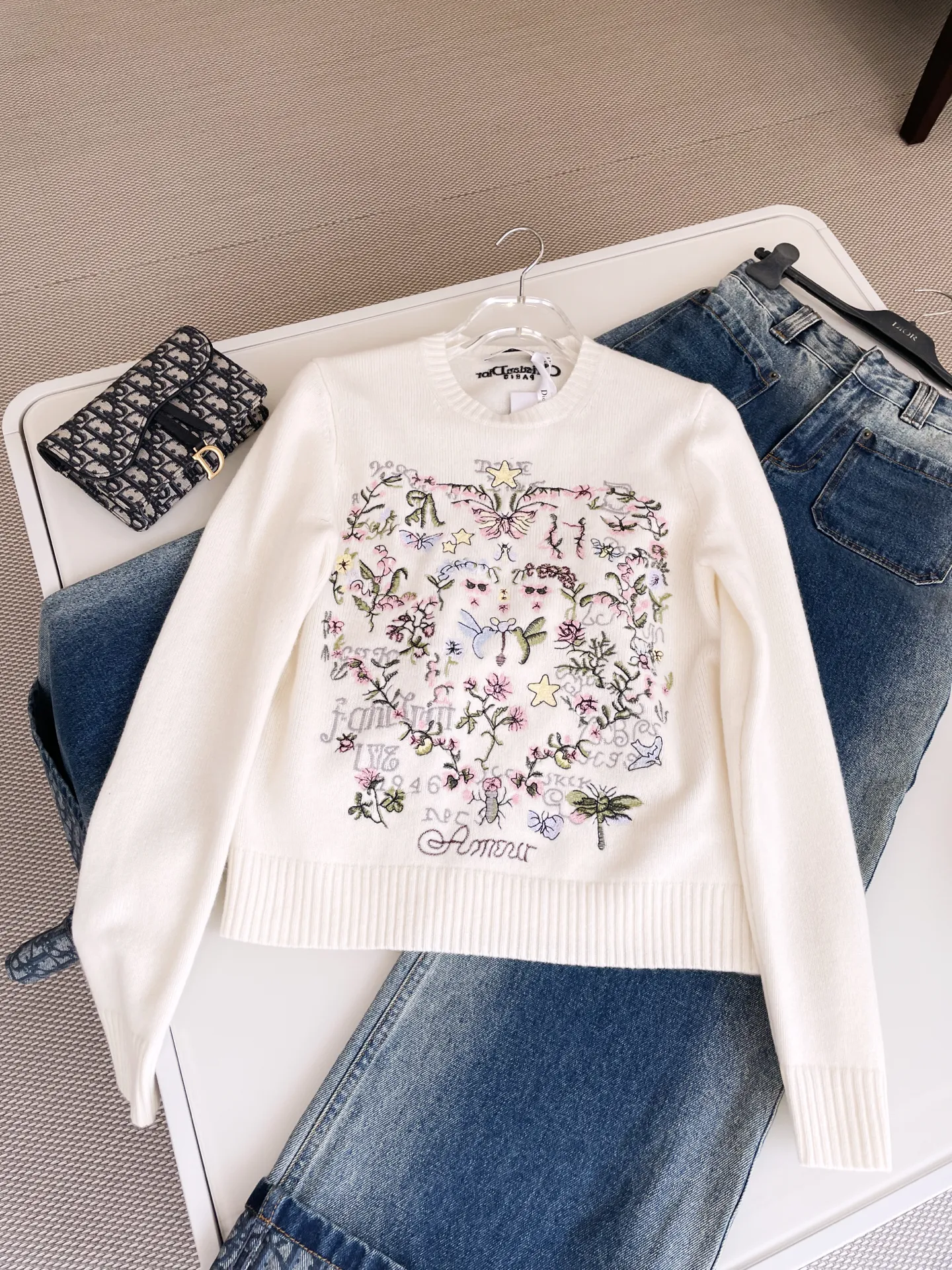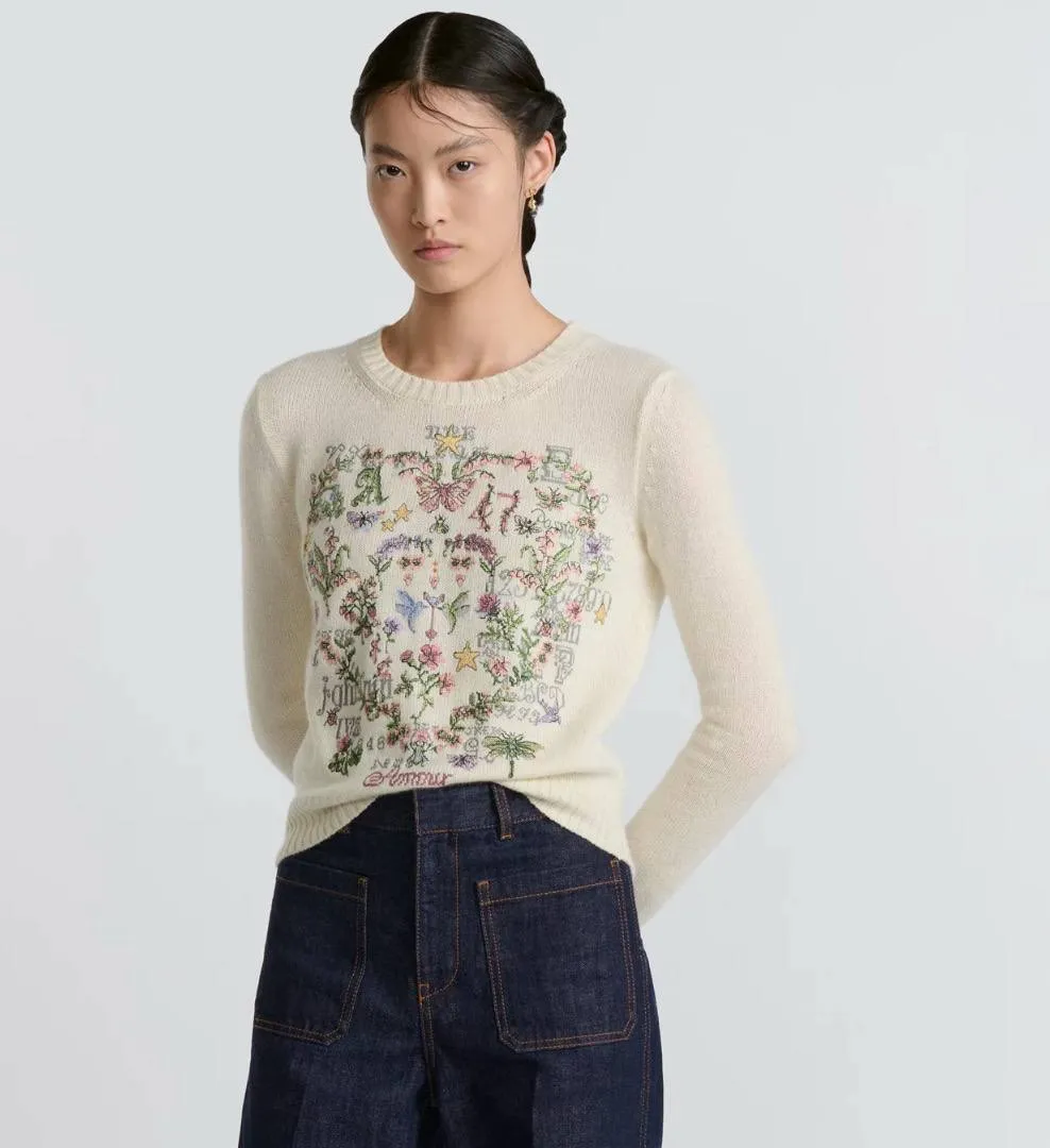Погрузитесь в мир роскоши и утонченности с этим кашемировым свитером кремового оттенка. Искусная вышивка изображает порхающих бабочек, изящных стрекоз и нежные цветы, создавая сложный и привлекательный узор. Лимитированная серия "Amour" отличается уникальными деталями: символическими сердечками и фирменным логотипом. Эффект имитации ручной вышивки крестиком придает винтажный вид, подчеркивая мастерство исполнения и делая этот свитер не просто одеждой, а настоящей ценностью.