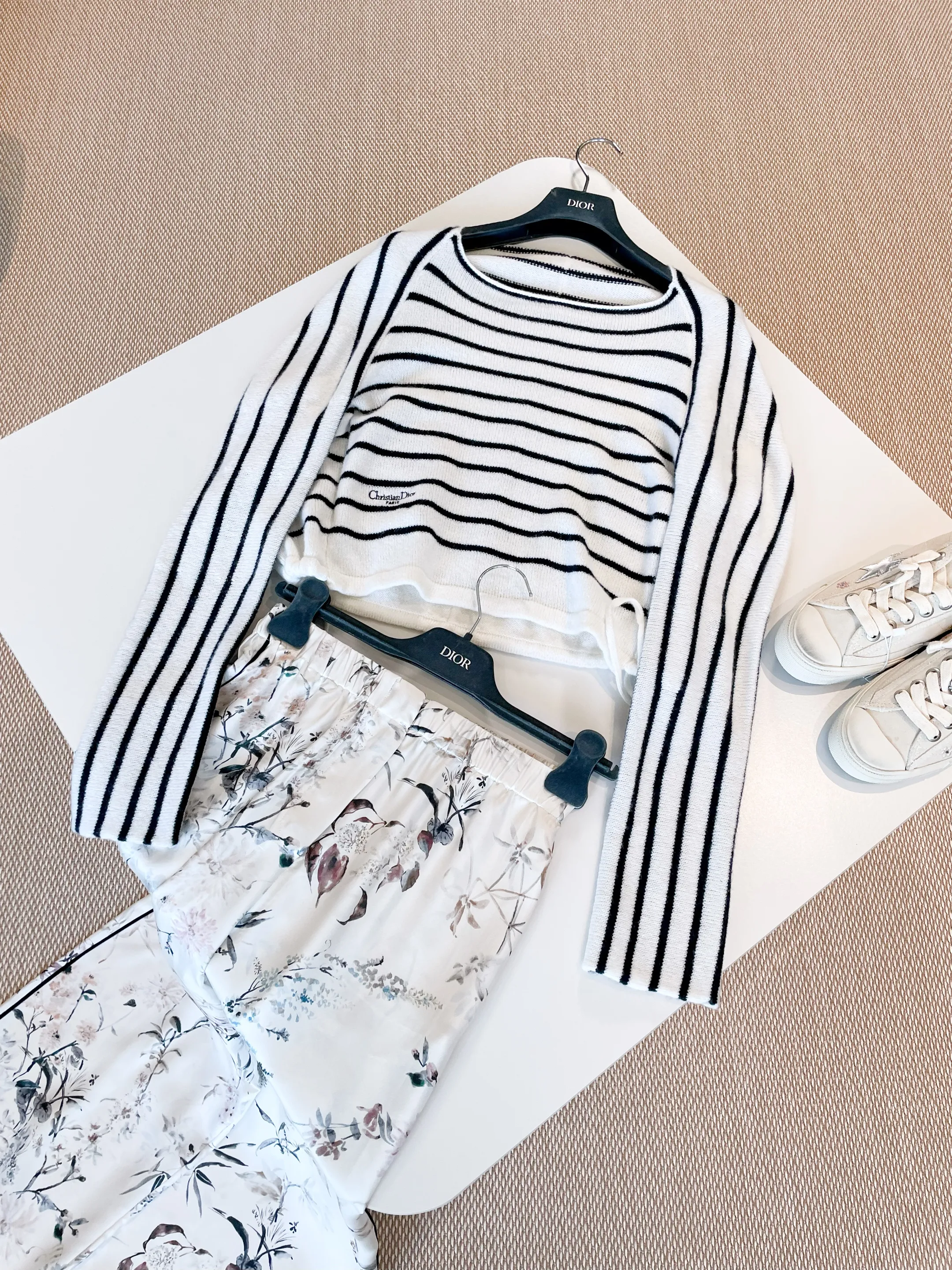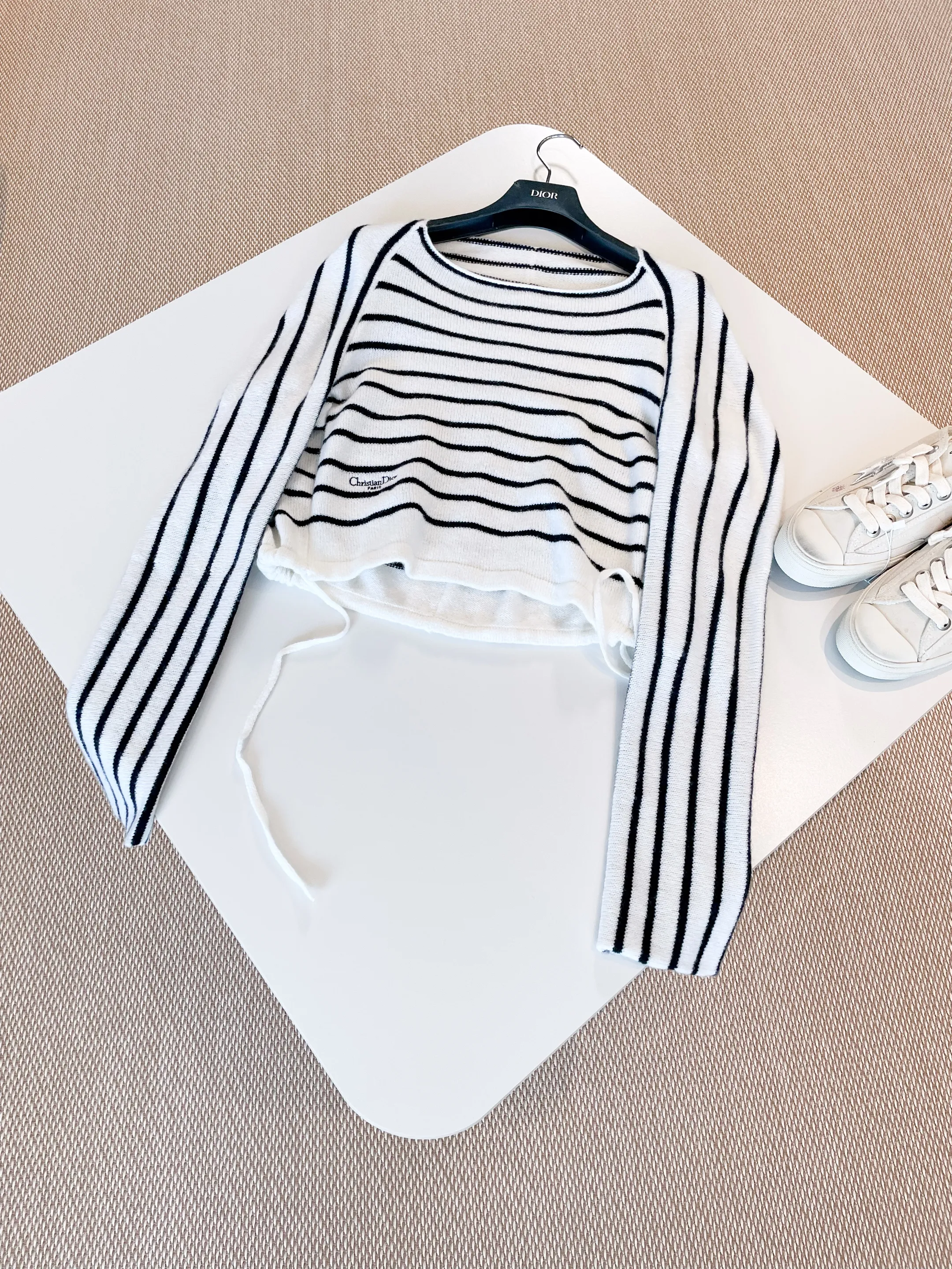 Женский укороченный джемпер Dior из мохера выполнен в элегантном стиле. Модель украшена классическим черно-белым горизонтальным полосатым принтом, вытянутыми рукавами и аккуратным круглым вырезом.