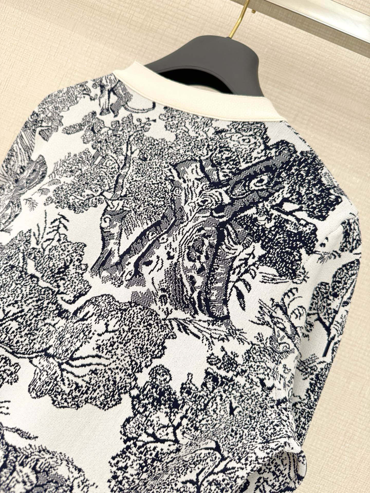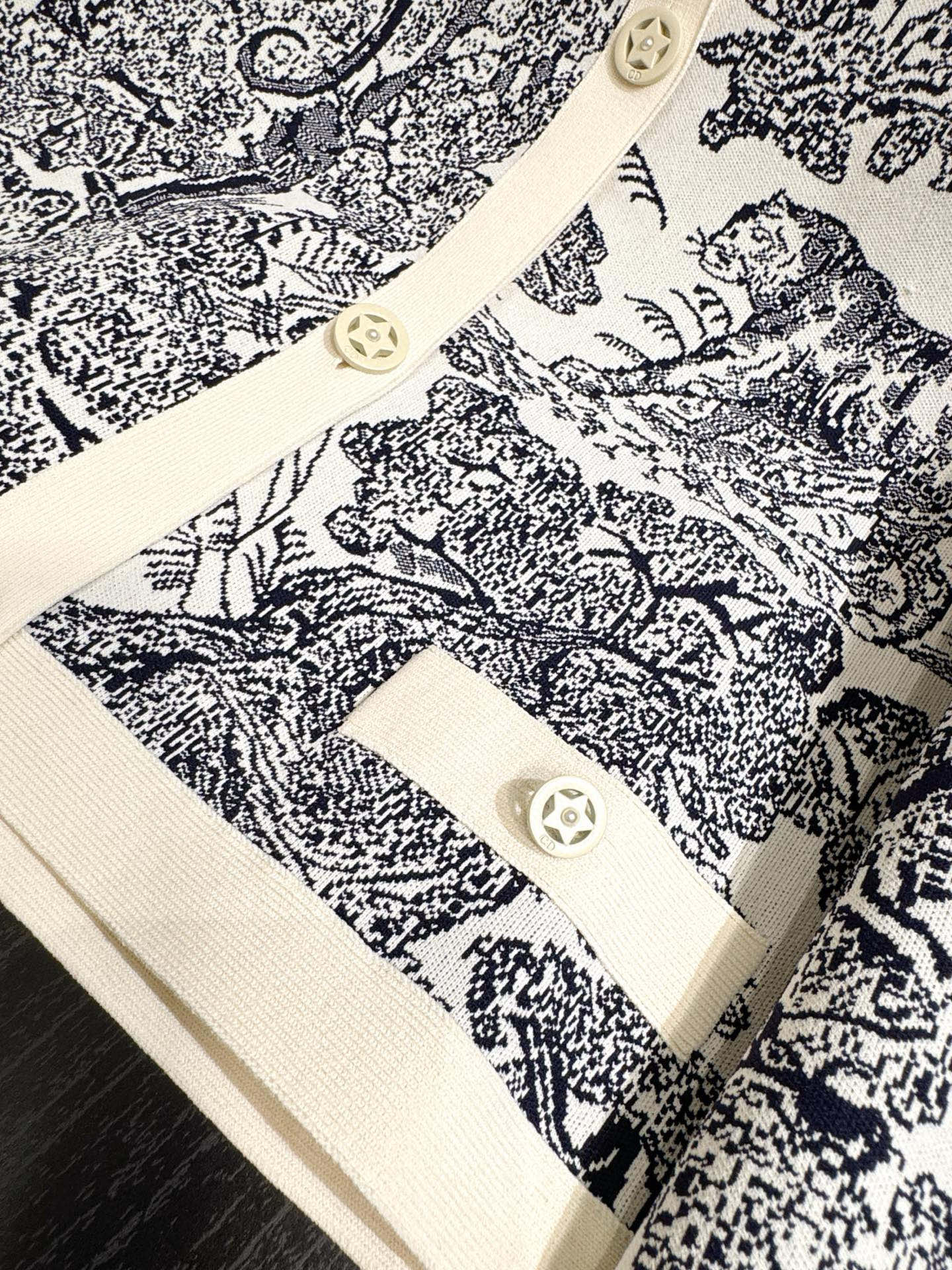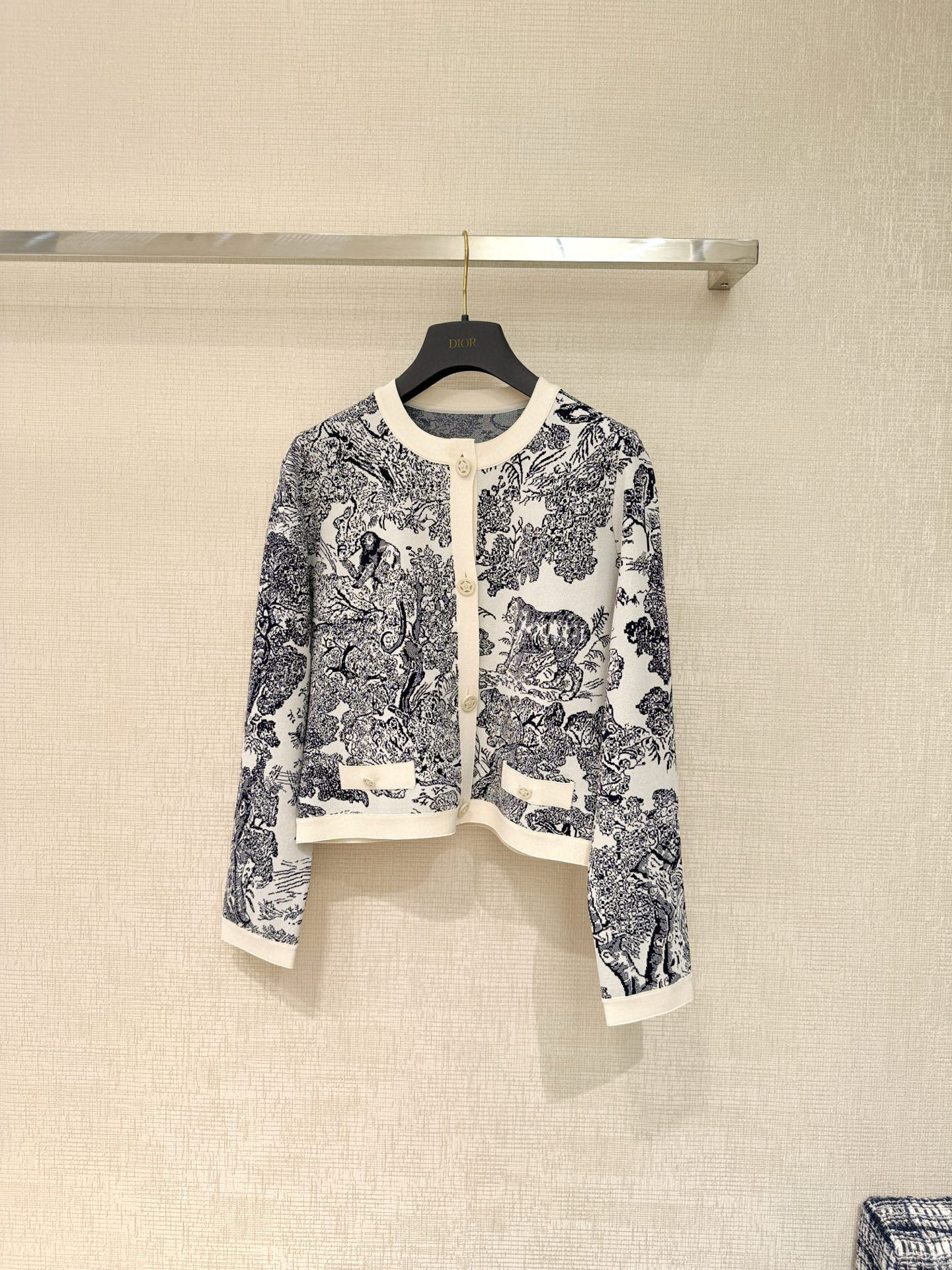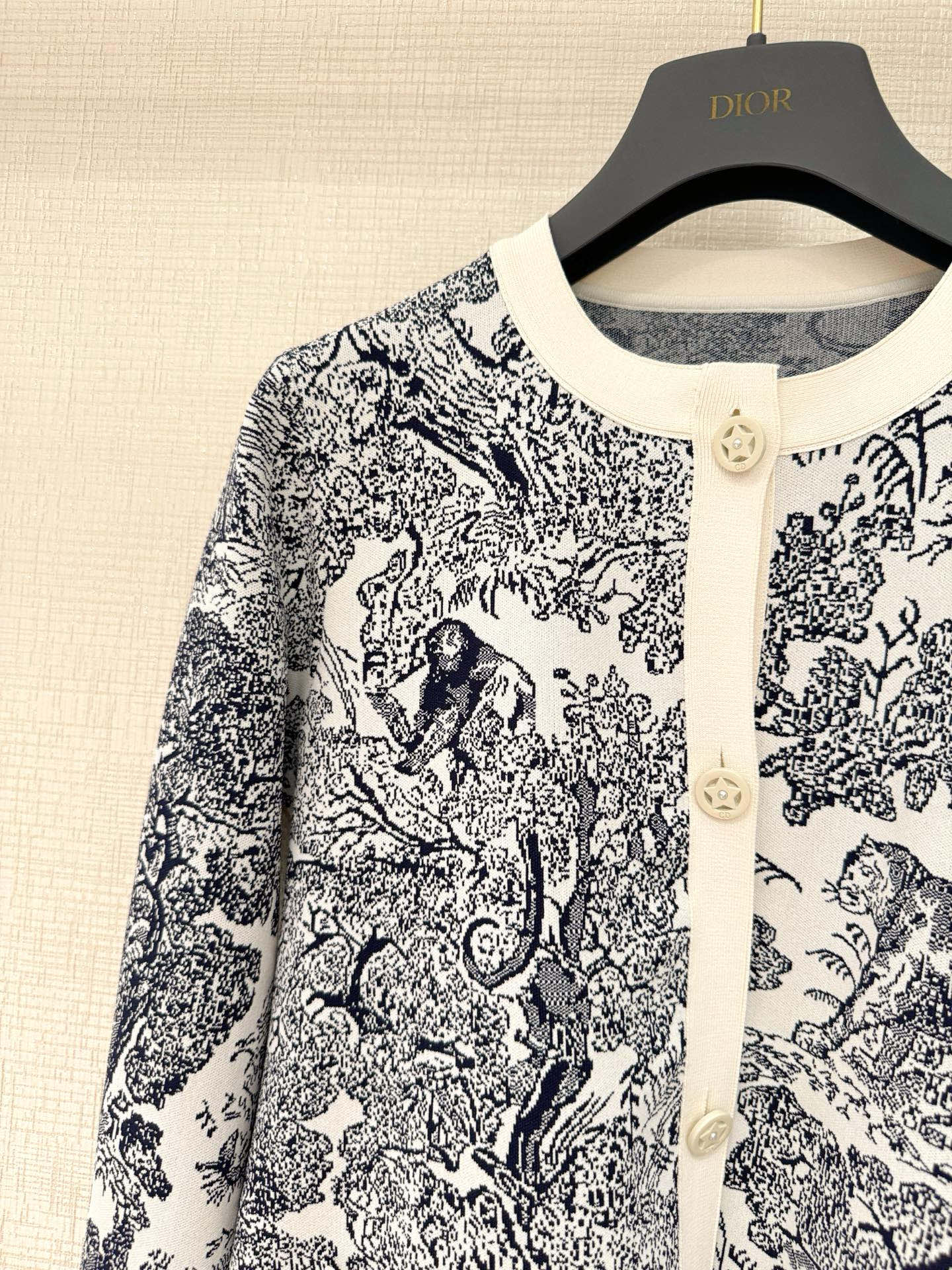 Элегантный женский кардиган от Dior, выполненный из нежного трикотажа в классической черно-белой цветовой гамме. Модель украшена культовым фирменным принтом — изысканным рисунком с изображением животных и растений. Прямой укороченный силуэт, круглый вырез, длинные рукава и аккуратная застежка на пуговицы делают кардиган универсальным вариантом как для повседневных, так и для особых случаев. Белая окантовка по краям добавляет изящества и подчеркивает роскошный стиль бренда Dior.