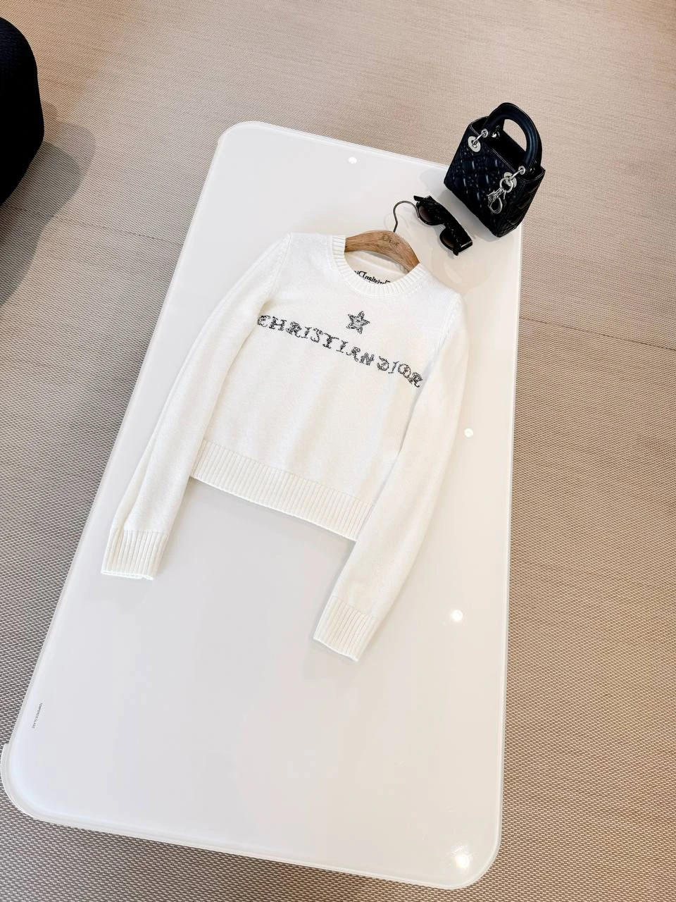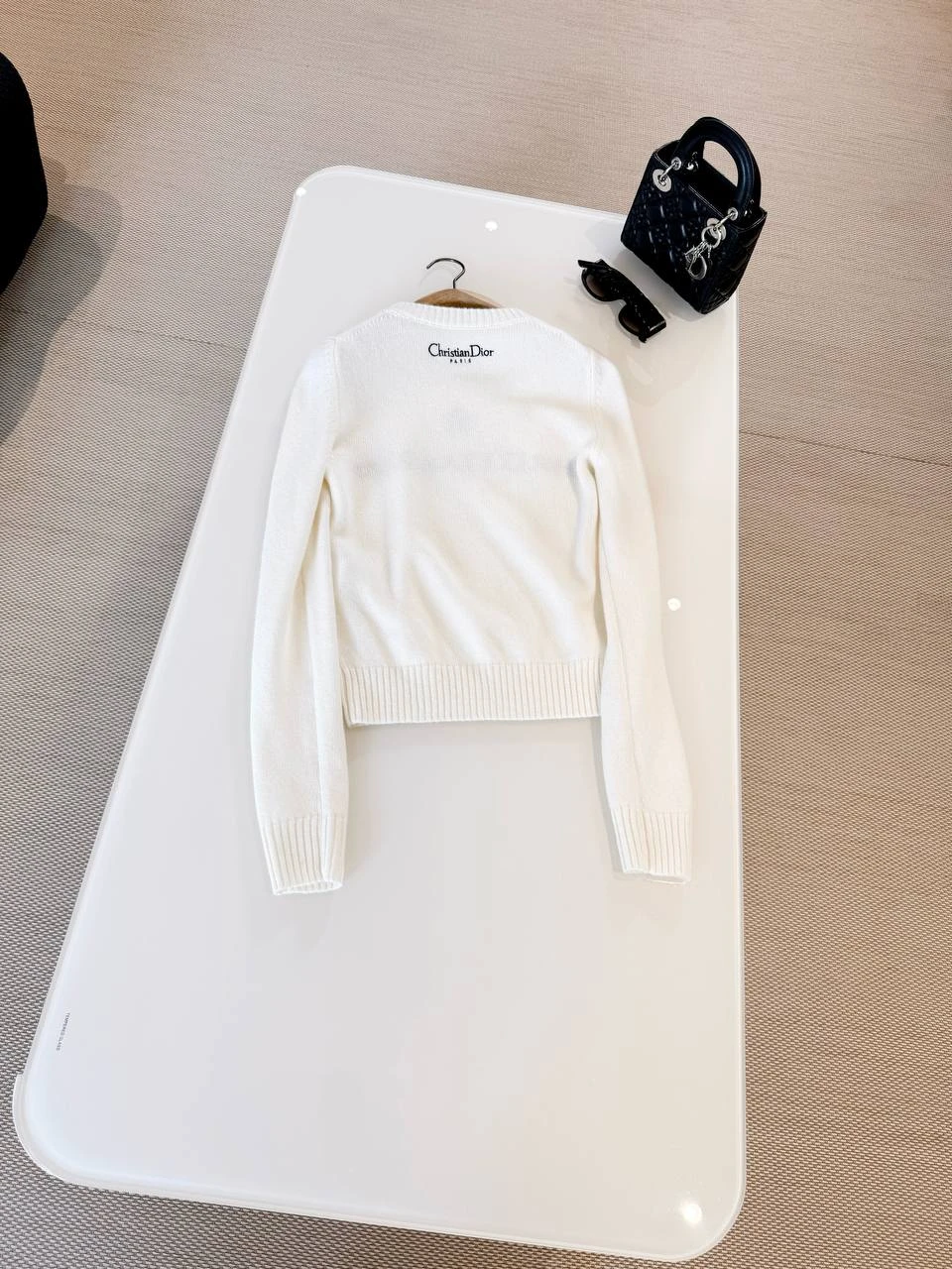 Стильный и одновременно сдержанный вязаный кардиган CHRISTIAN DIOR в нежно‑белом (айвори) оттенке. На фото — укороченная модель без видимой застёжки, с круглым вырезом и длинными рукавами; центральный декоративный акцент — контрастная надпись CHRISTIAN DIOR по линии груди и небольшая звёздочка‑мотив над логотипом.