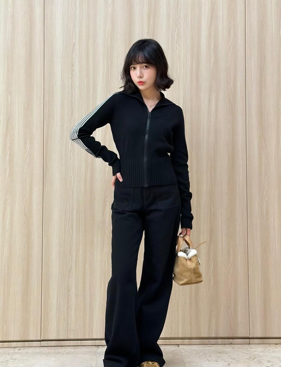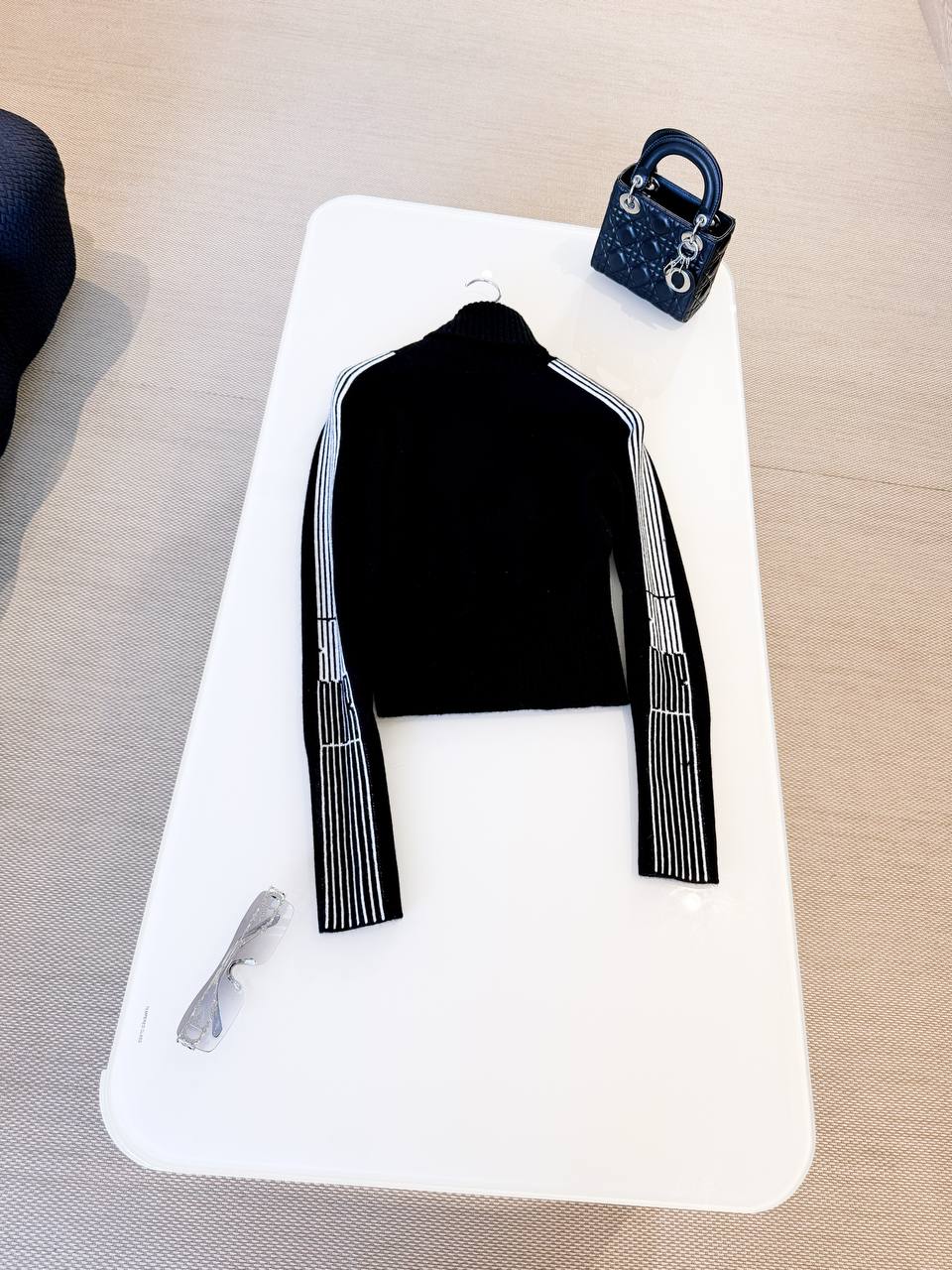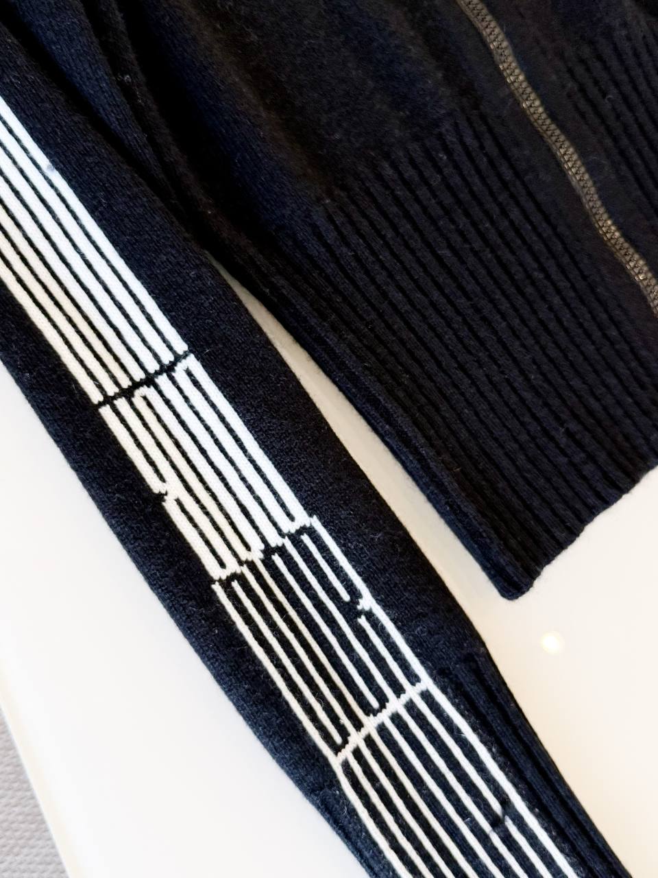 Изысканный вязаный кардиган Christian Dior в лаконичном городском стиле. Укороченный силуэт, высокий ребристый воротник‑стойка и центральная металлическая молния создают сдержанную, но выразительную форму, а контрастный графический узор вдоль рукавов придаёт модели современную динамику.