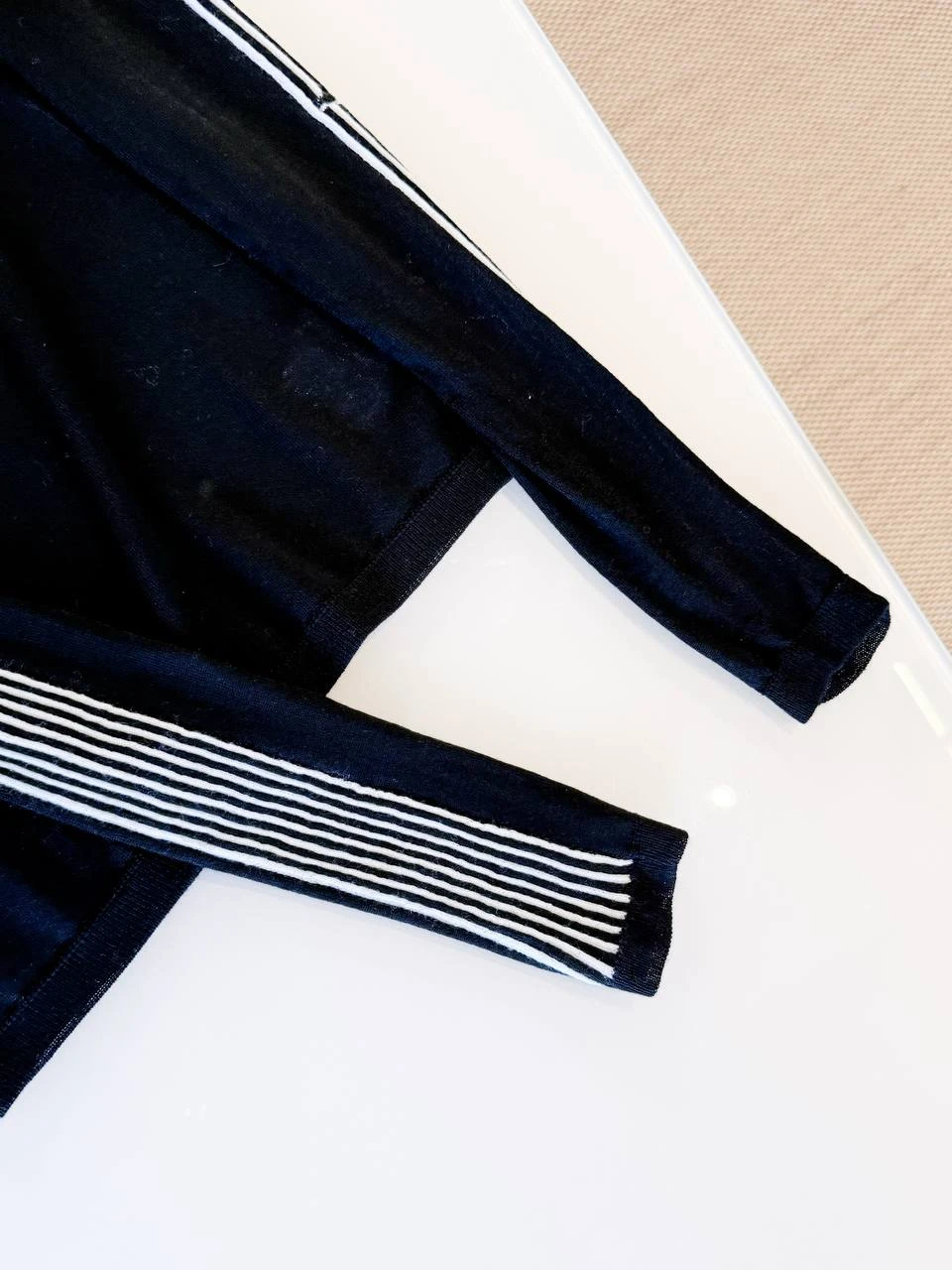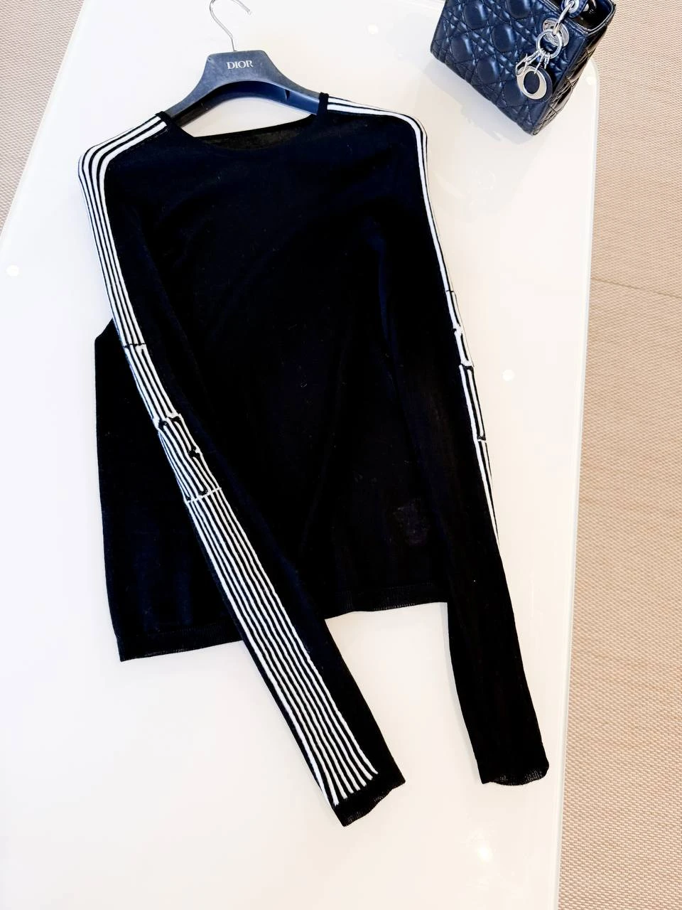 Лонгслив выполнен в глубокому чёрном цвете из мягкого тонкого трикотажа, который мягко облегает силуэт и обеспечивает комфортную посадку. Классическая круглая горловина и длинные рукава создают строгую, в то же время женственную форму. Главная декоративная деталь — контрастные белые полосы, тянущиеся от плеча до манжеты; полосы оформлены в виде тонкого графического узора, придающего модели современный, лаконичный характер. Лёгкая структура ткани делает изделие идеальным для ношения под жакет или как самостоятельную вещь в прохладную погоду.