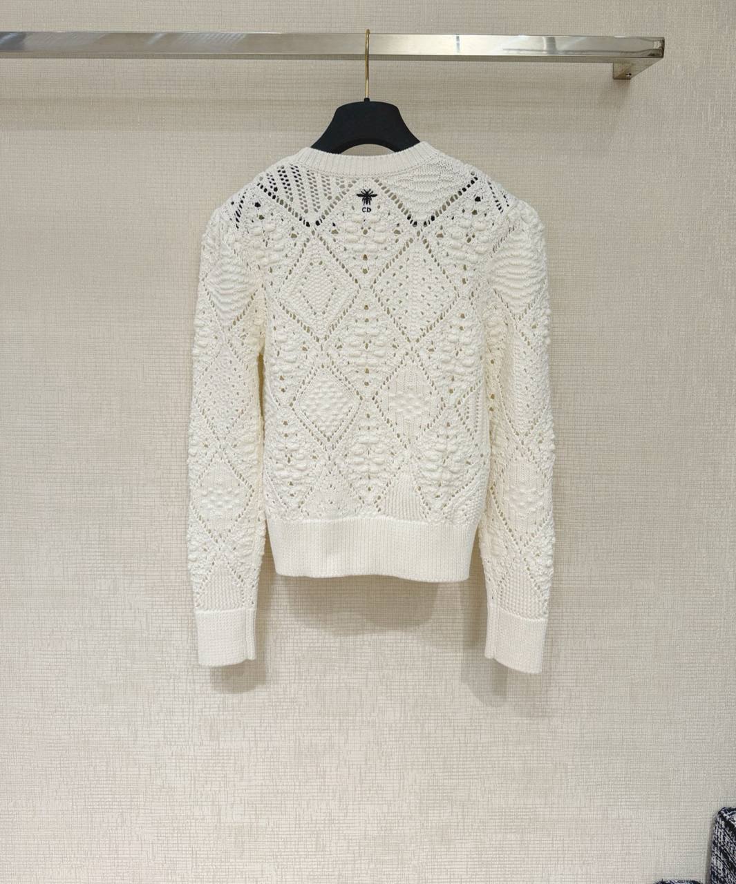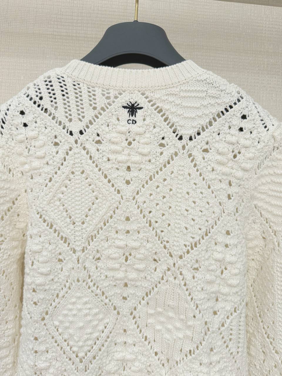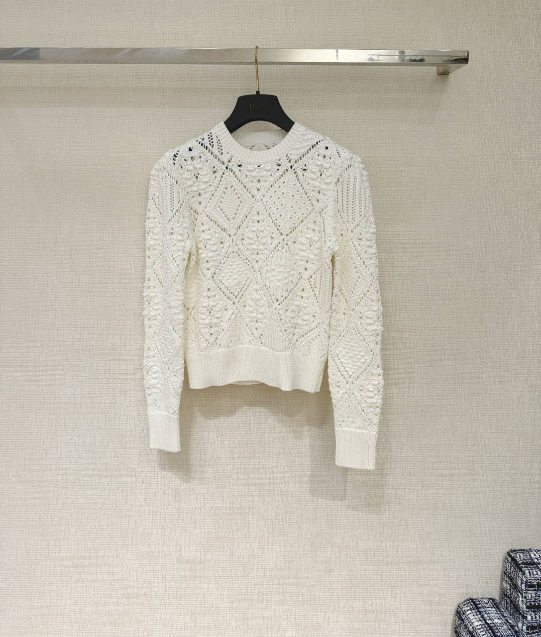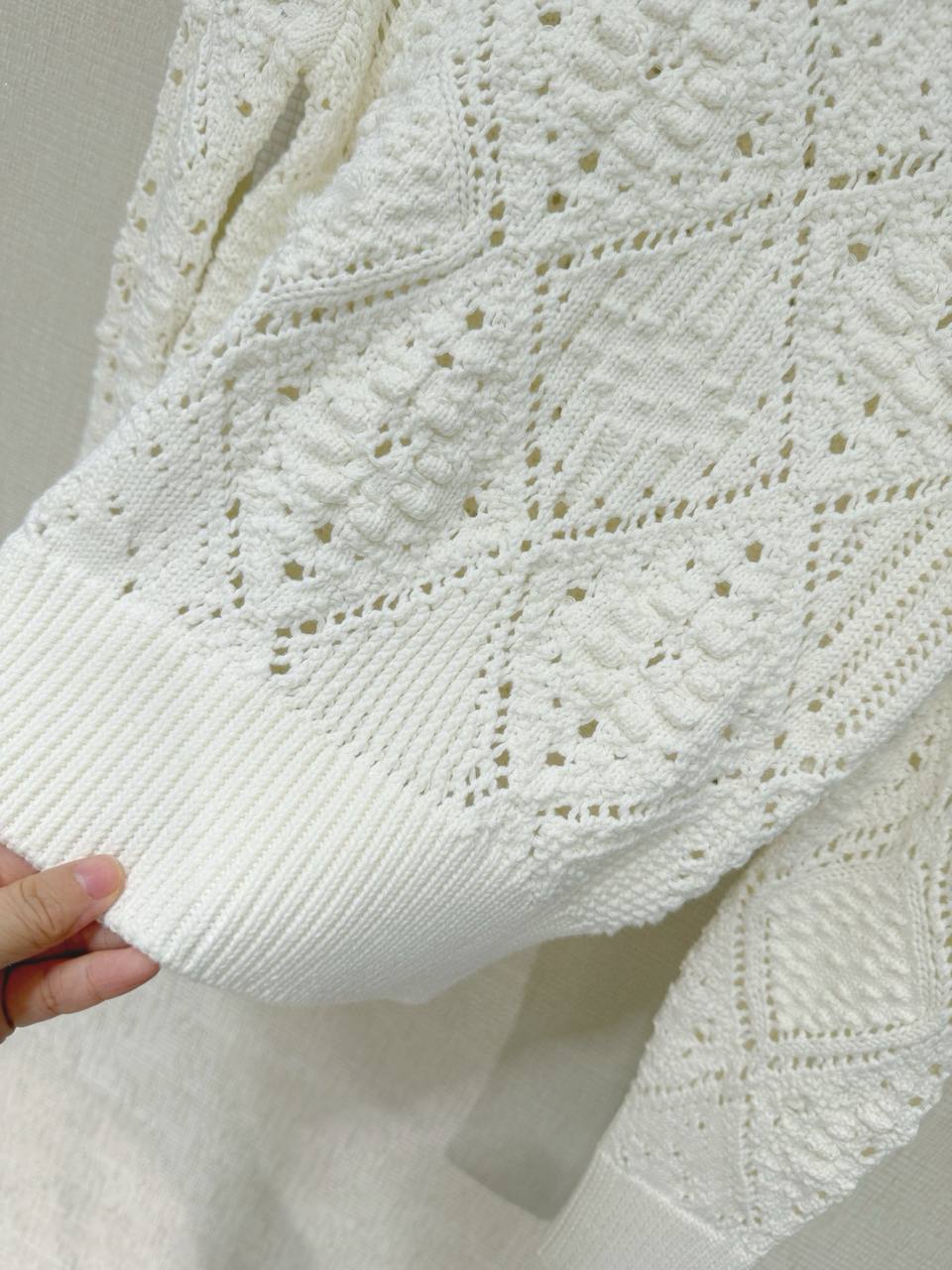 Изысканный свитер кремово‑белого оттенка с тонкой открытой вязкой и выразительной текстурой. Модель выполнена в классическом силуэте с круглым вырезом, длинными рукавами и плотными ребристыми манжетами и поясом, что придаёт изделию аккуратную посадку по фигуре. Главный декоративный акцент — геометрический ромбовидный ажурный узор, чередующийся с объёмными «шишечками» и рельефными элементами, создающими игру света и тени и лёгкую фактурную глубину.