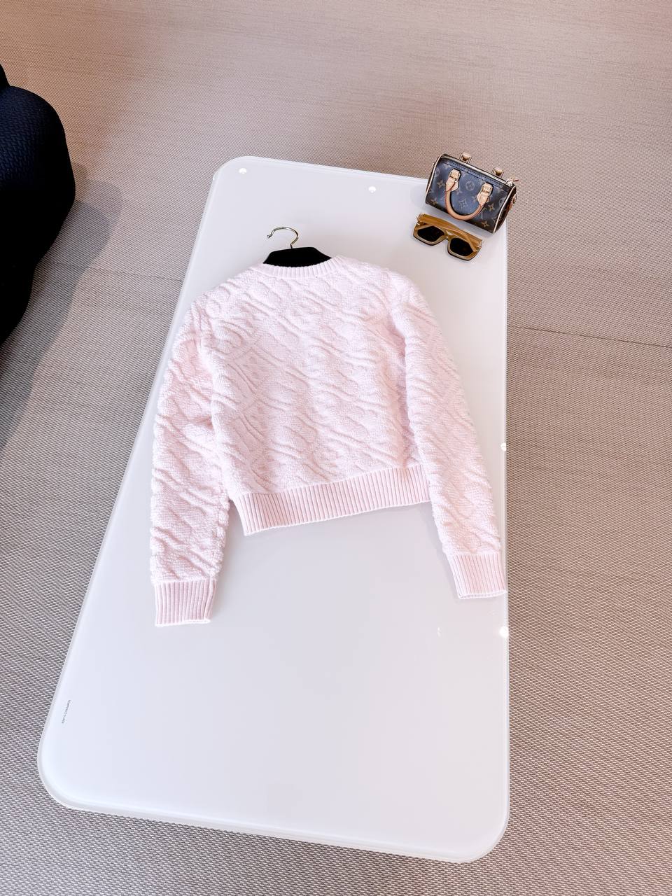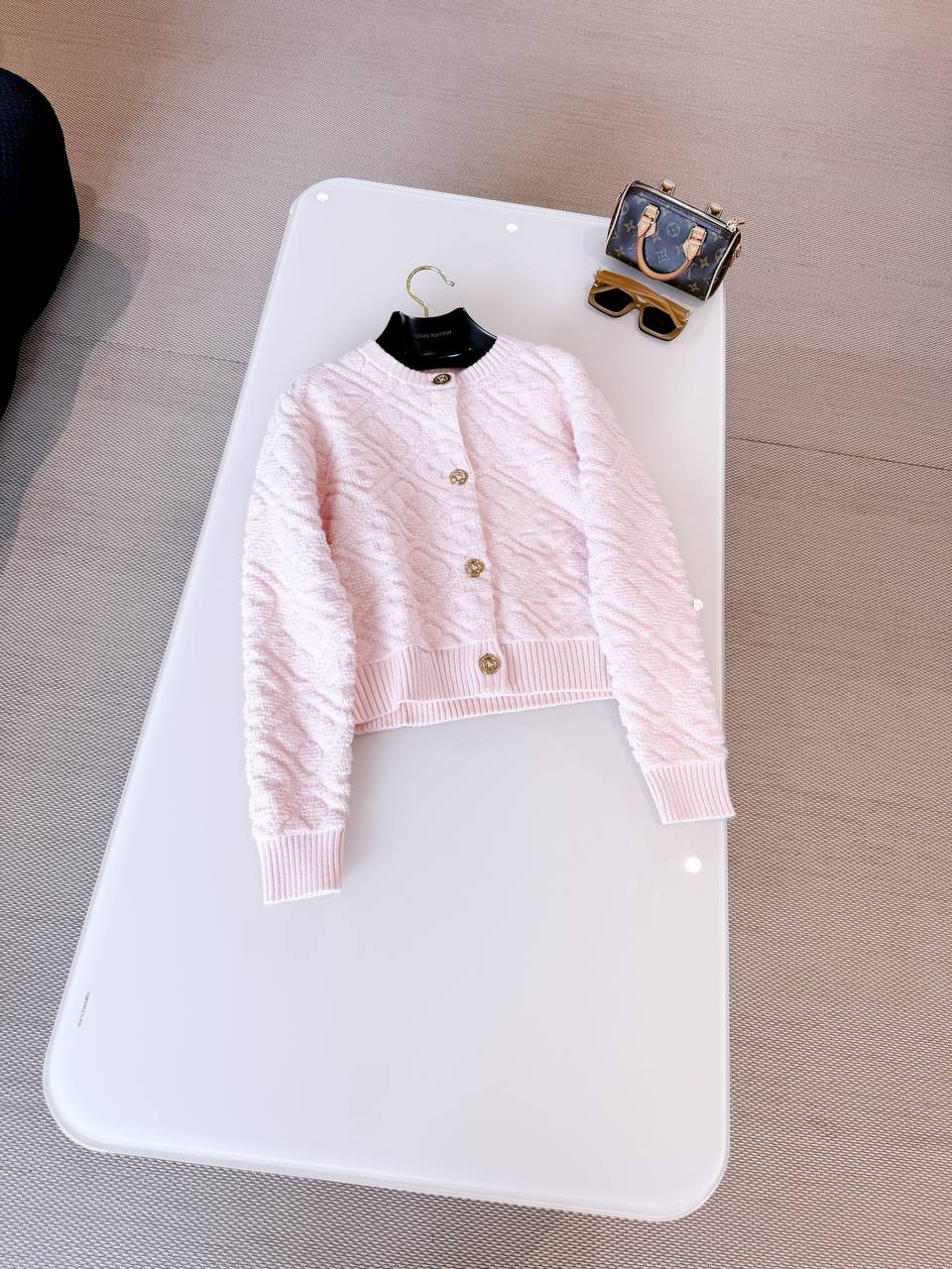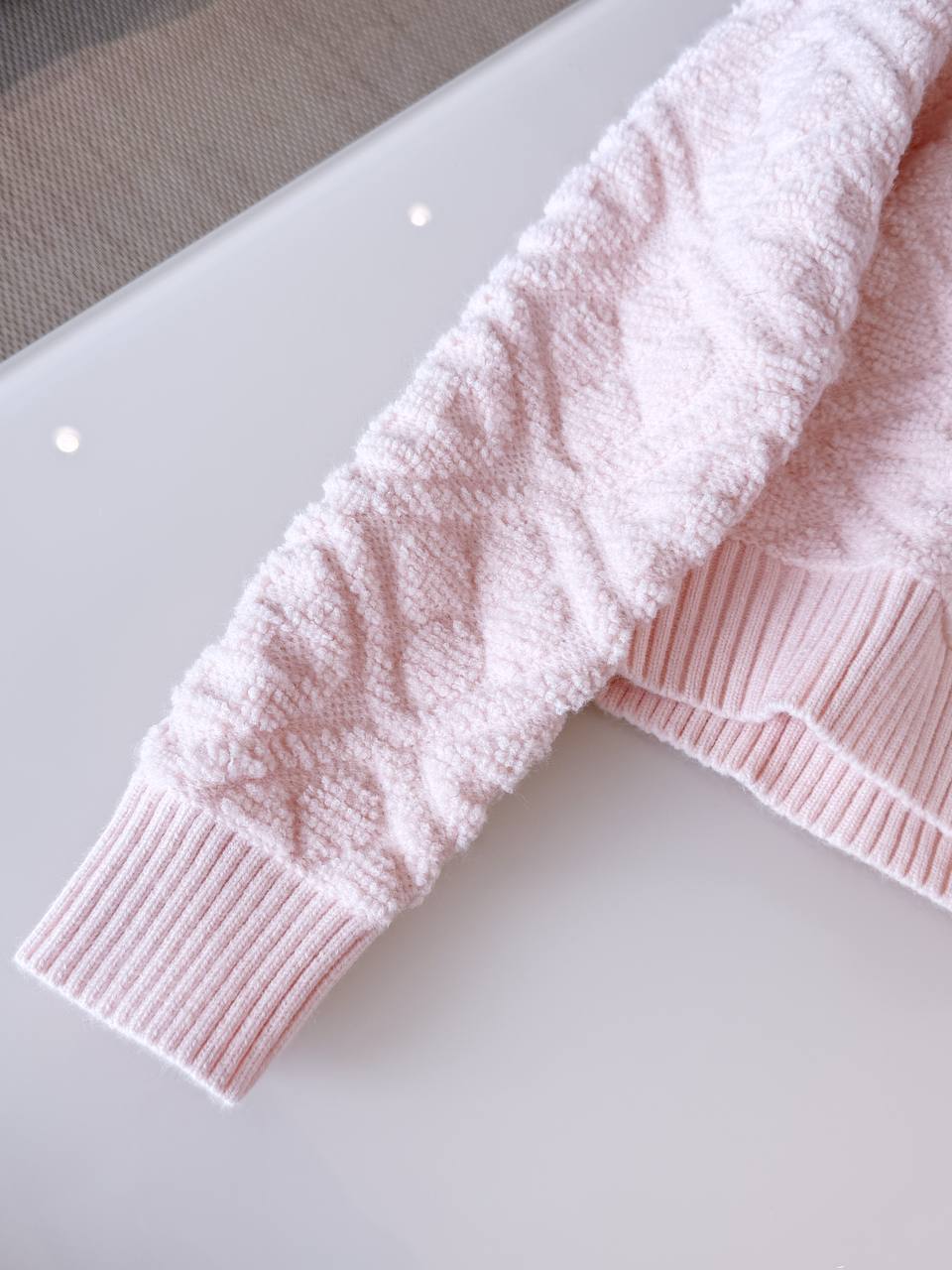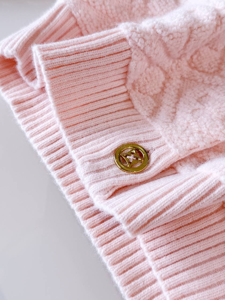 Элегантный укороченный кардиган LOUIS VUITTON в нежно‑розовом оттенке, выполненный из мягкого фактурного трикотажа. Лаконичный круглый вырез, рельефная узорная вязка и золотистые пуговицы с фирменной гравировкой придают изделию утончённый и современный характер.