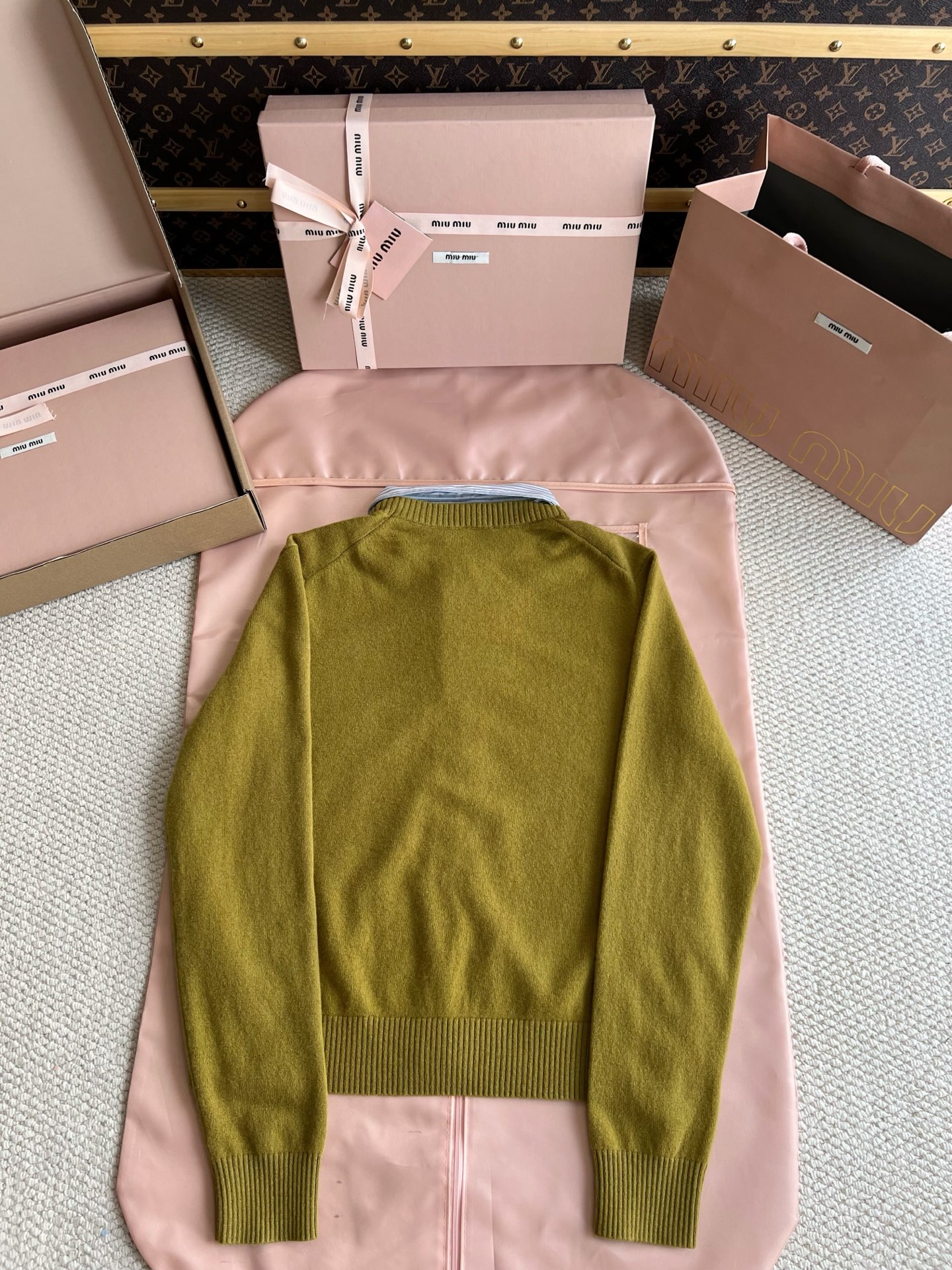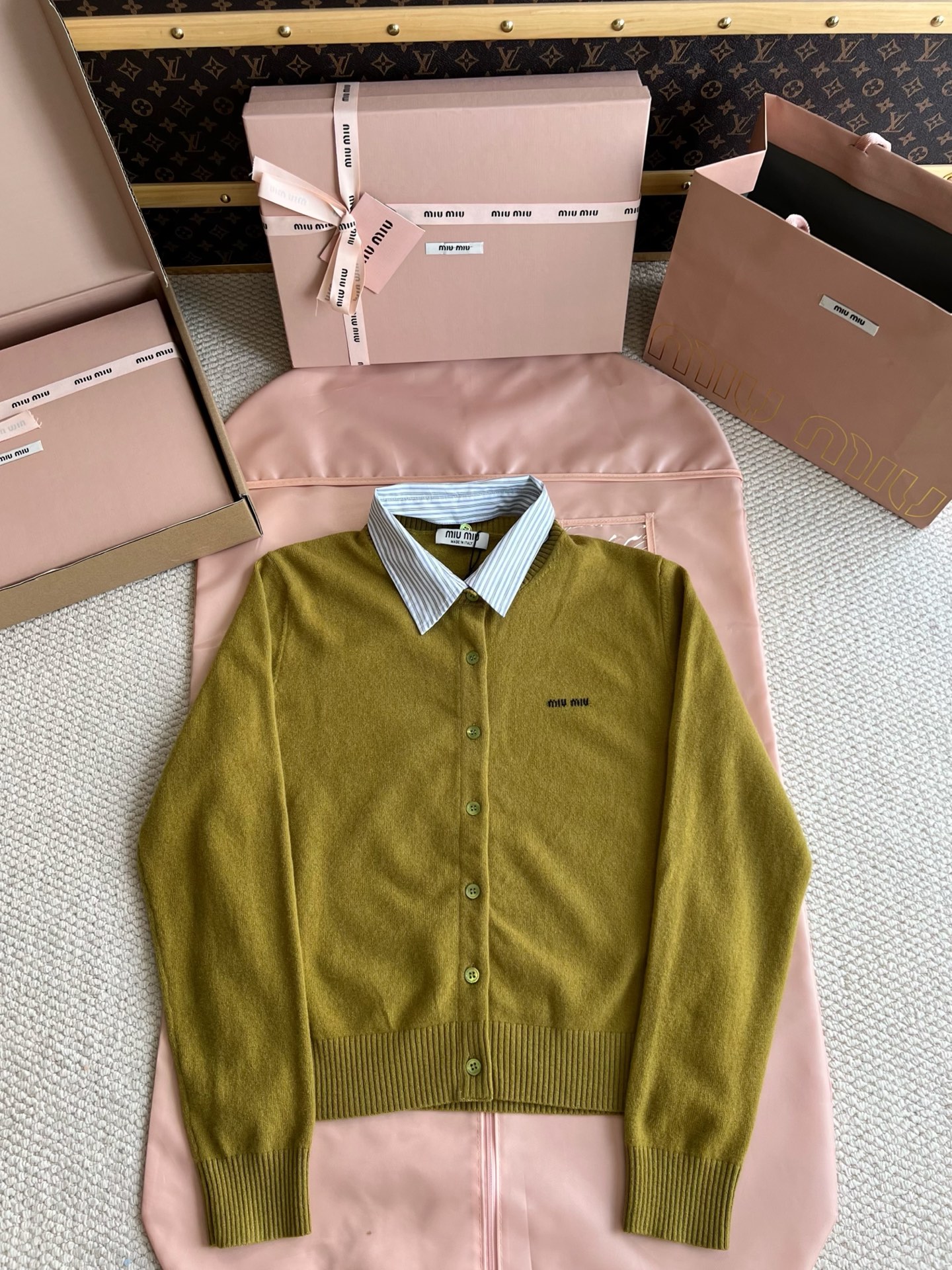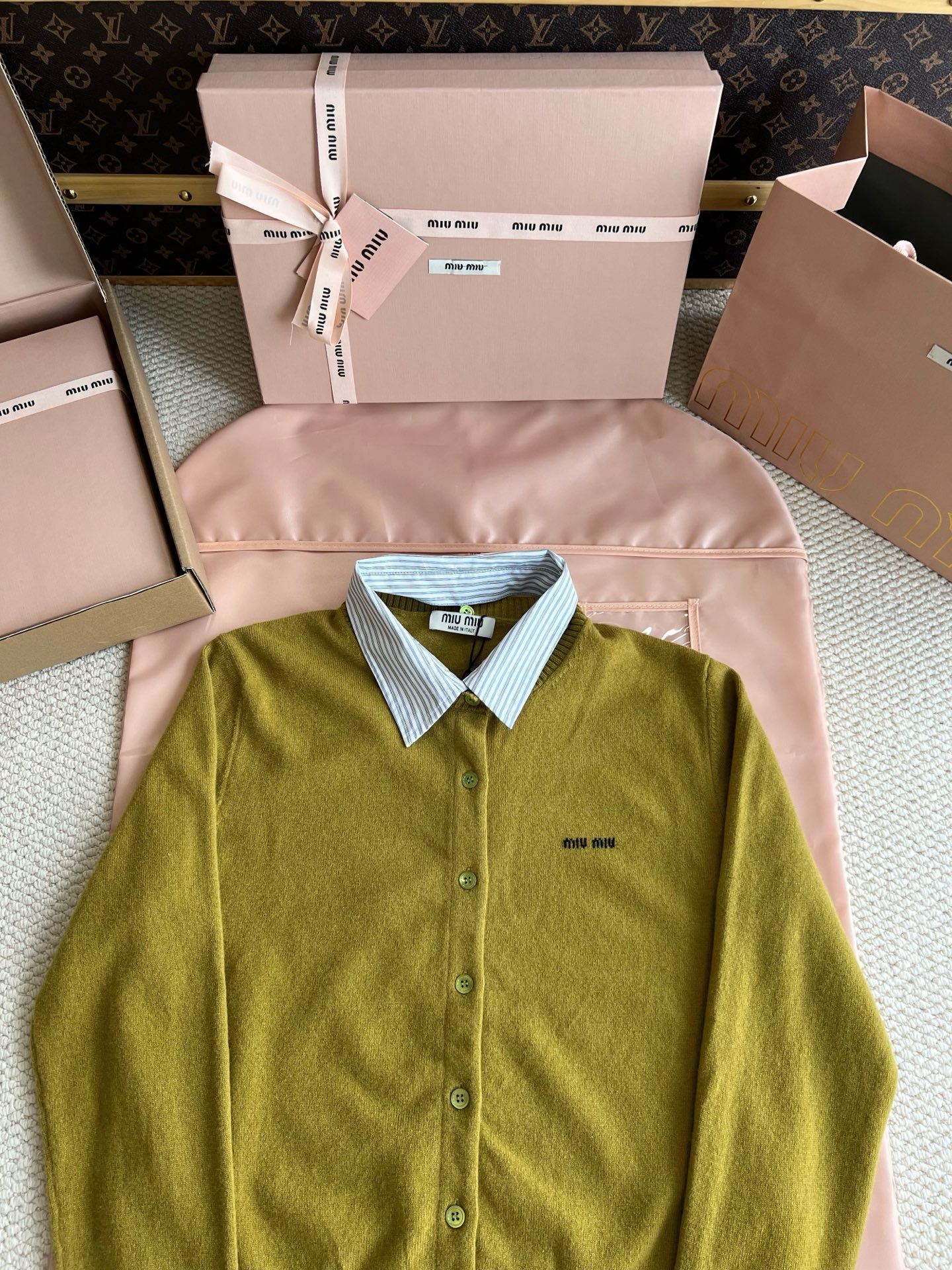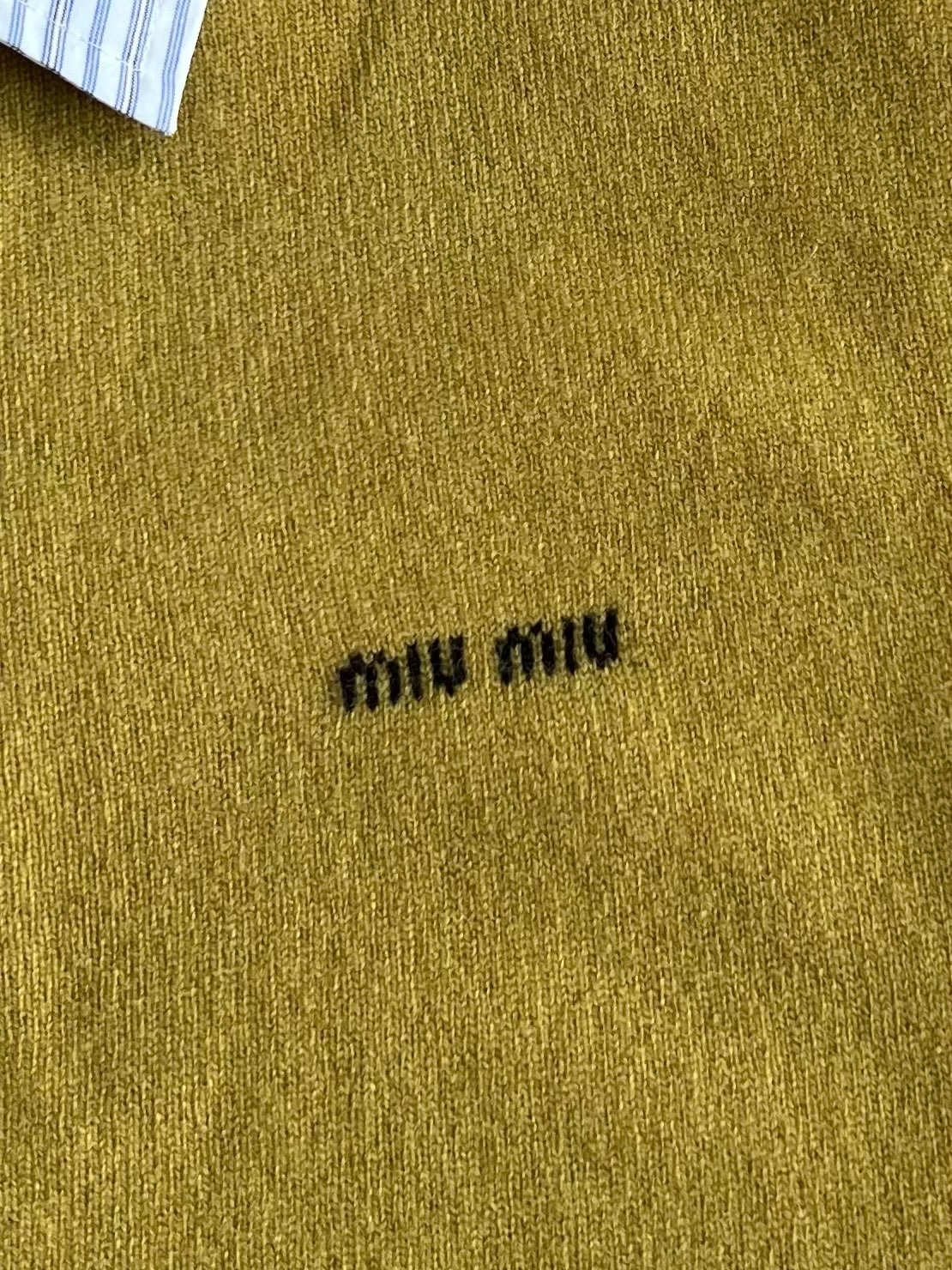 Стильный джемпер от MIU MIU выполнен из мягкой шерстяной ткани теплого коричневого оттенка. Модель имеет классический крой с длинными рукавами и застёжкой на пуговицы по всей длине. Уникальная деталь — встроенный воротник-рубашка голубого цвета, создающий эффект многослойности и придающий образу элегантность. На груди — лаконичный логотип MIU MIU, подчеркивающий бренд. Джемпер отлично подойдет для создания современных, утончённых образов как для офиса, так и для прогулок по городу.